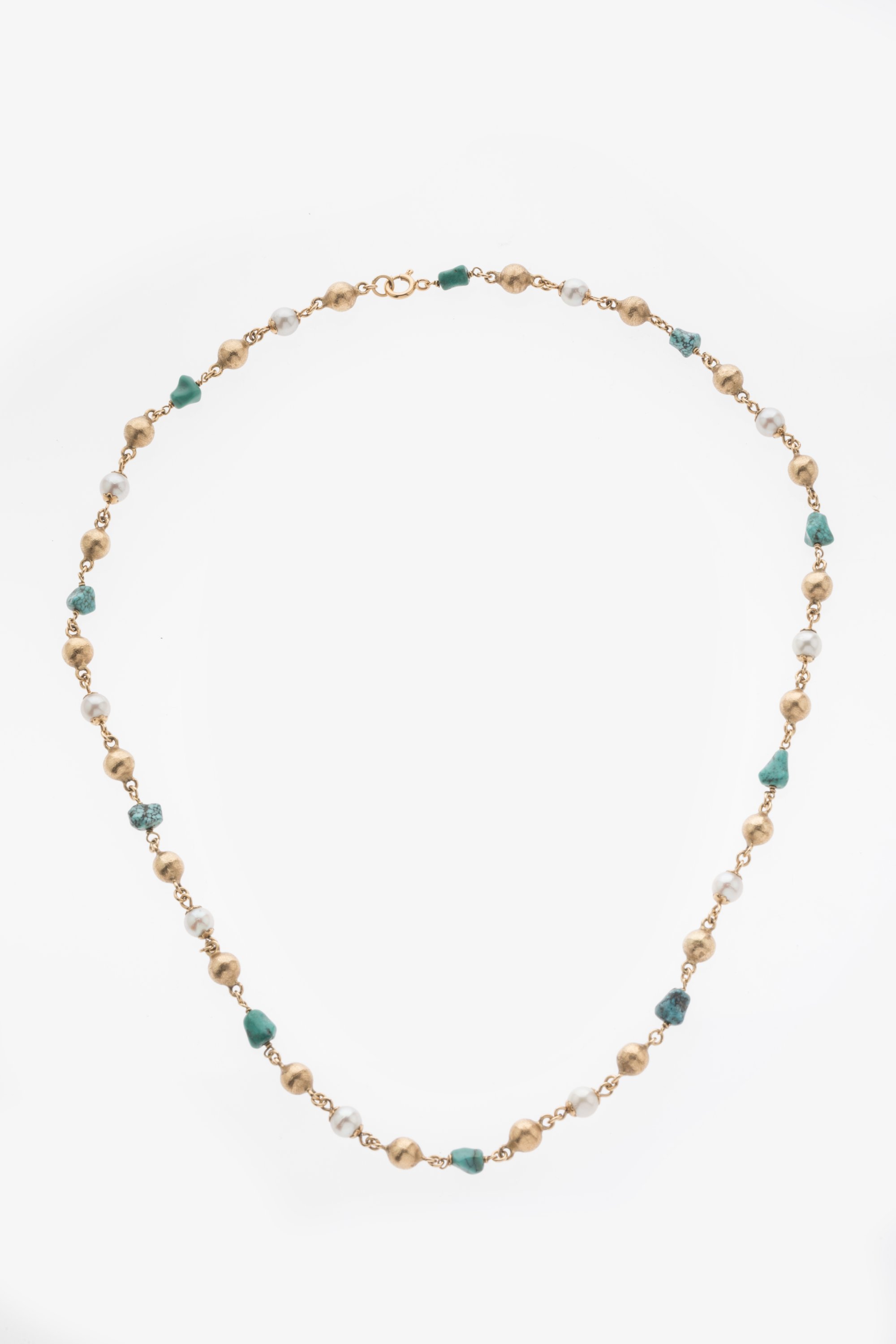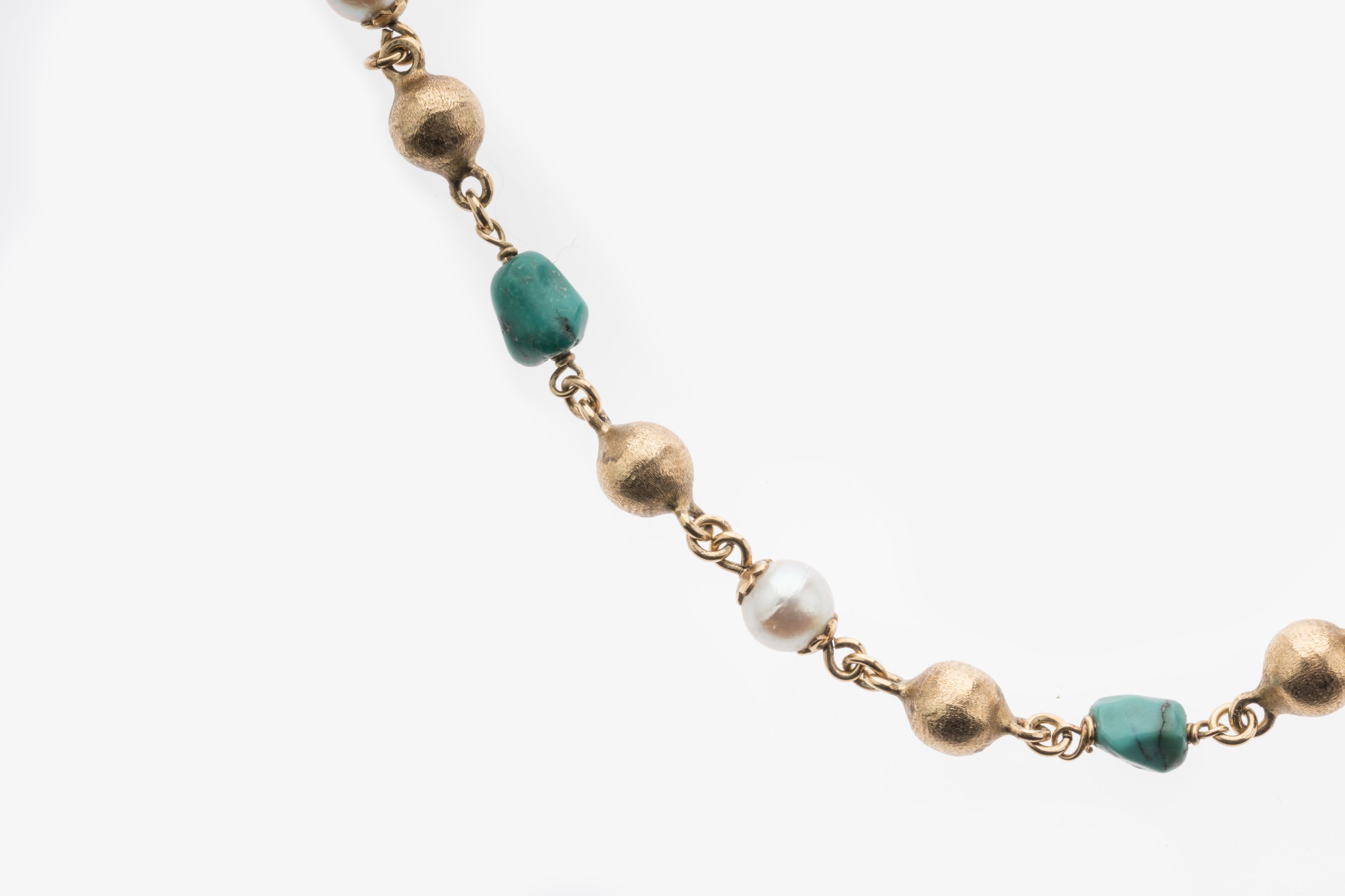 COLLIER en mailles alternées d'or jaune 750 millièmes, perles et turquoises.