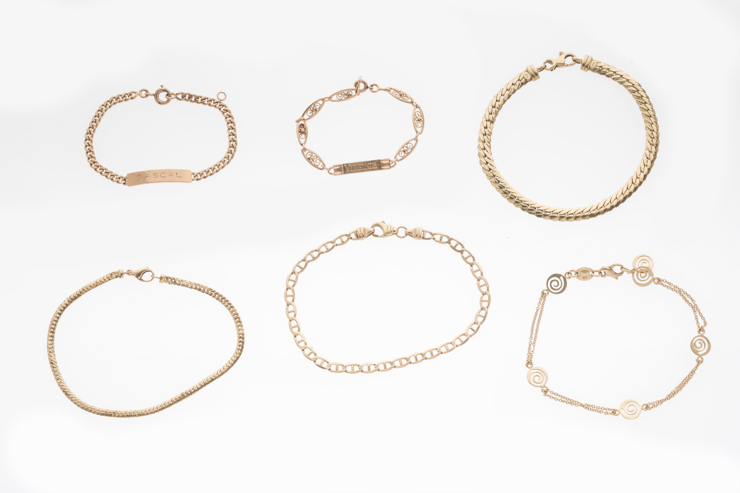 RÉUNION de six bracelets en or jaune 750 millièmes.
