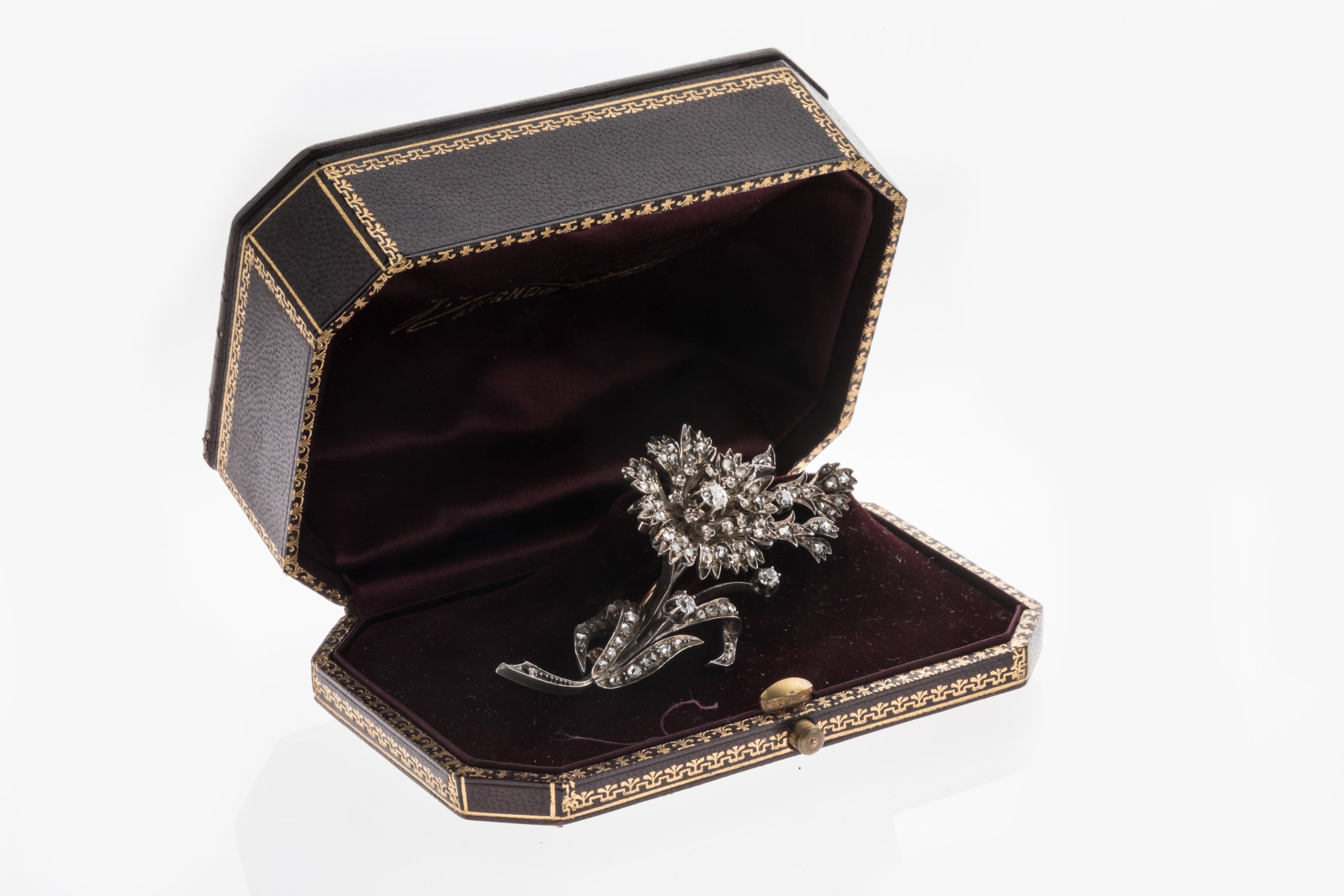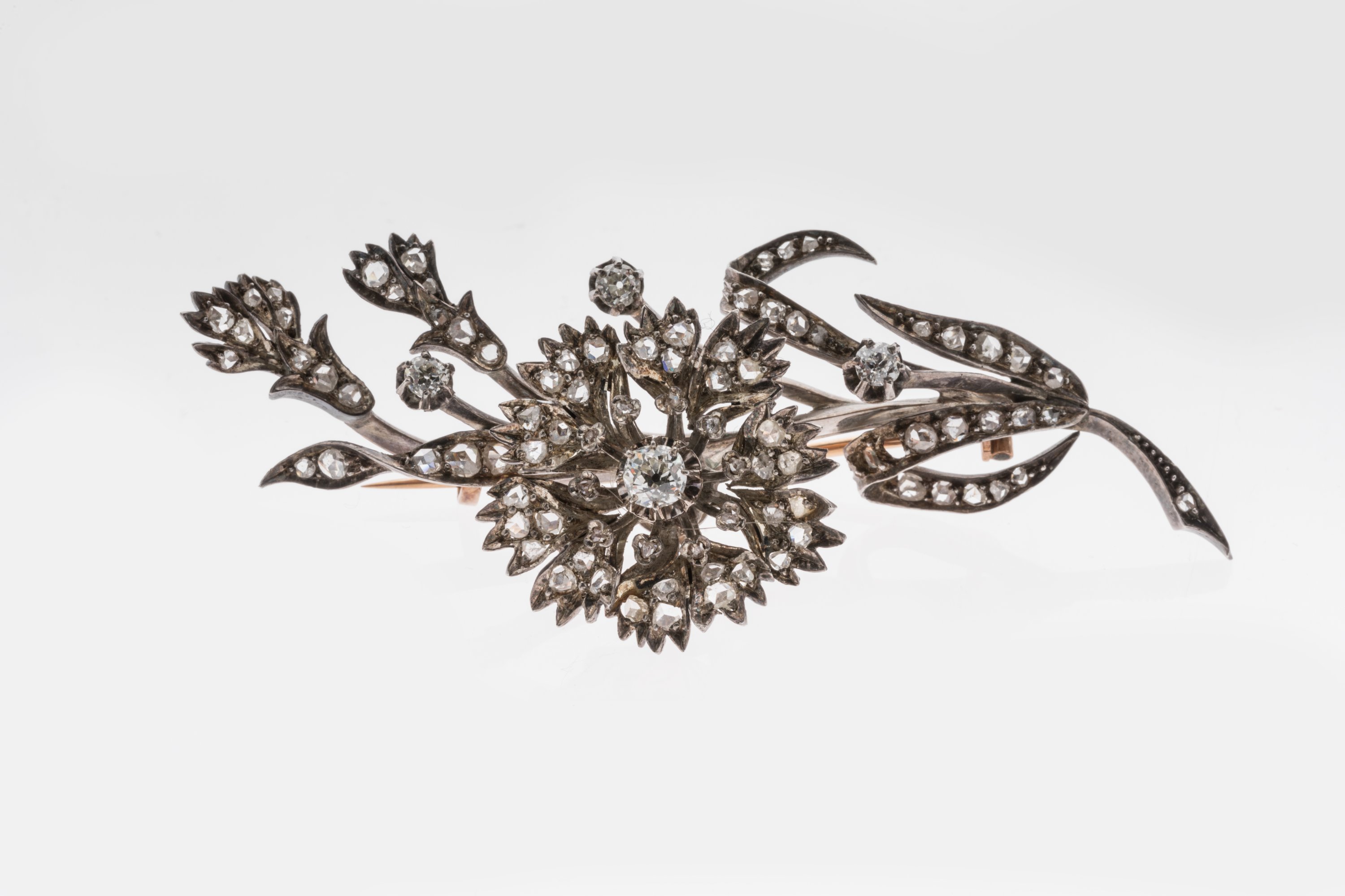 BROCHE FLEUR TREMBLEUSE en argent, ornée de DIAMANTS de taille ancienne et centrée au pistil d'un DIAMANT plus important. Épingle en or jaune 750 millièmes.