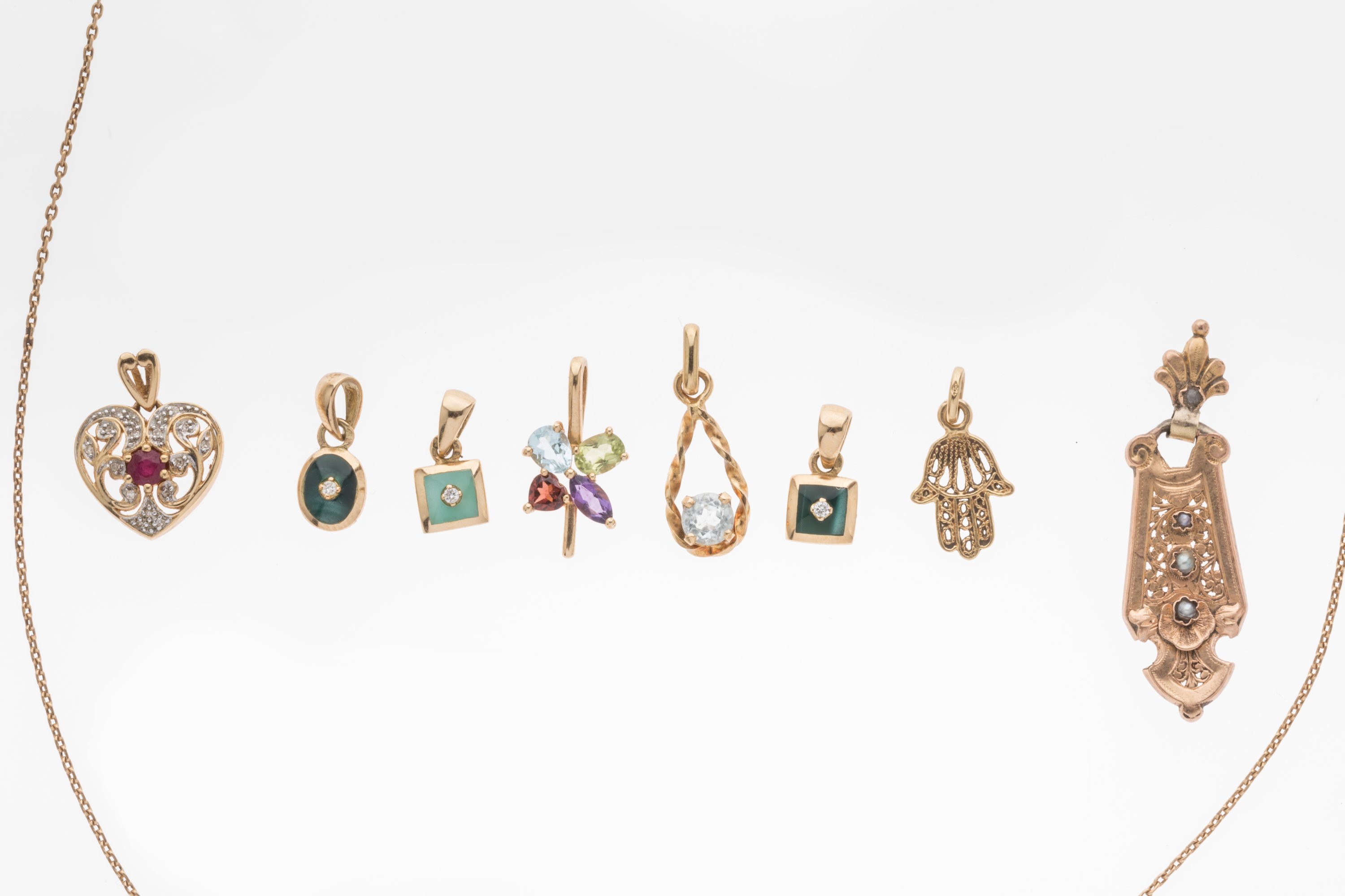 RÉUNION de BIJOUX en or jaune 750 millièmes, comprenant NEUF PENDENTIFS et DEUX CHAÎNES. Les pendentifs ornés de pierres blanches et de couleur ou de semences de perles.