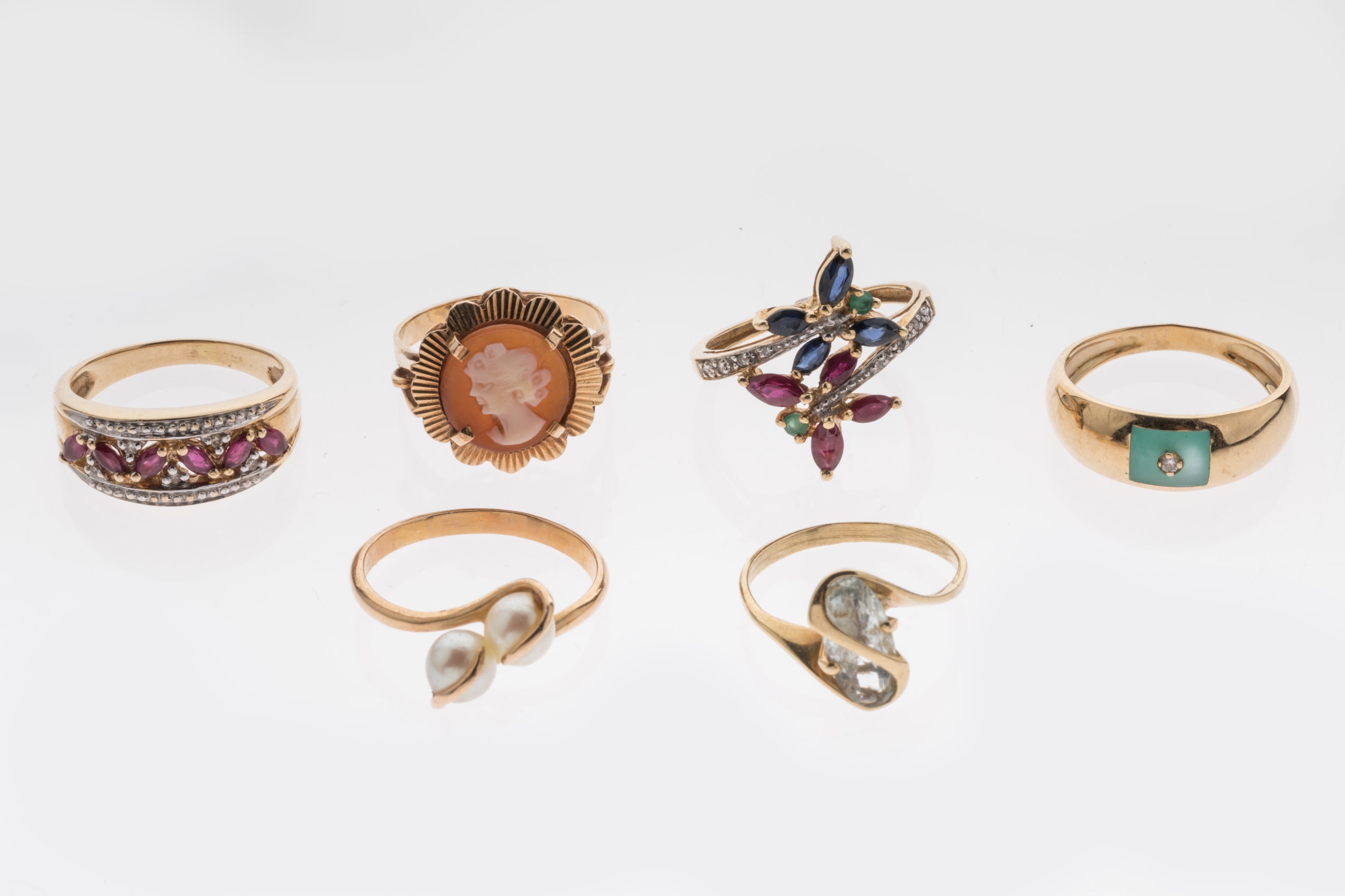 RÉUNION de SIX BAGUES en or jaune, ornées de pierres blanches, de couleurs, de perles et d'un camée.