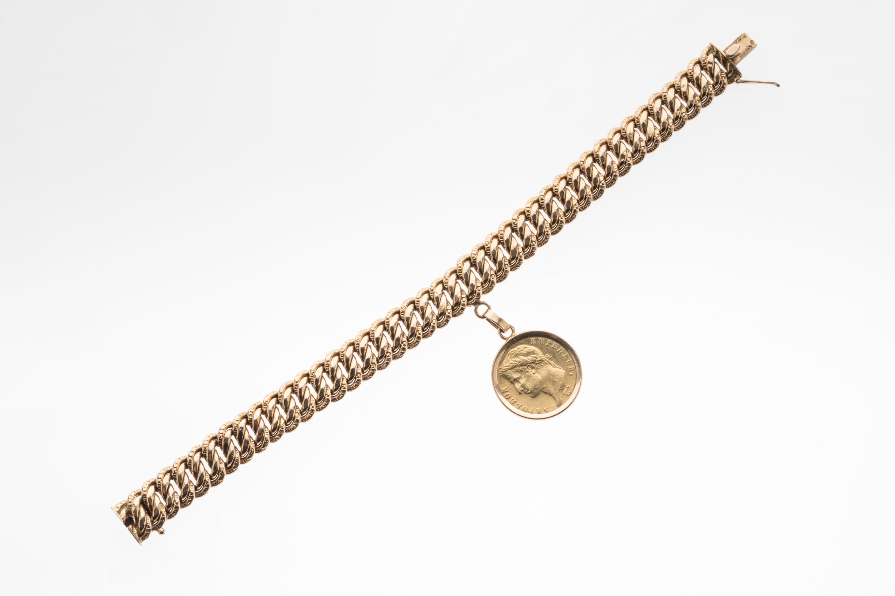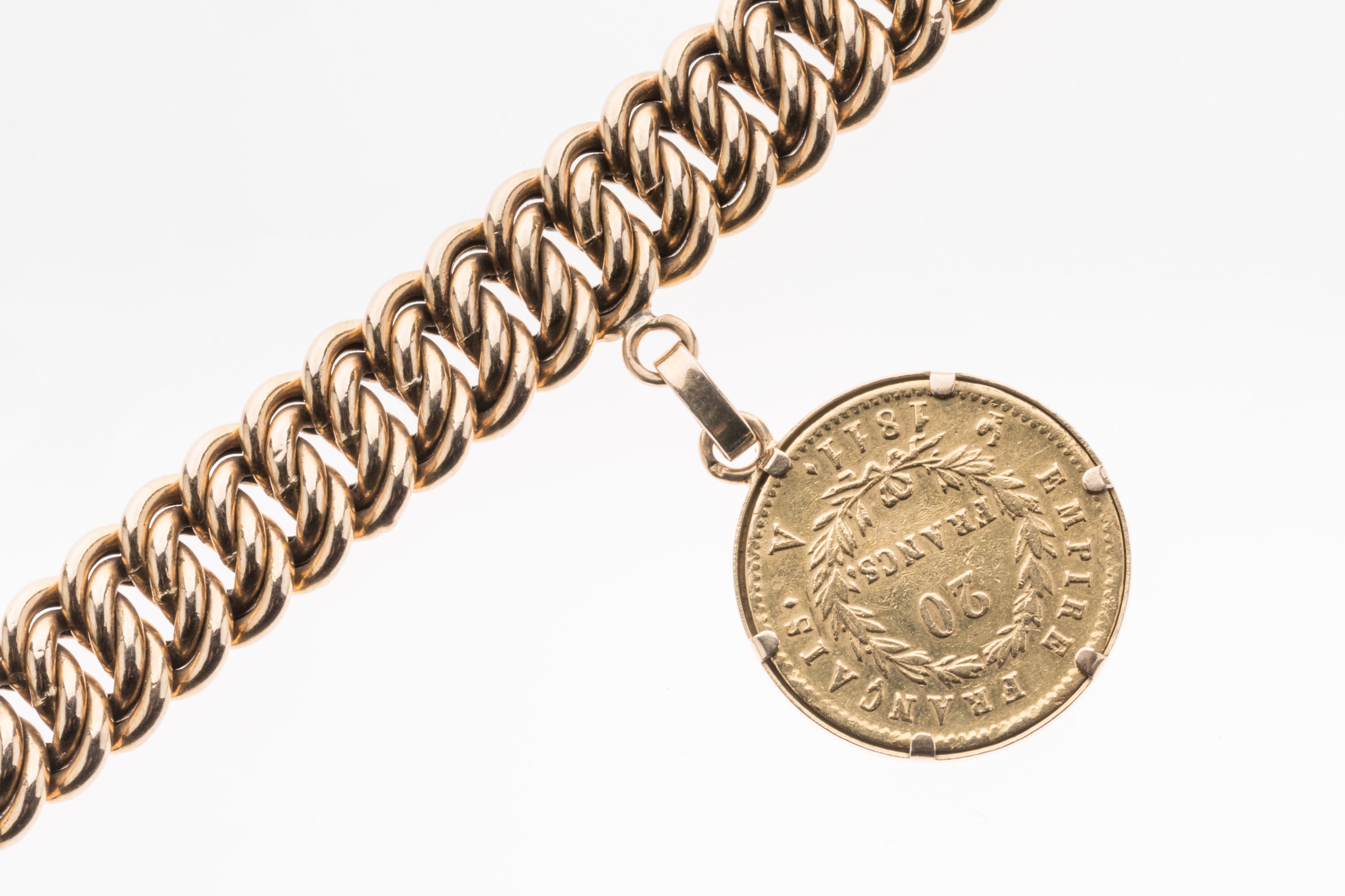 BRACELET en maille torsadée en or jaune 750 millièmes. Il retient une pièce de 20 francs or Napoléon lauré de 1811.