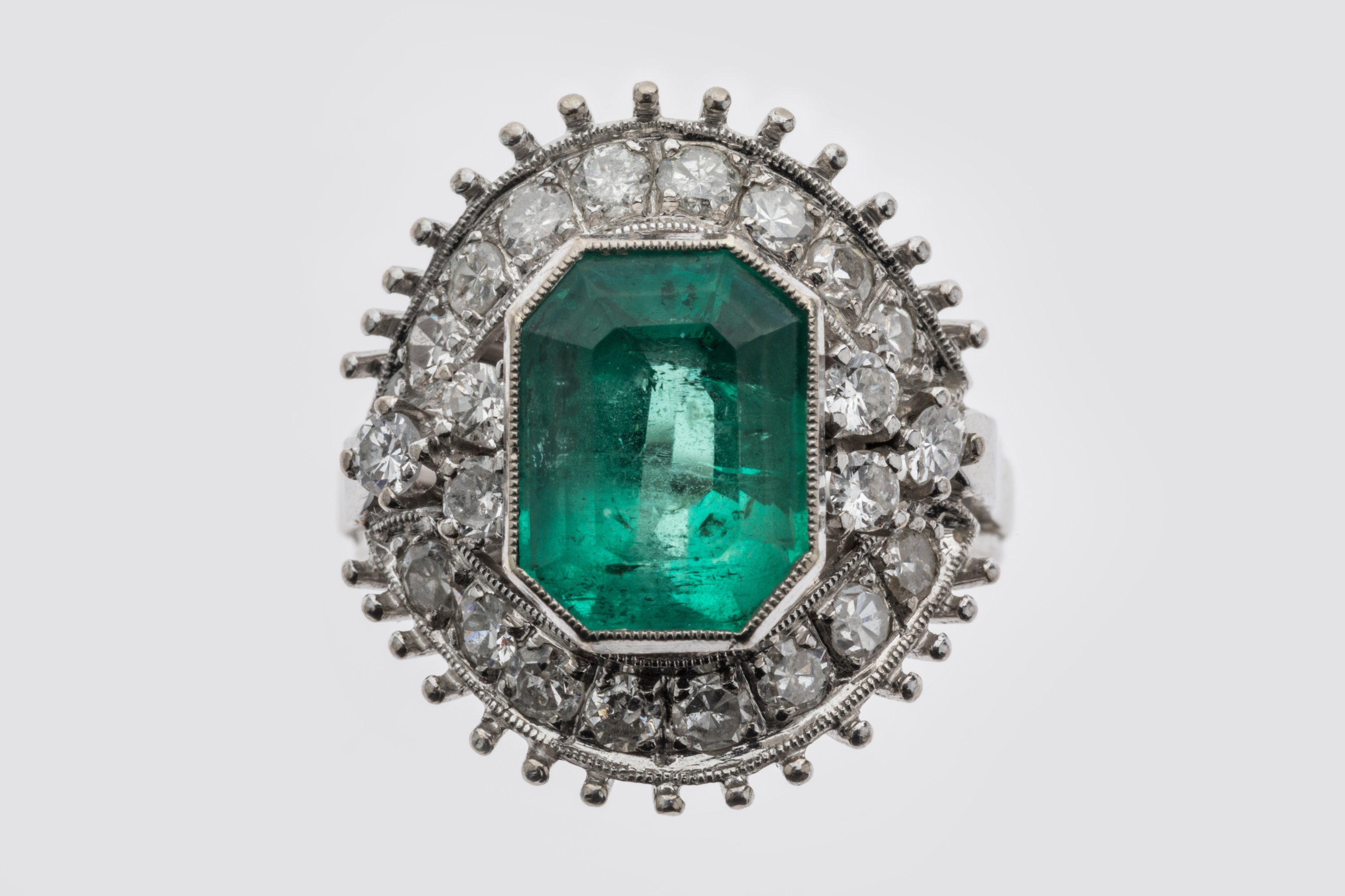 BAGUE en or gris 750 millièmes ornée au centre d'une ÉMERAUDE rectangulaire à pans coupés serti clos dans un entourage de DIAMANTS ronds taillés en huit-huit et de taille brillant.