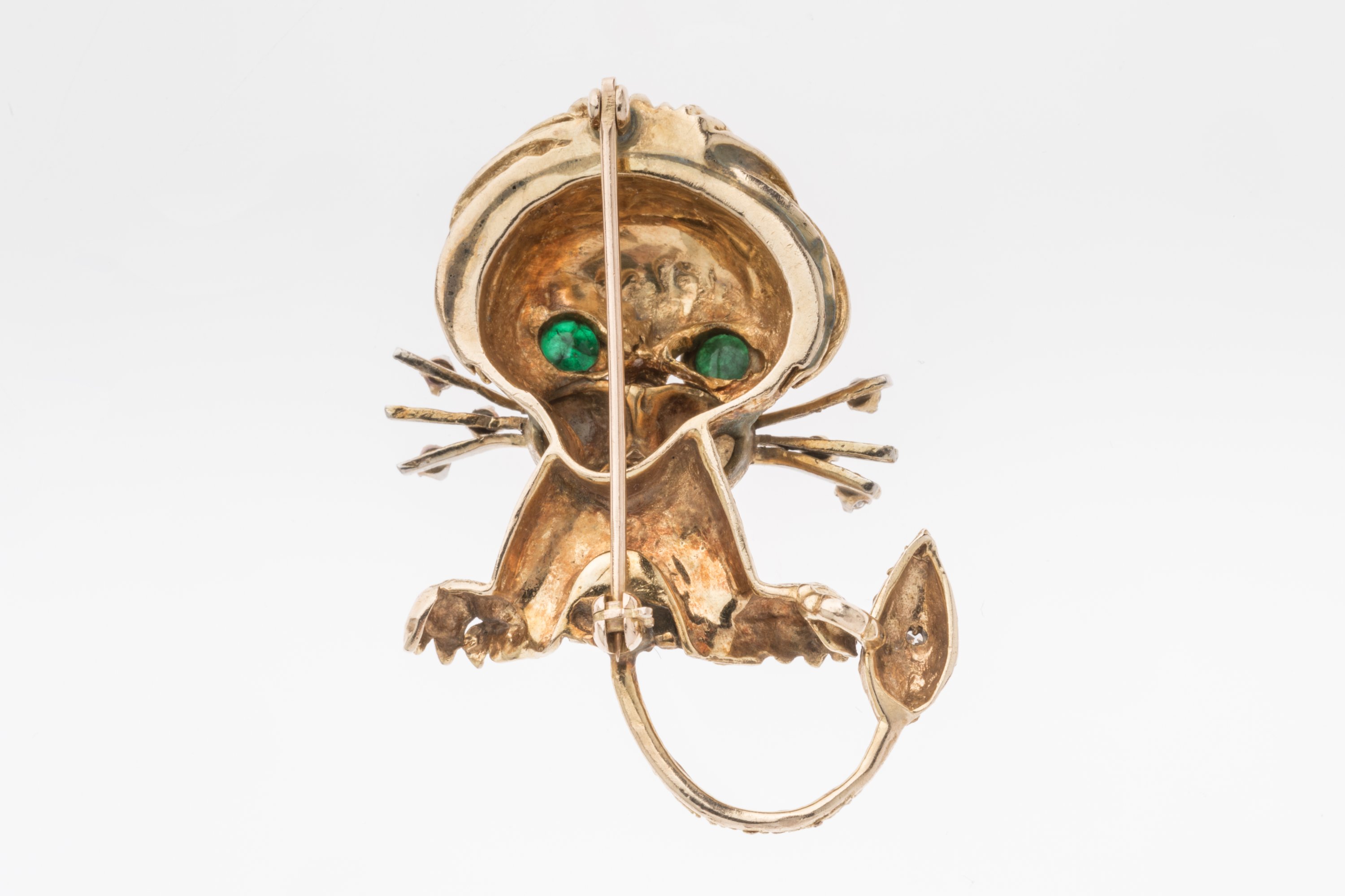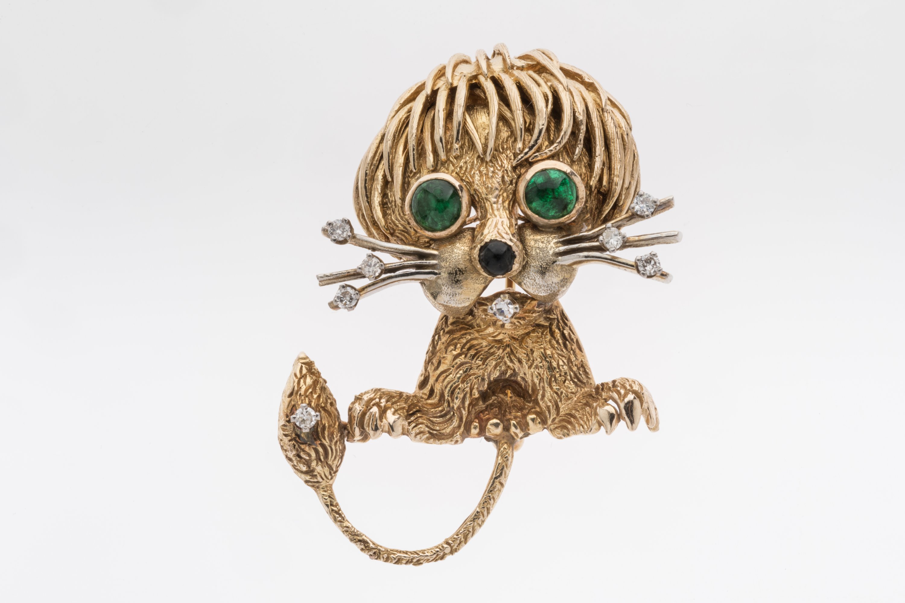 BROCHE LION en or jaune 585 millièmes, yeux en cabochons d'ÉMERAUDE, moustaches et queue ornée de huit pierres blanches.