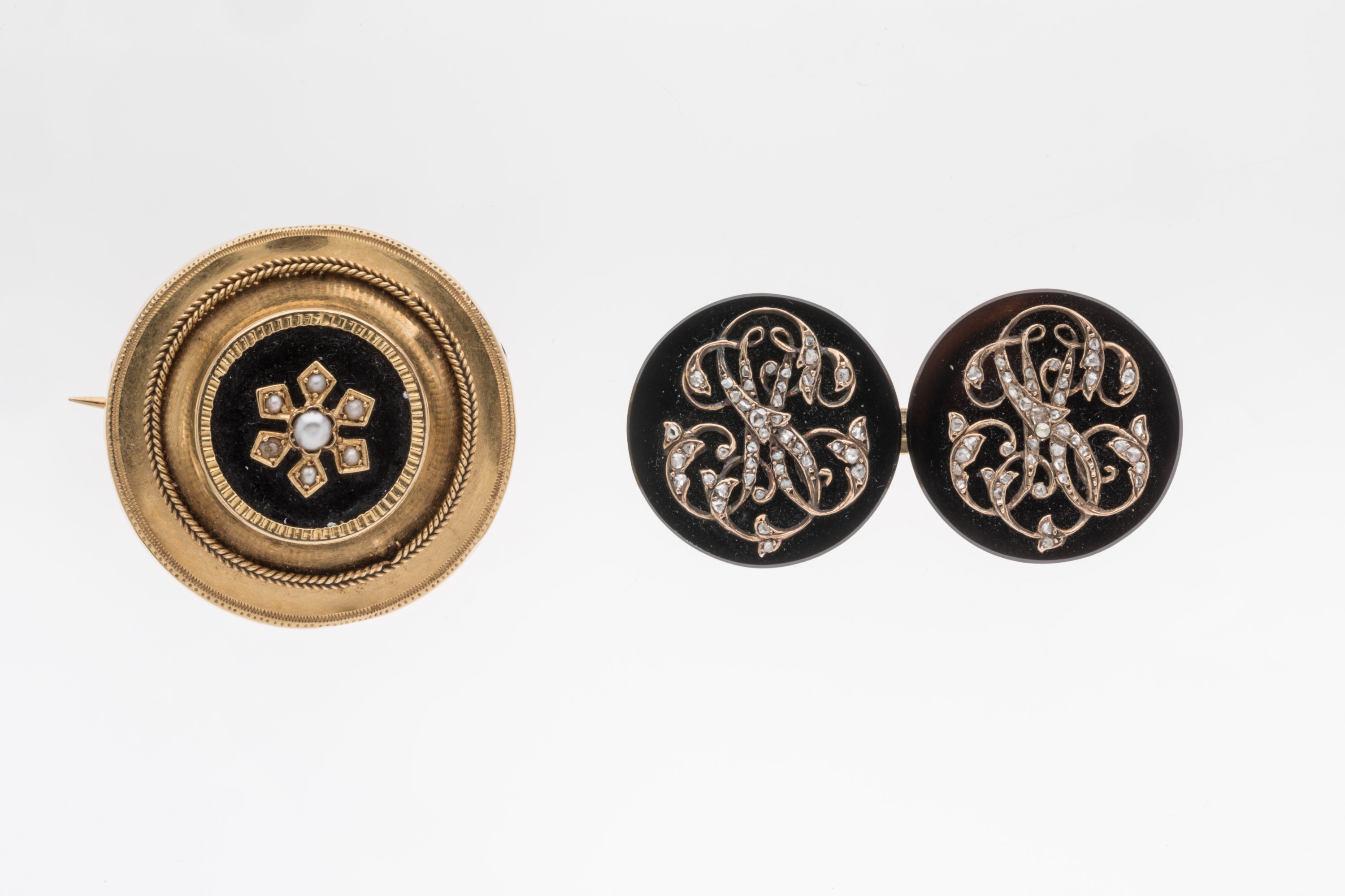 JOINT: une BROCHE en or jaune 750 millièmes décorée de deux motifs ronds en ONYX chacun décoré d'un monogramme serti de DIAMANTS taillés en roses.