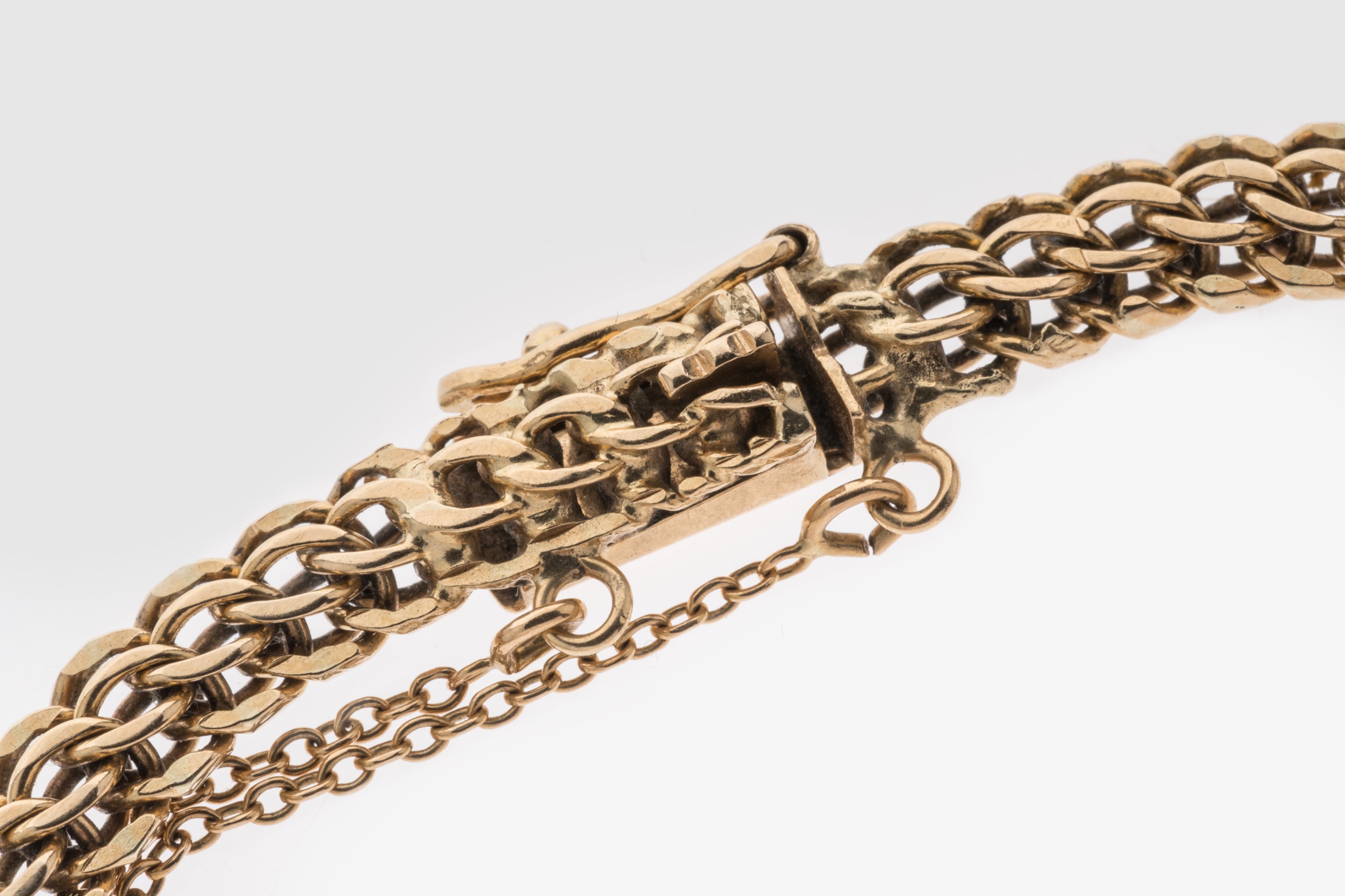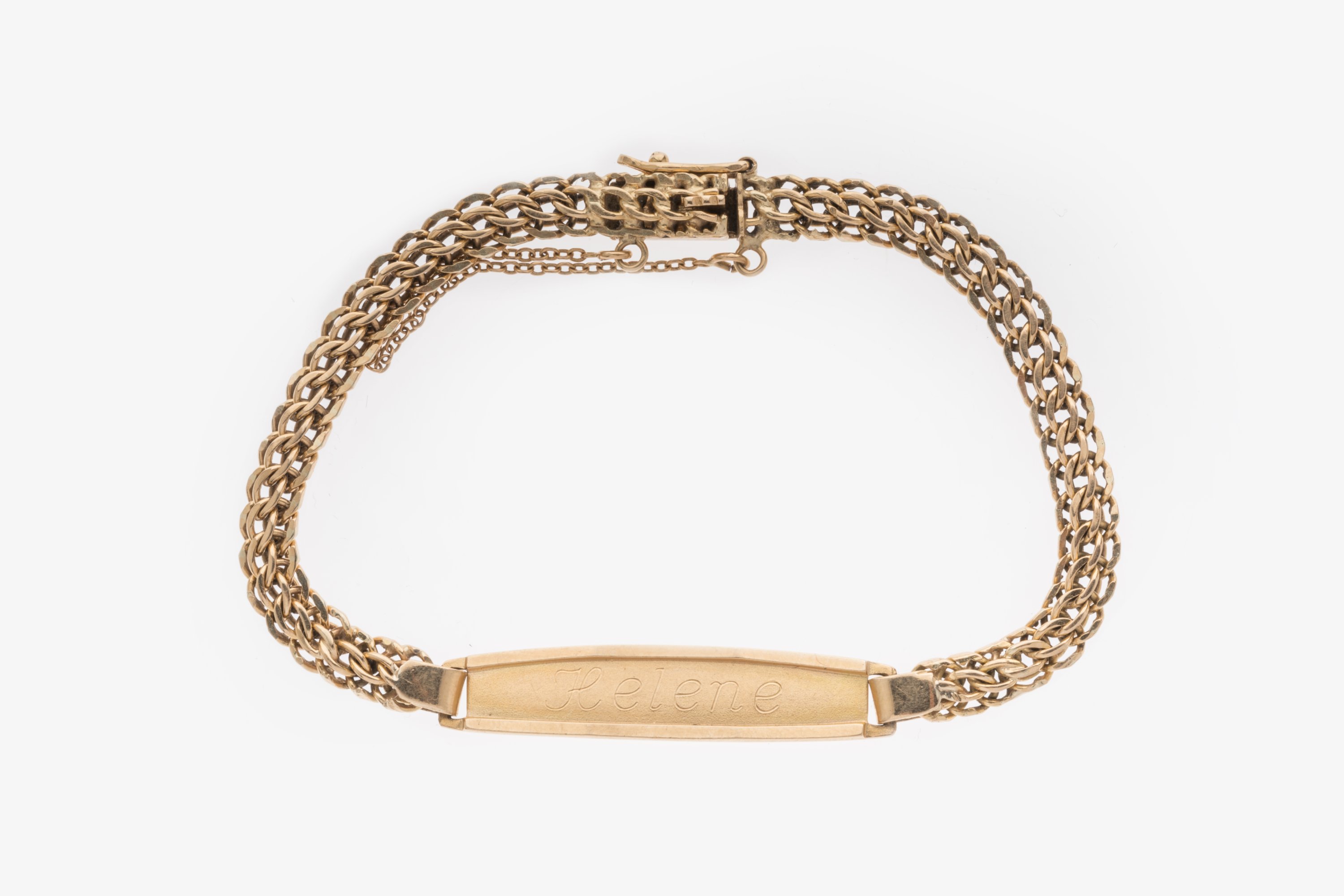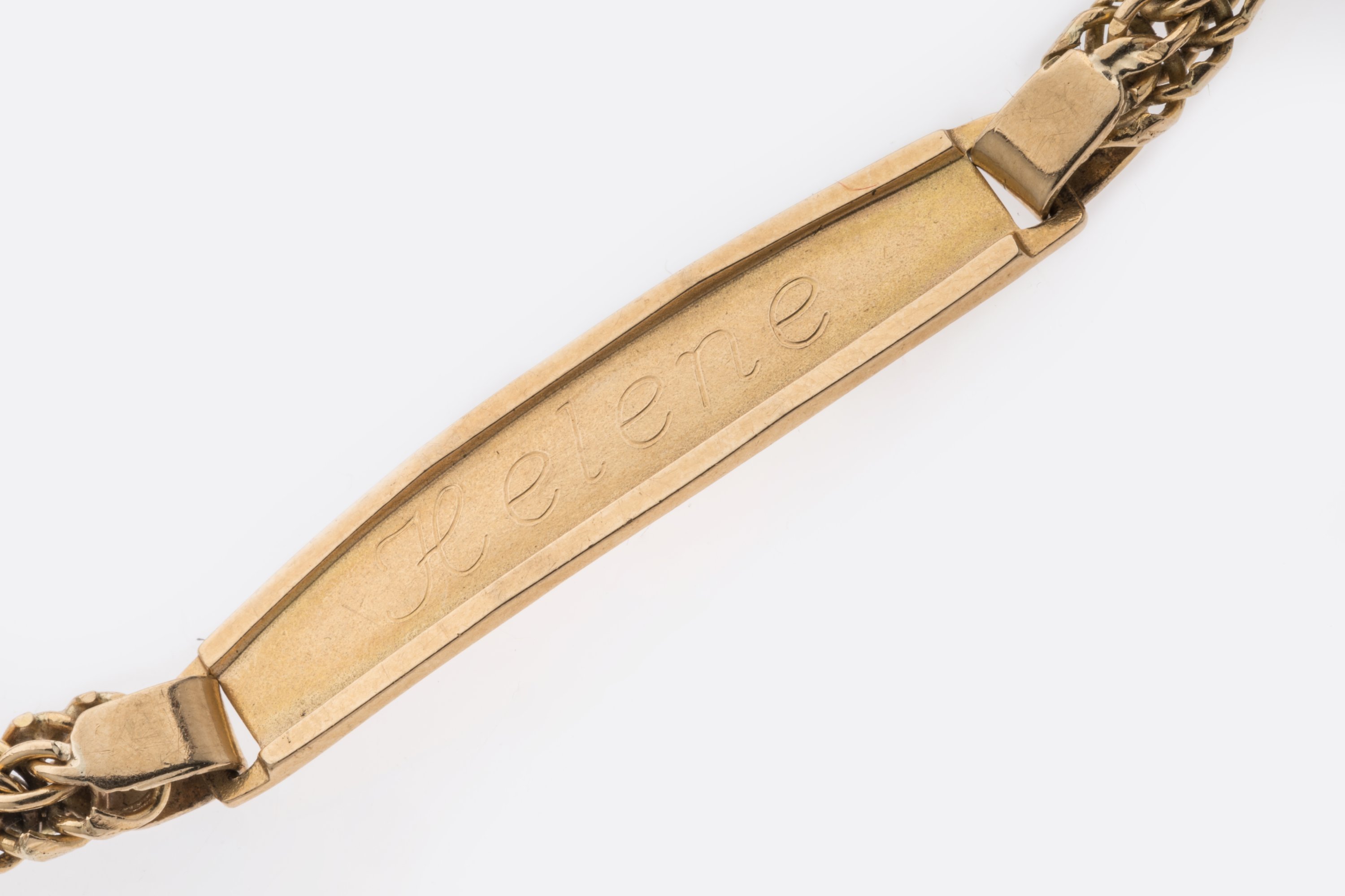 GOURMETTE or COULEUR, mailles entrelacées et plaque gravée "Hélène". Chaînette de sécurité.