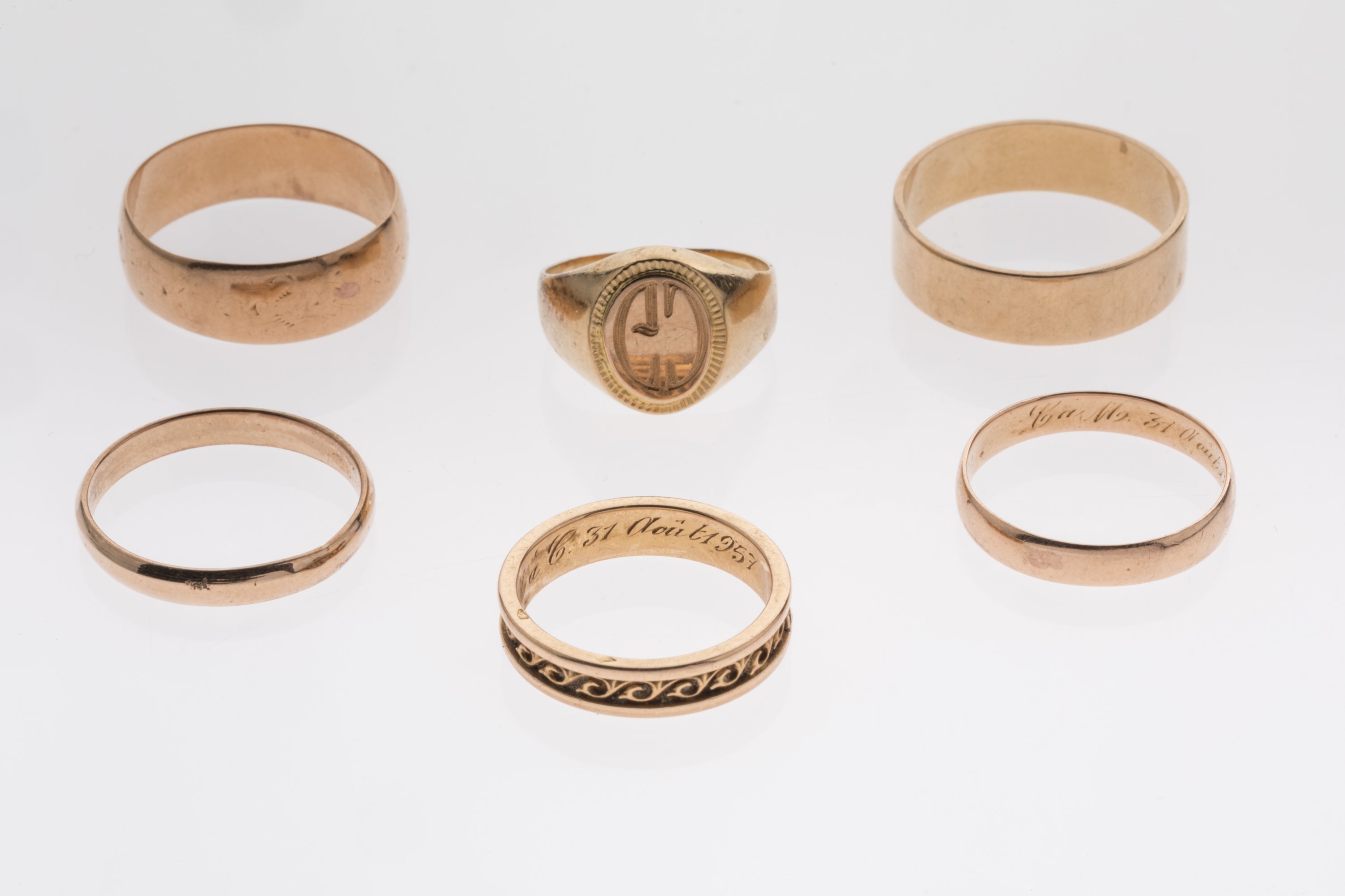 CINQ BAGUES en or jaune 750 millièmes dont une CHEVALIÈRE monogrammée "CG".