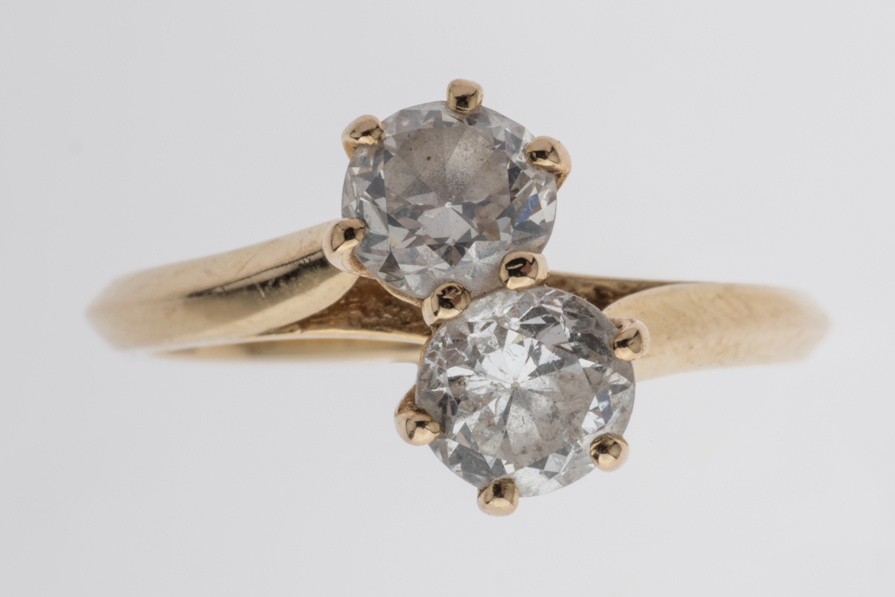 BAGUE "TOI & MOI" en or jaune 750 millièmes, le centre orné de deux DIAMANTS ronds de taille ancienne ou de taille brillant.