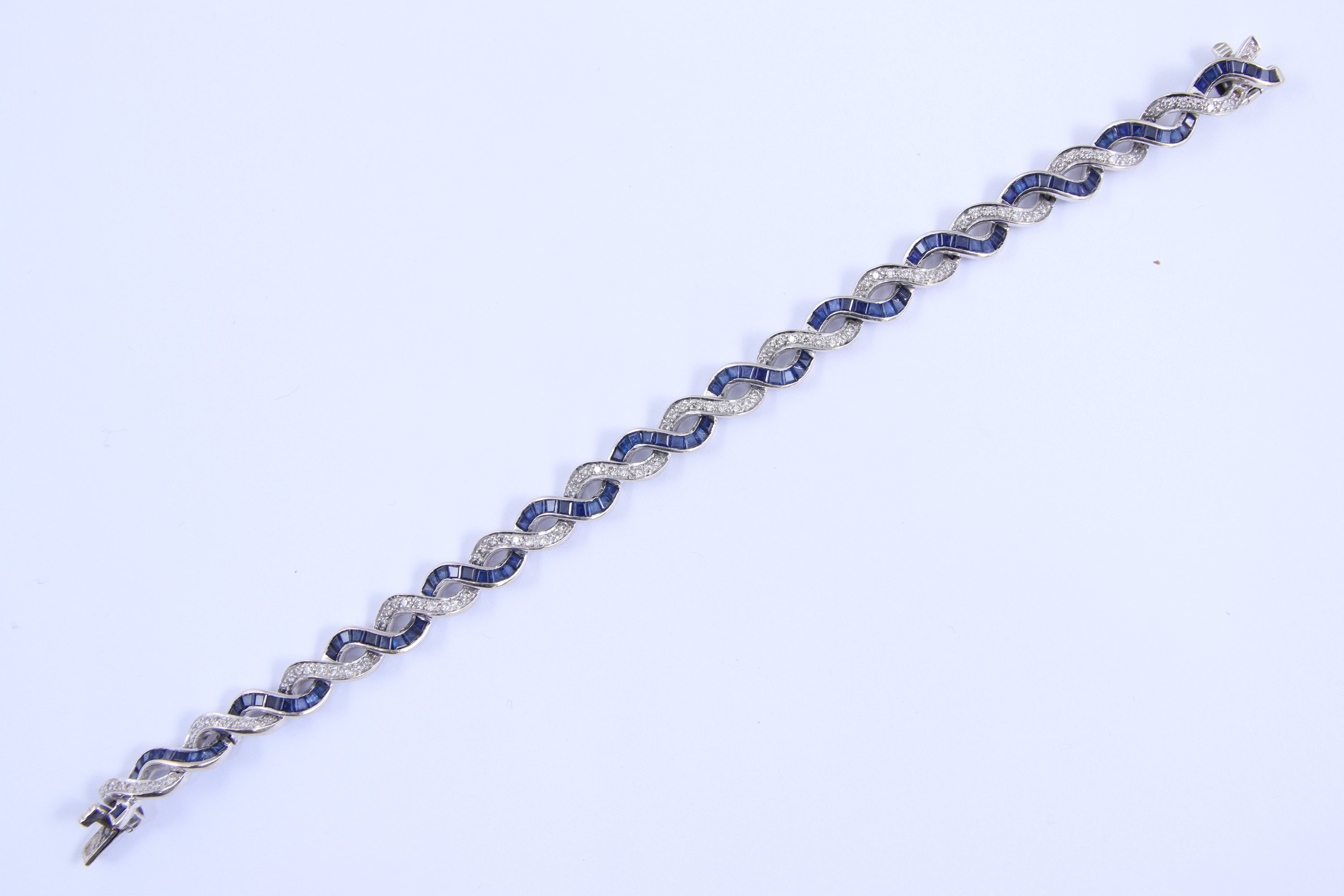 BRACELET ARTICULÉ en or gris 750 millièmes à décor de torsade orné de lignes de SAPHIRS calibrés et DIAMANTS ronds de taille brillant.