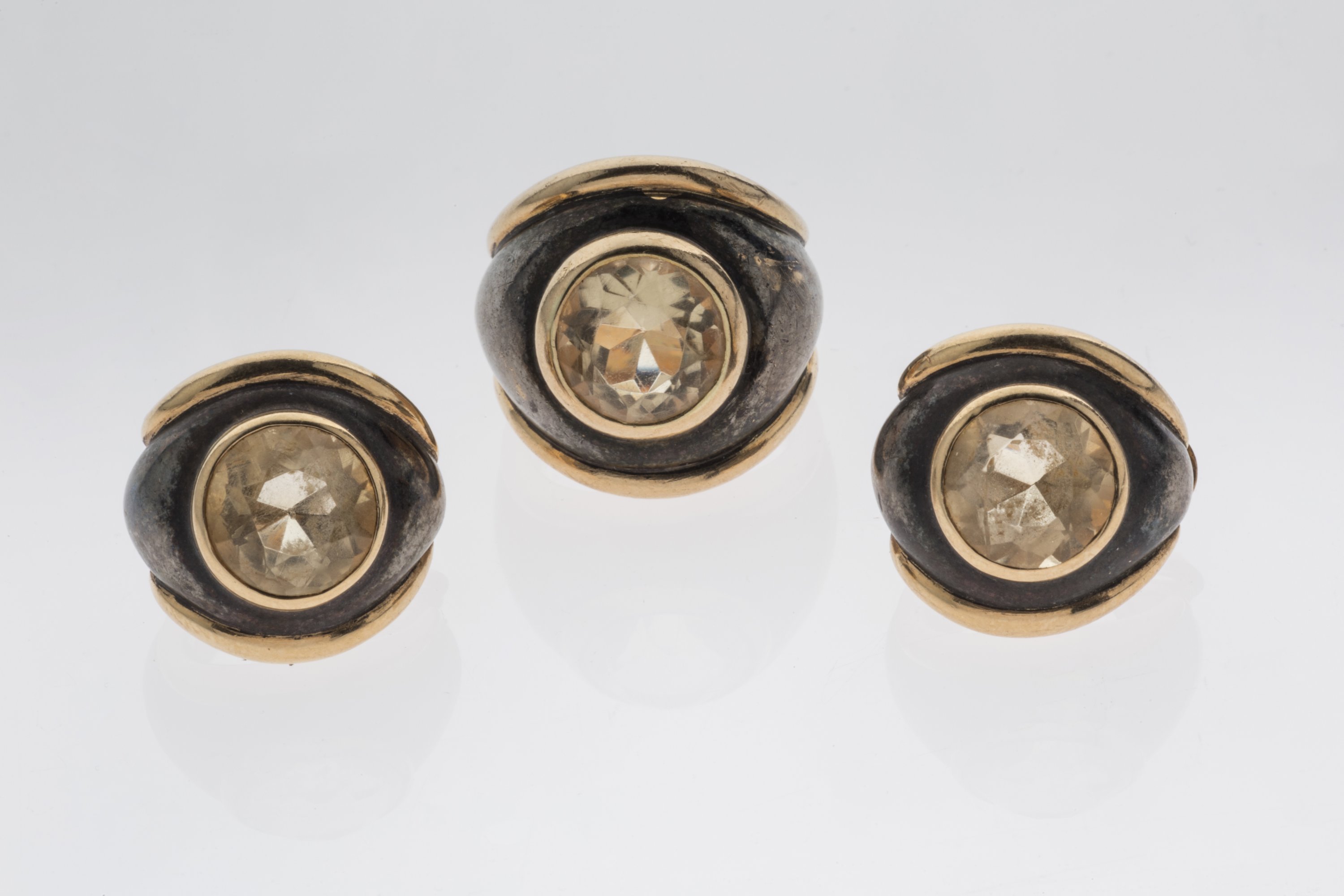 PARURE aux CITRINES (?) en or jaune 750 millièmes et patine noire, composée d'une BAGUE et d'une PAIRE DE CLIPS.