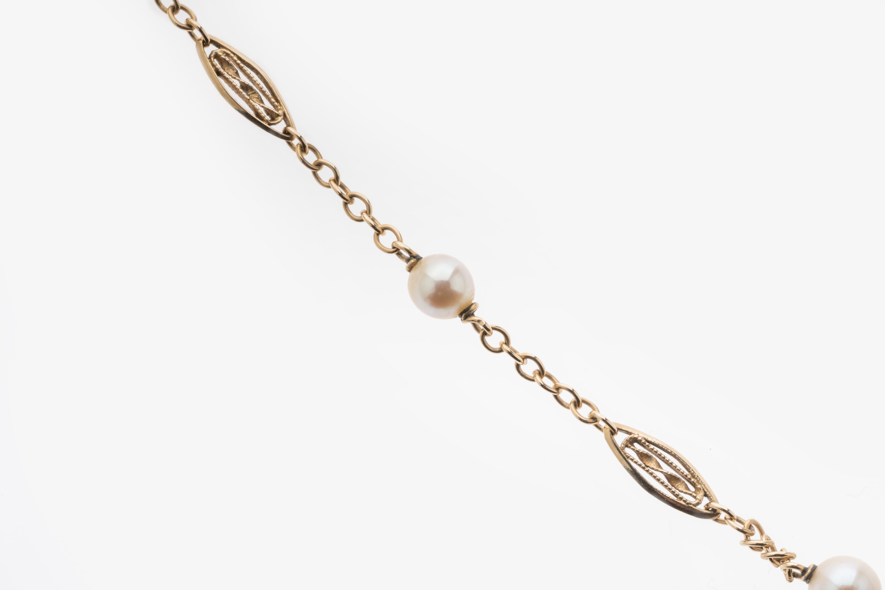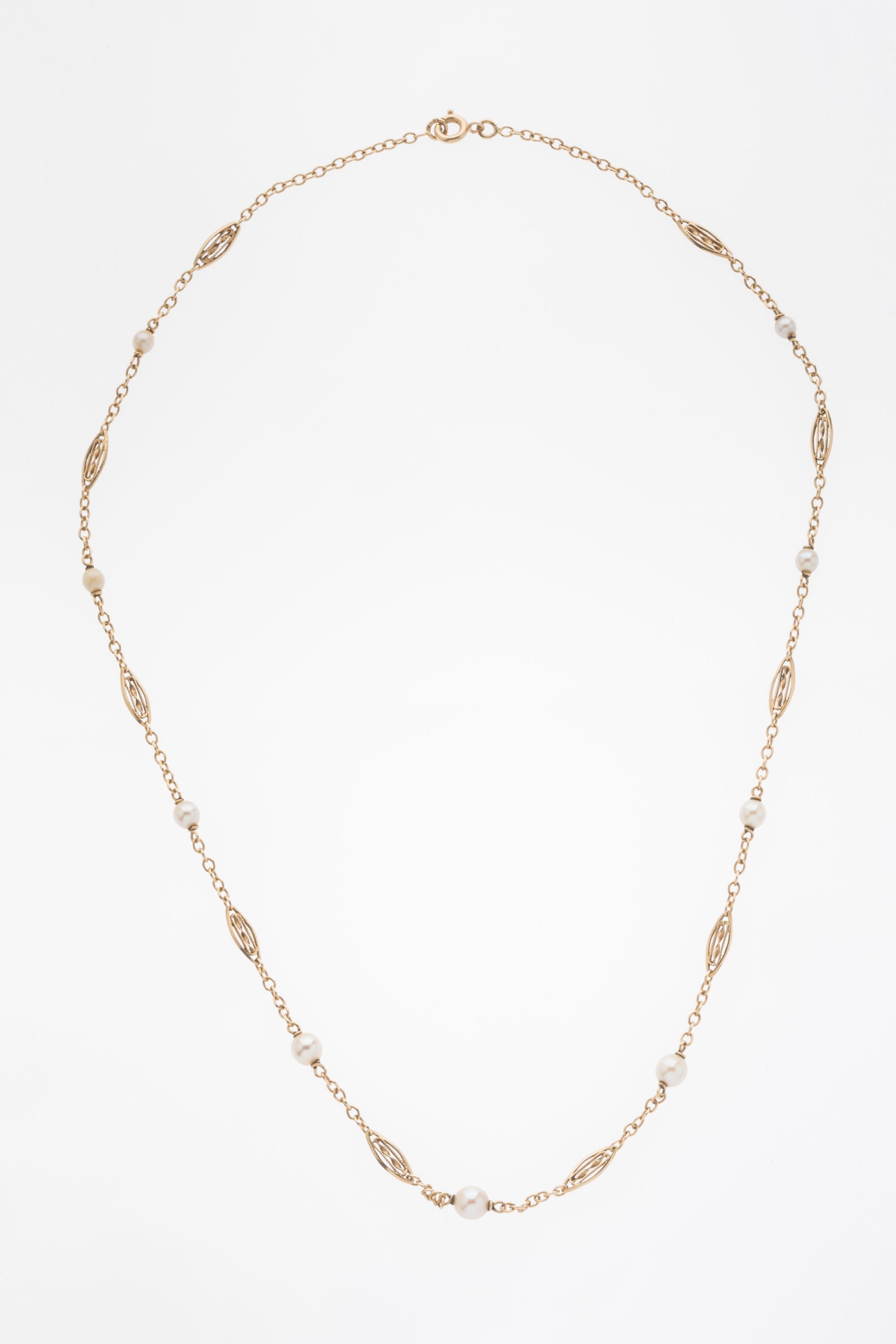COLLIER en or jaune 750 millièmes à mailles forçat et motifs filigranés orné de 9 perles.