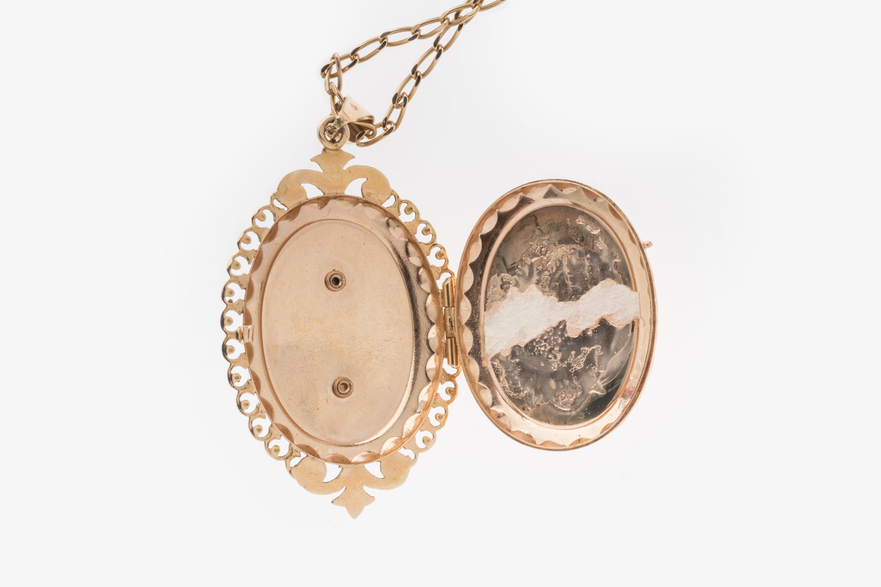 MÉDAILLON PORTE PHOTO et CHAÎNE à maille cheval en or jaune 750 millièmes, le médaillon orné d'une perle et de quatre petites pierres roses.