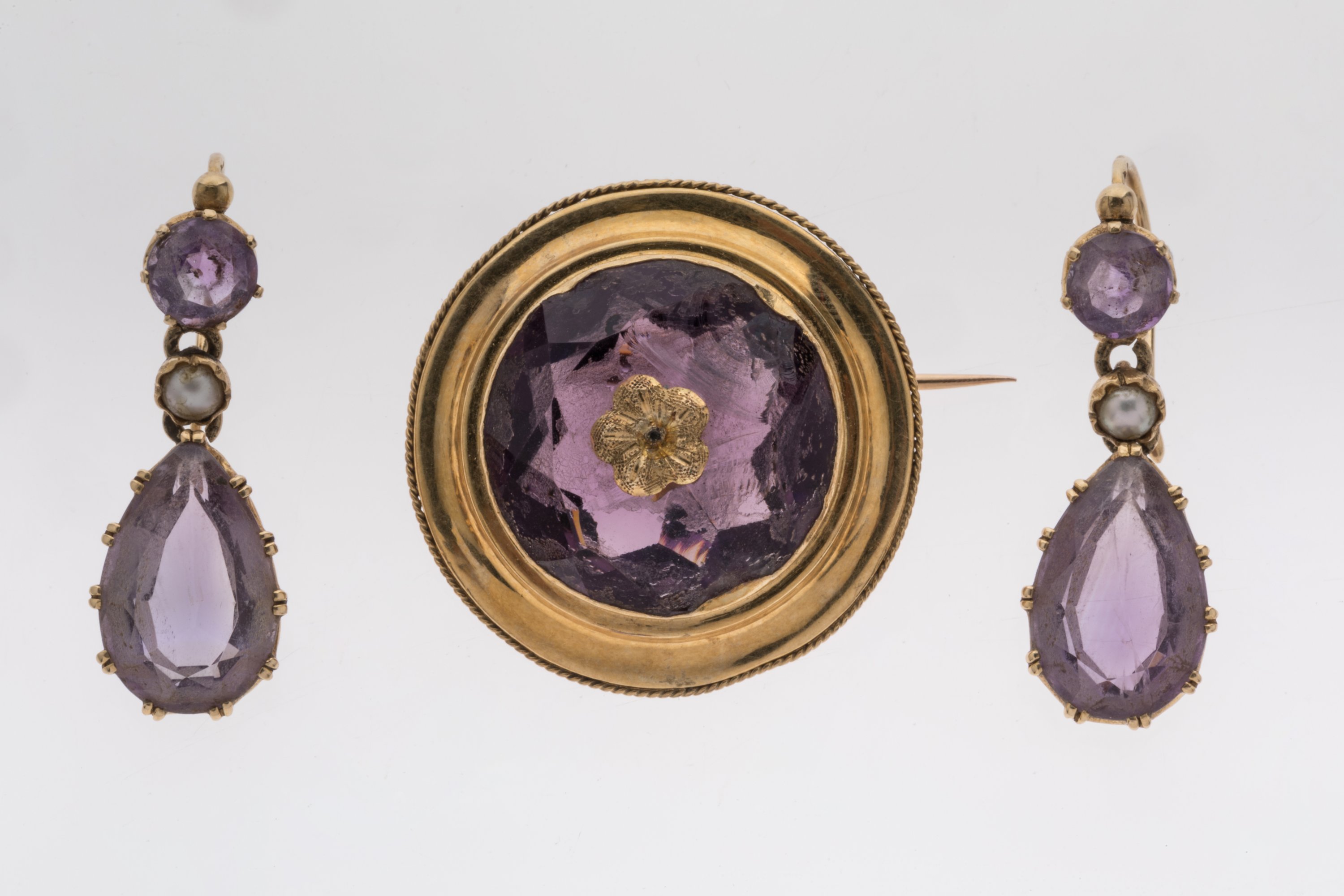 La broche ronde est ornée d'une importante AMÉTHYSTE facettée montée en serti-clos et centrée d'une fleur en or. La bordure est ciselée d'un motif de corde.