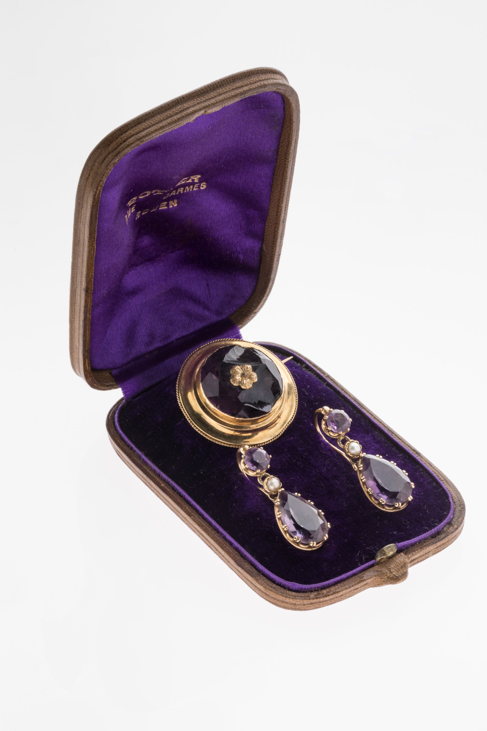 Les boucles d'oreilles sont à pendeloque. La partie supérieure ronde est ornée d'une AMÉTHYSTE facettée. Une perle de culture fait la jonction avec le pendant qui est en forme de goutte et orné d'une améthyste taillée en poire.
