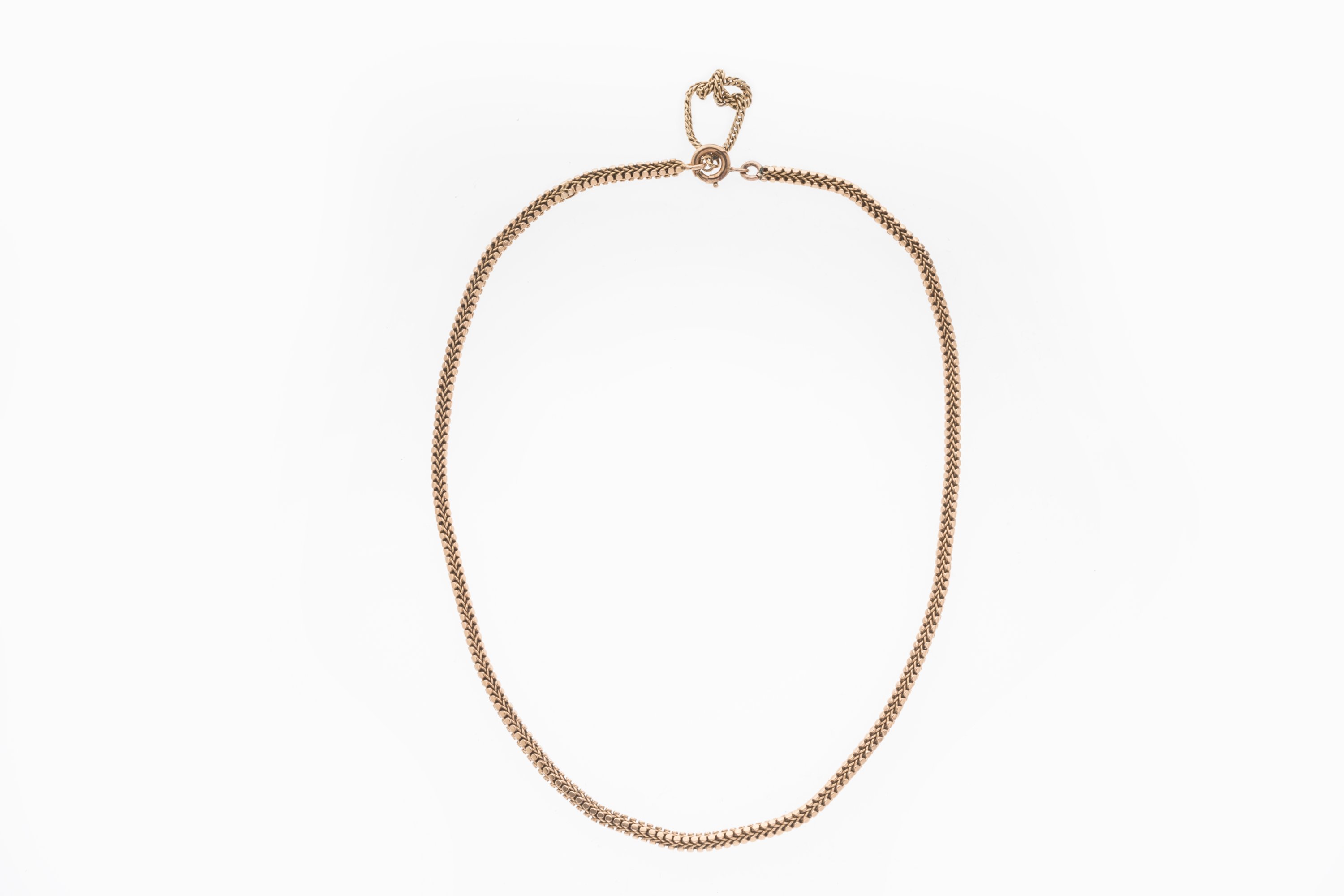 CHAÎNE en or jaune 750 millièmes en mailles vénitiennes. Le fermoir est accompagné d'une petite chaîne en mailles anglaises qui forme un cordage noué.