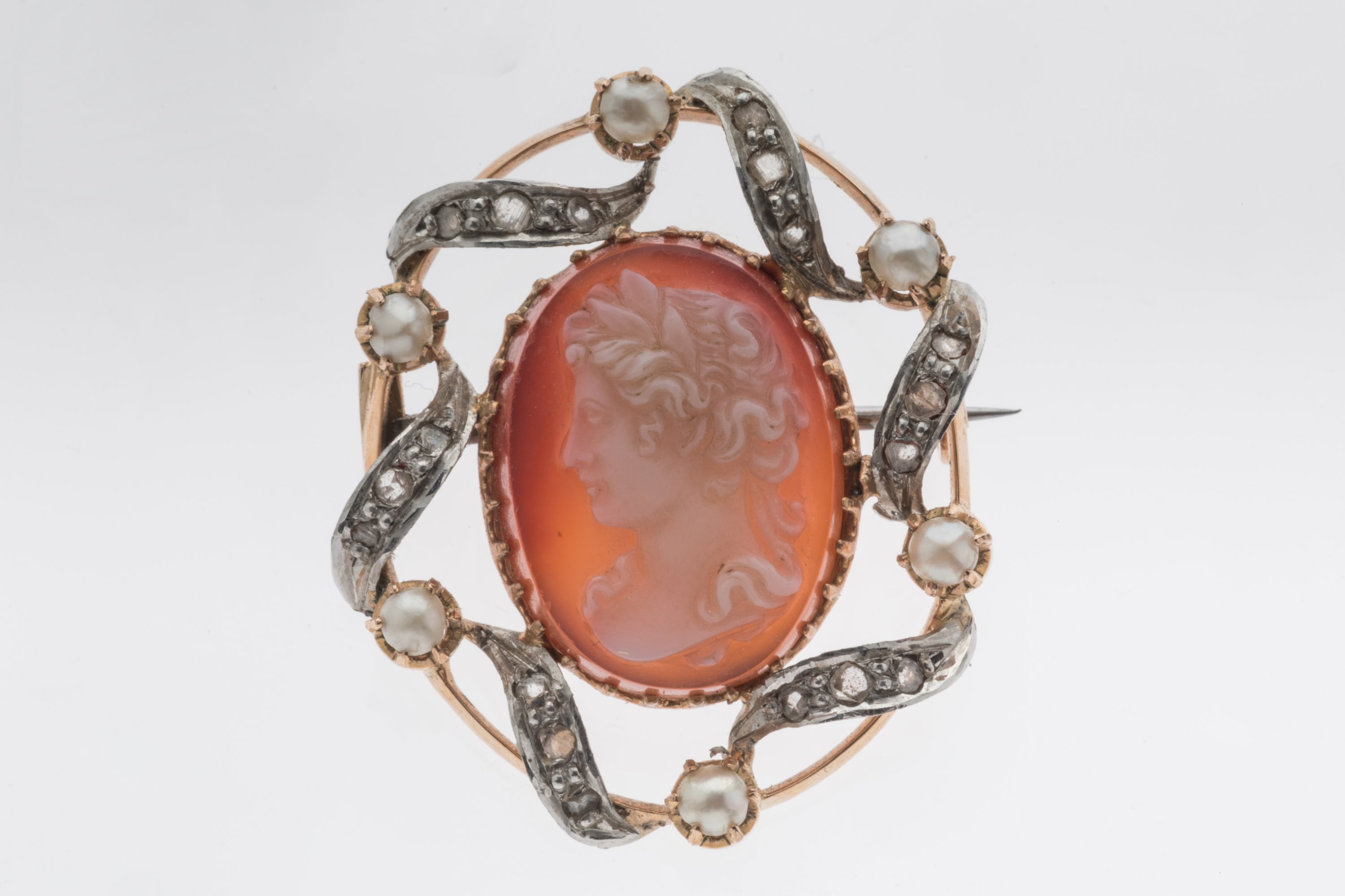 BROCHE en or jaune et blanc 750 millièmes orné d'un camée en cornaline figurant un portrait à l'Antique. Le camée est entouré d'un anneau d'or sur lequel vient s'enrouler un ruban en or blanc rehaussé de pierres blanches et de demi-perles.