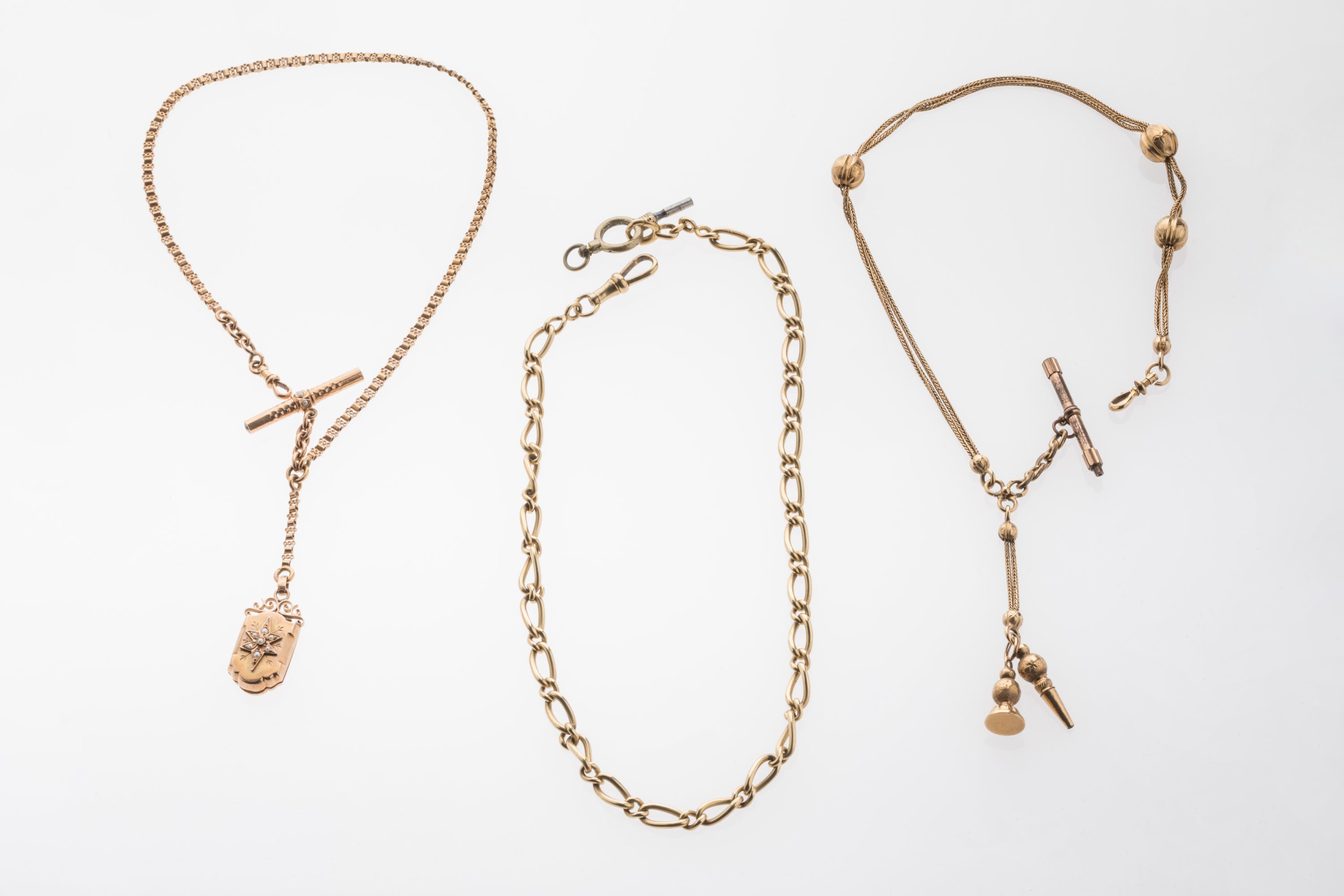 Trois CHAÎNES en or jaune 750 millièmes dont deux CHAÎNES GILETIÈRES.