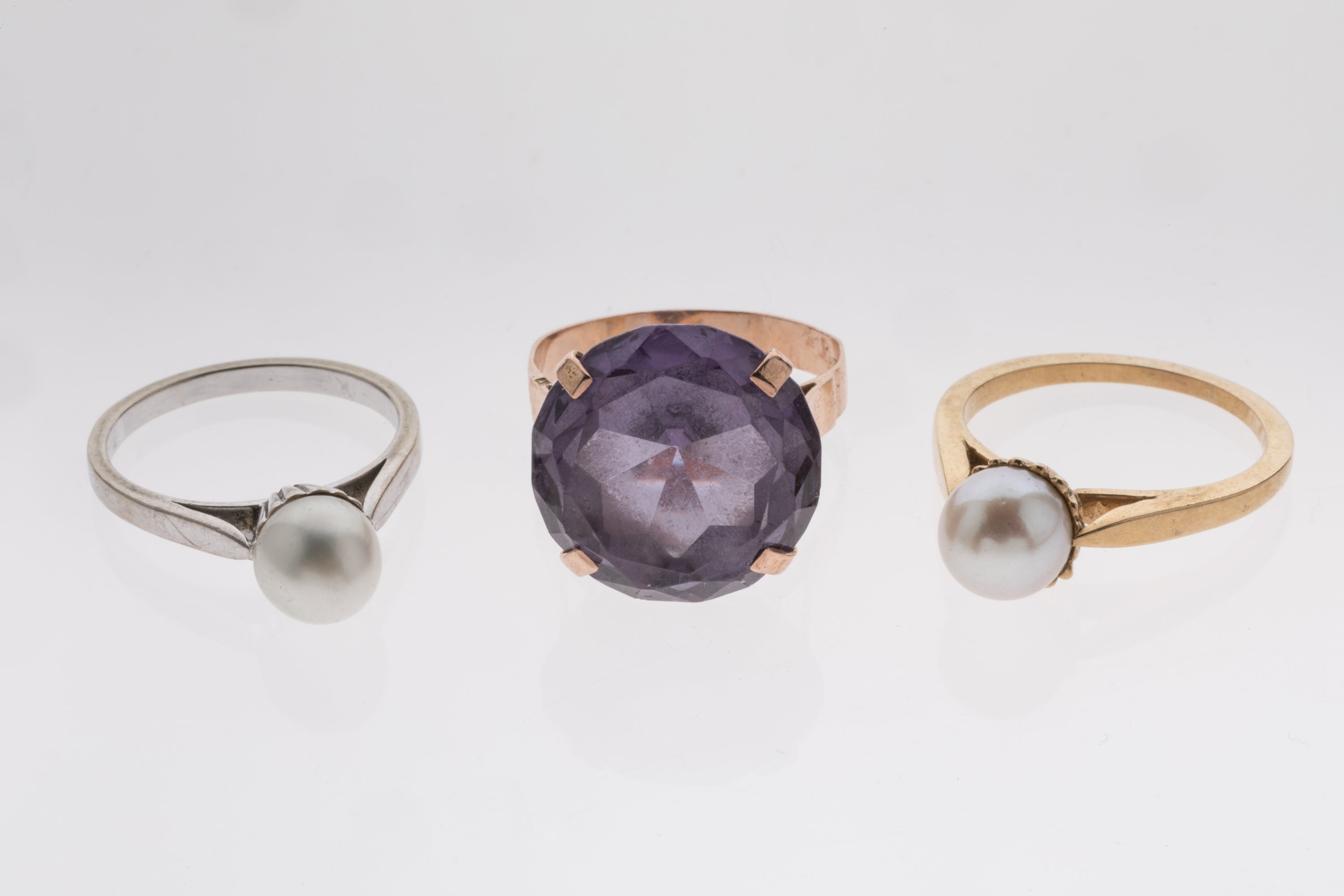 BAGUE sur or jaune, ornée d'une AMÉTHYSTE, et deux bagues en or ornées d'une demi-perle.