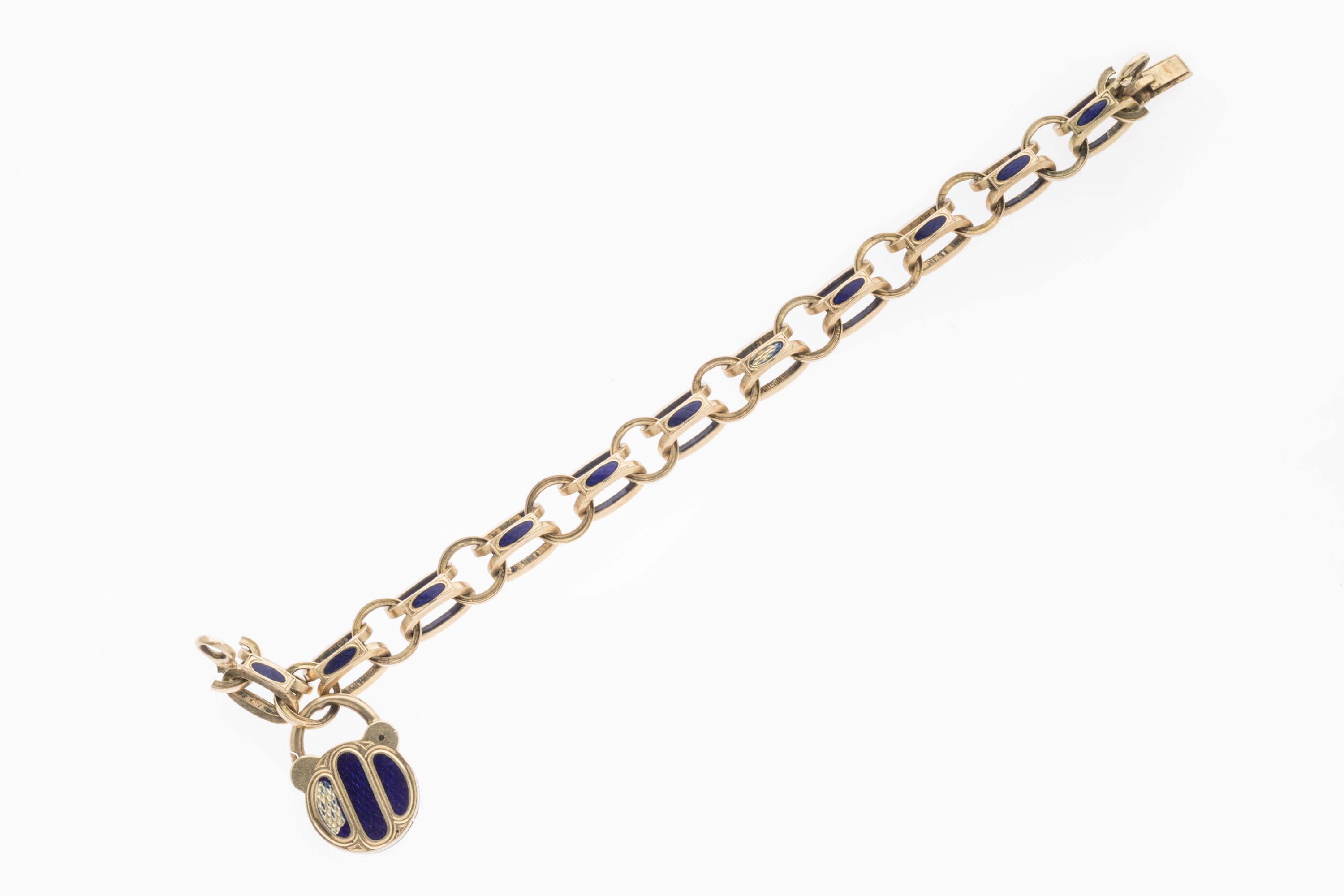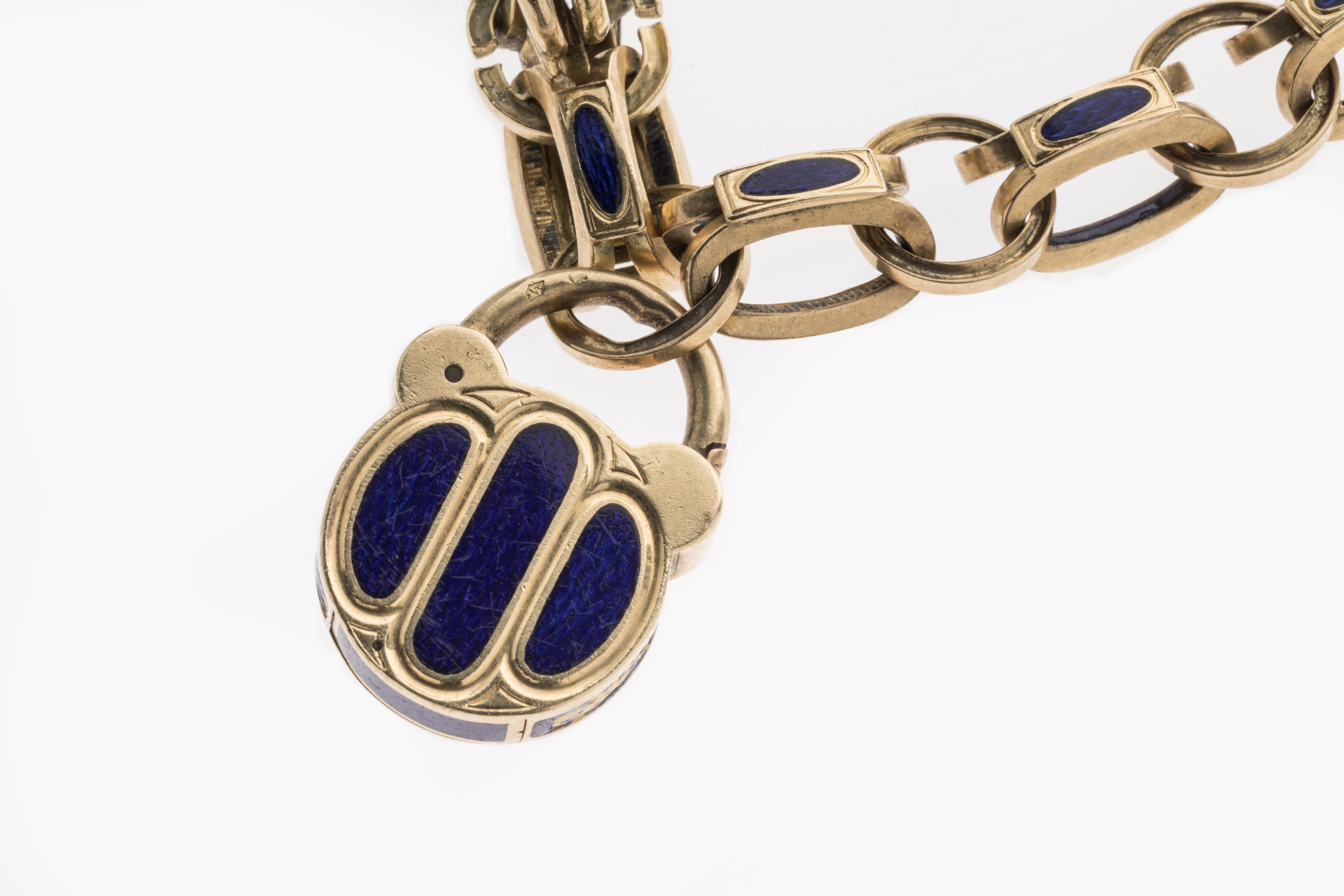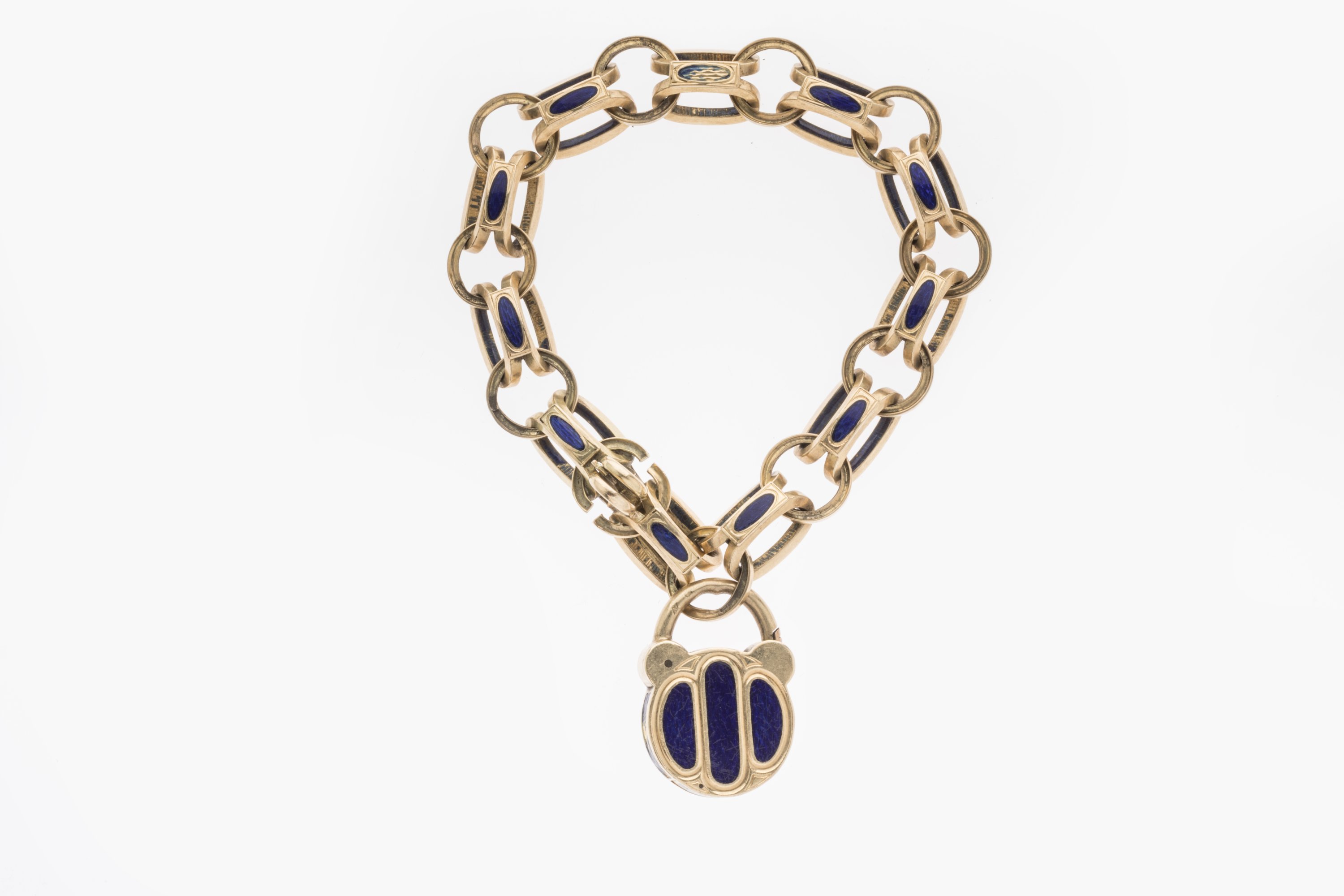 BRACELET et PENDELOQUE en forme de cadenas en or jaune 750 millièmes, ornés de plaques imitant le lapis lazuli.