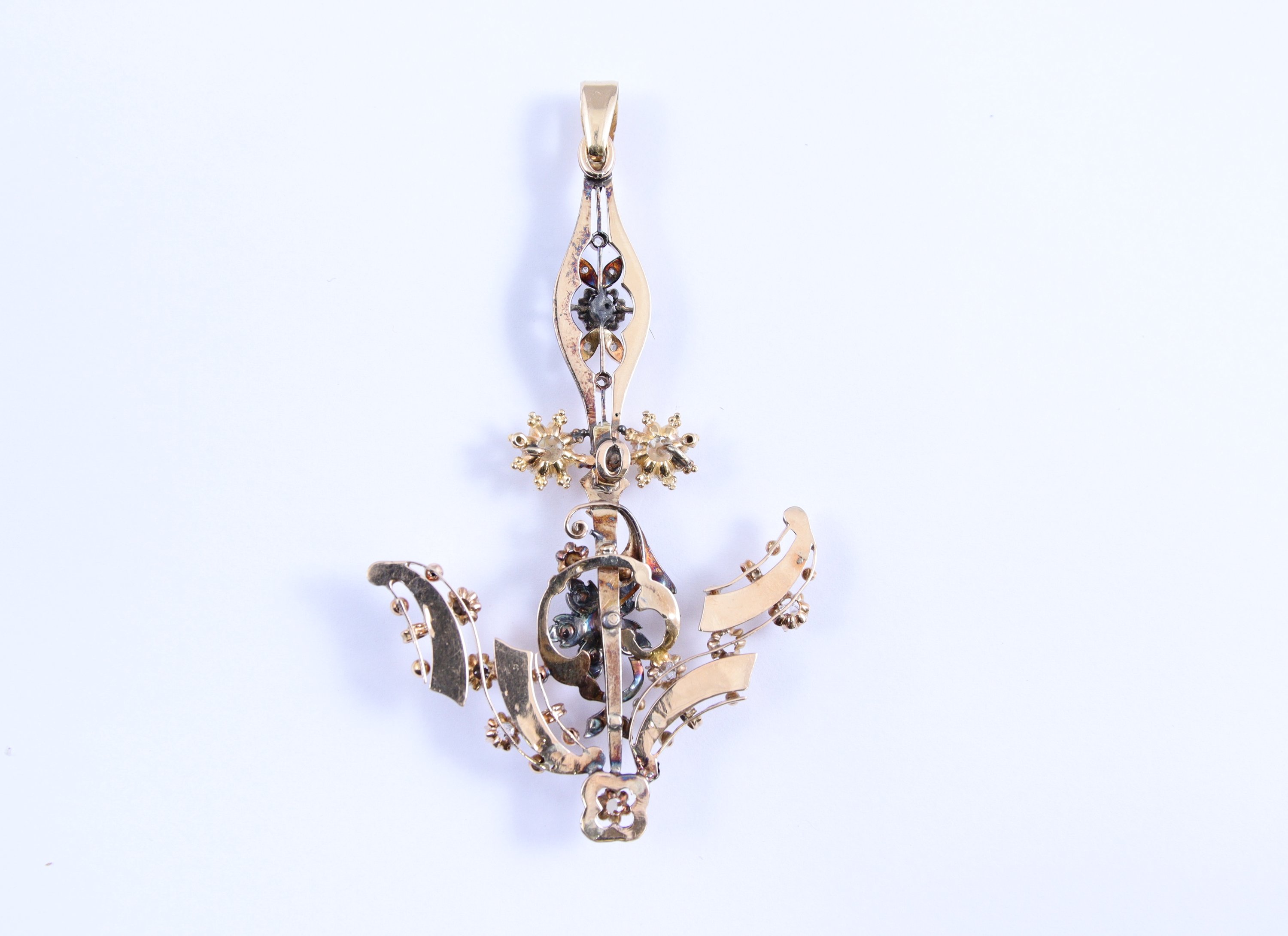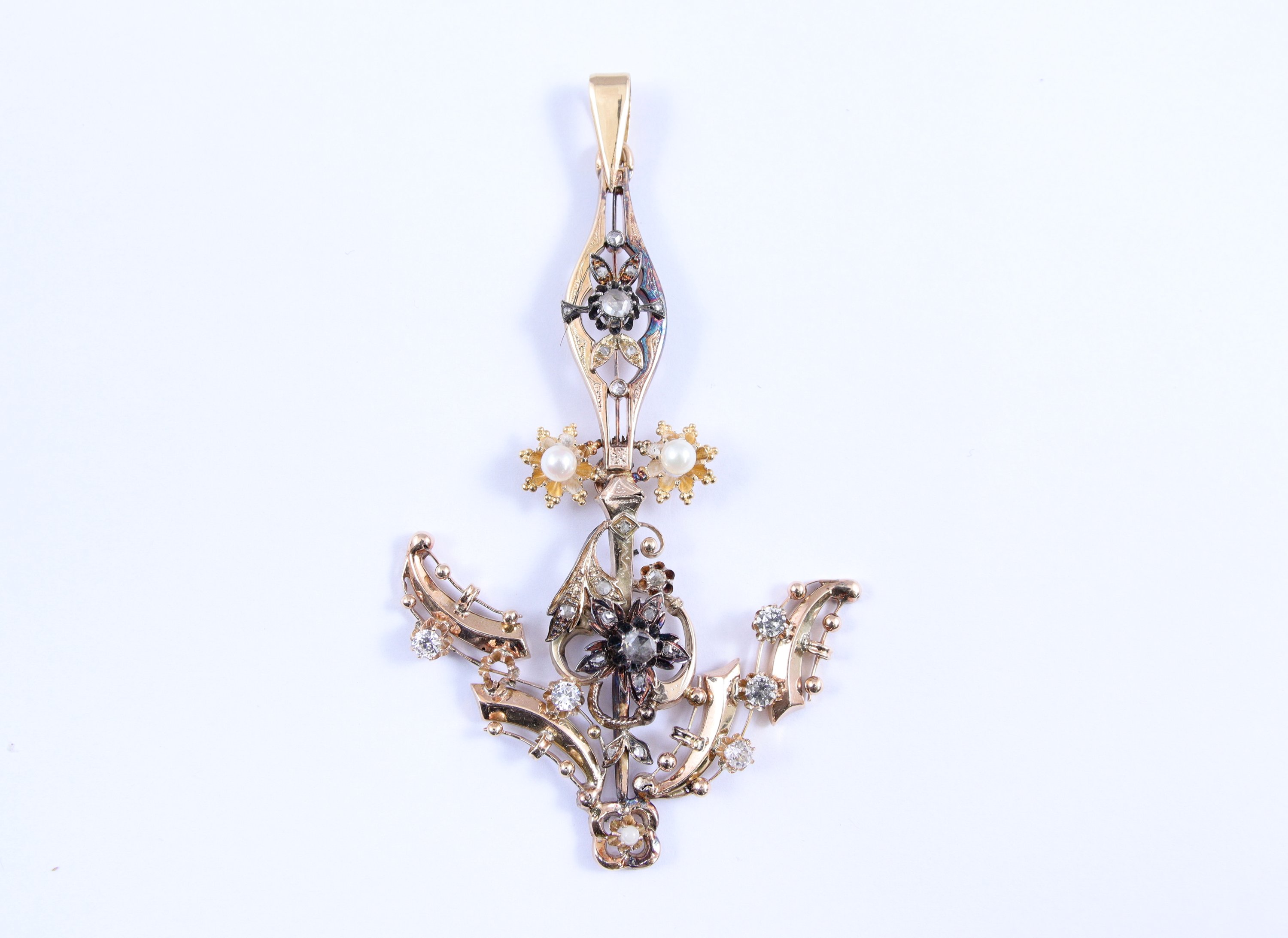 Grand PENDENTIF ANCRE en or jaune, en partie 750 millièmes et en partie bas-titre, orné de PERLES, deux DIAMANTS et de zircon.