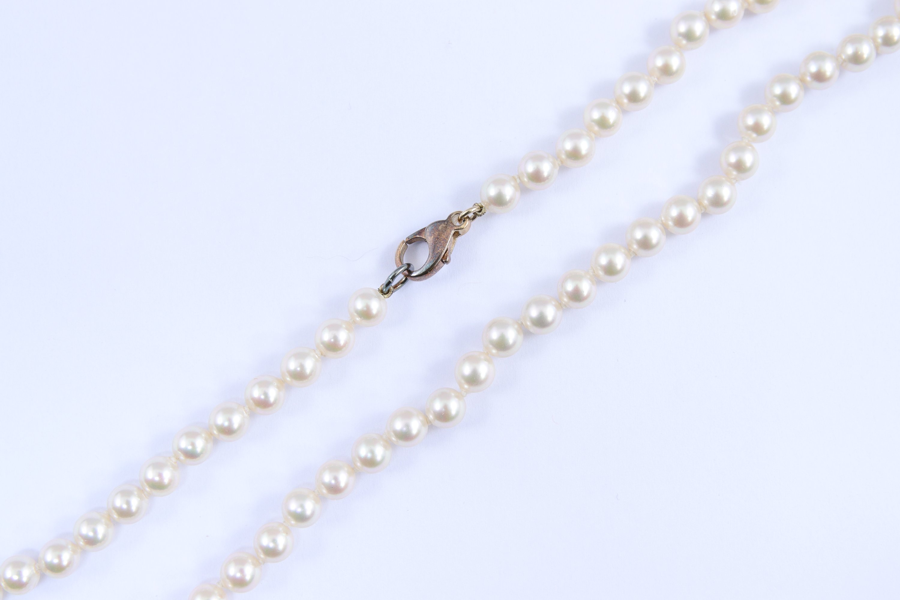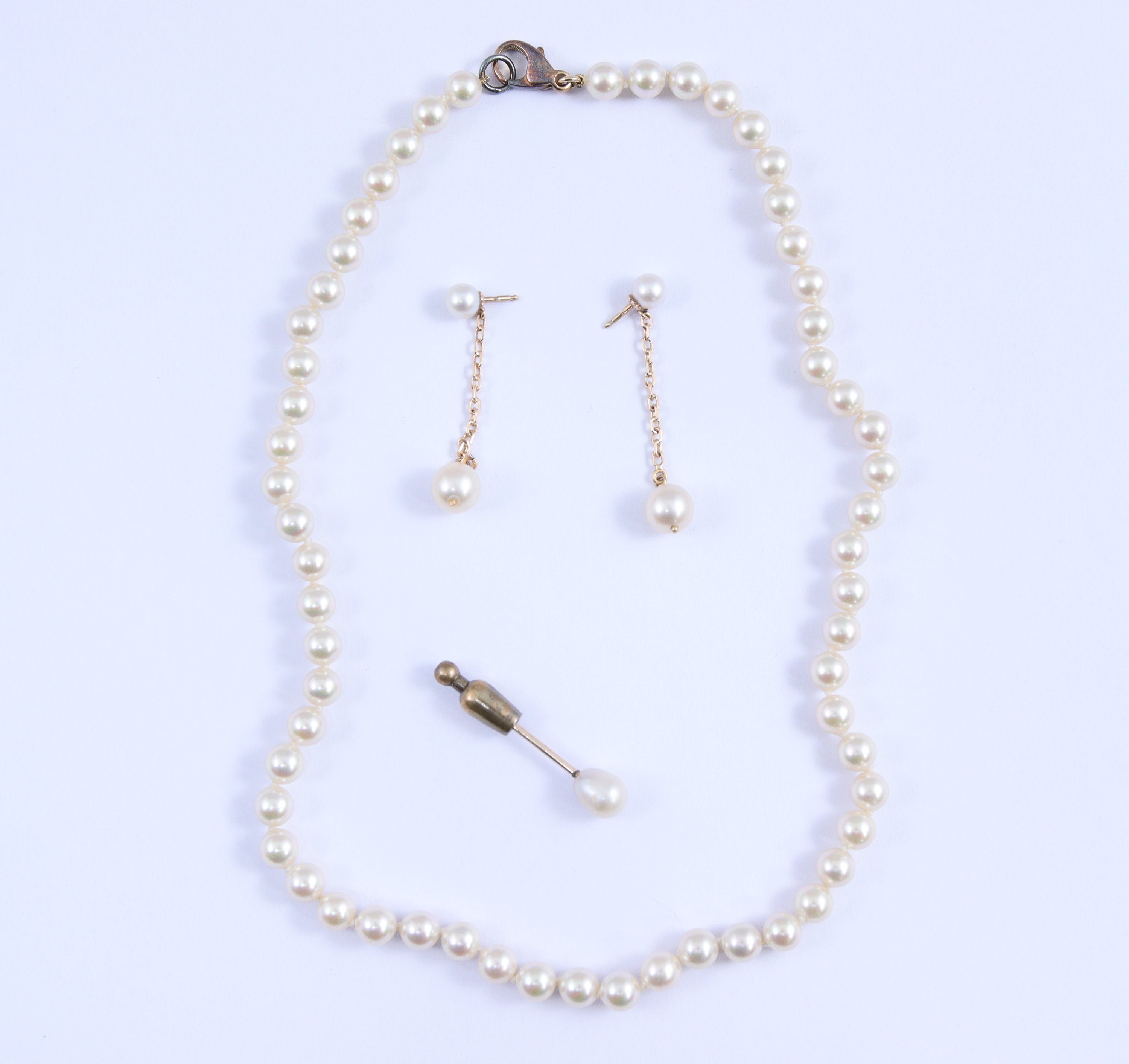PARURE de PERLES composée d'un COLLIER choker à un rang de perles (Long. 39 cm), d'une ÉPINGLE et d'une PAIRE DE BOUCLES D'OREILLES DORMEUSES en or jaune 750 millièmes ornées chacune de deux perles (Haut. 40 mm).