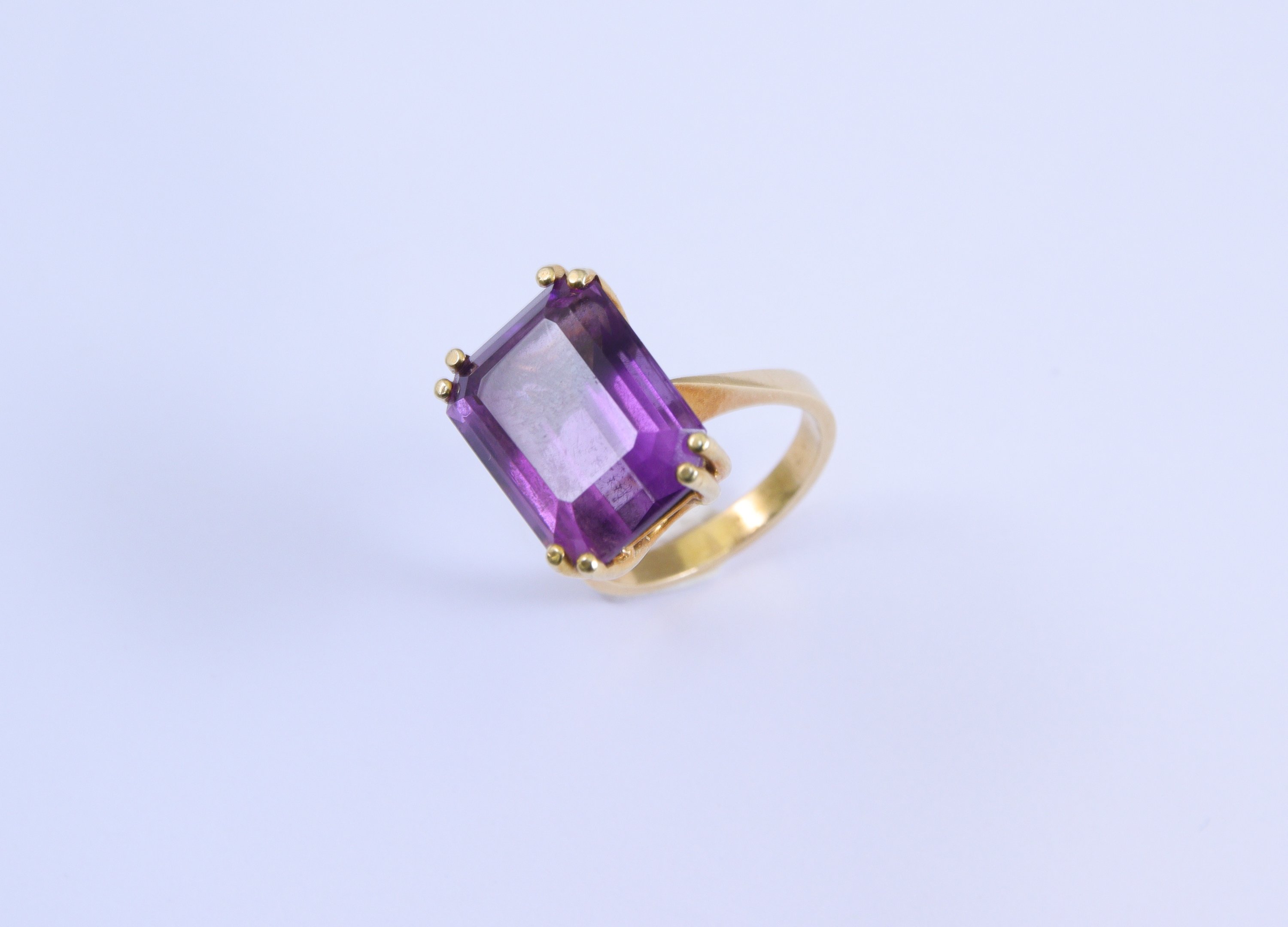 BAGUE en or jaune ornée d'une améthyste de taille émeraude.