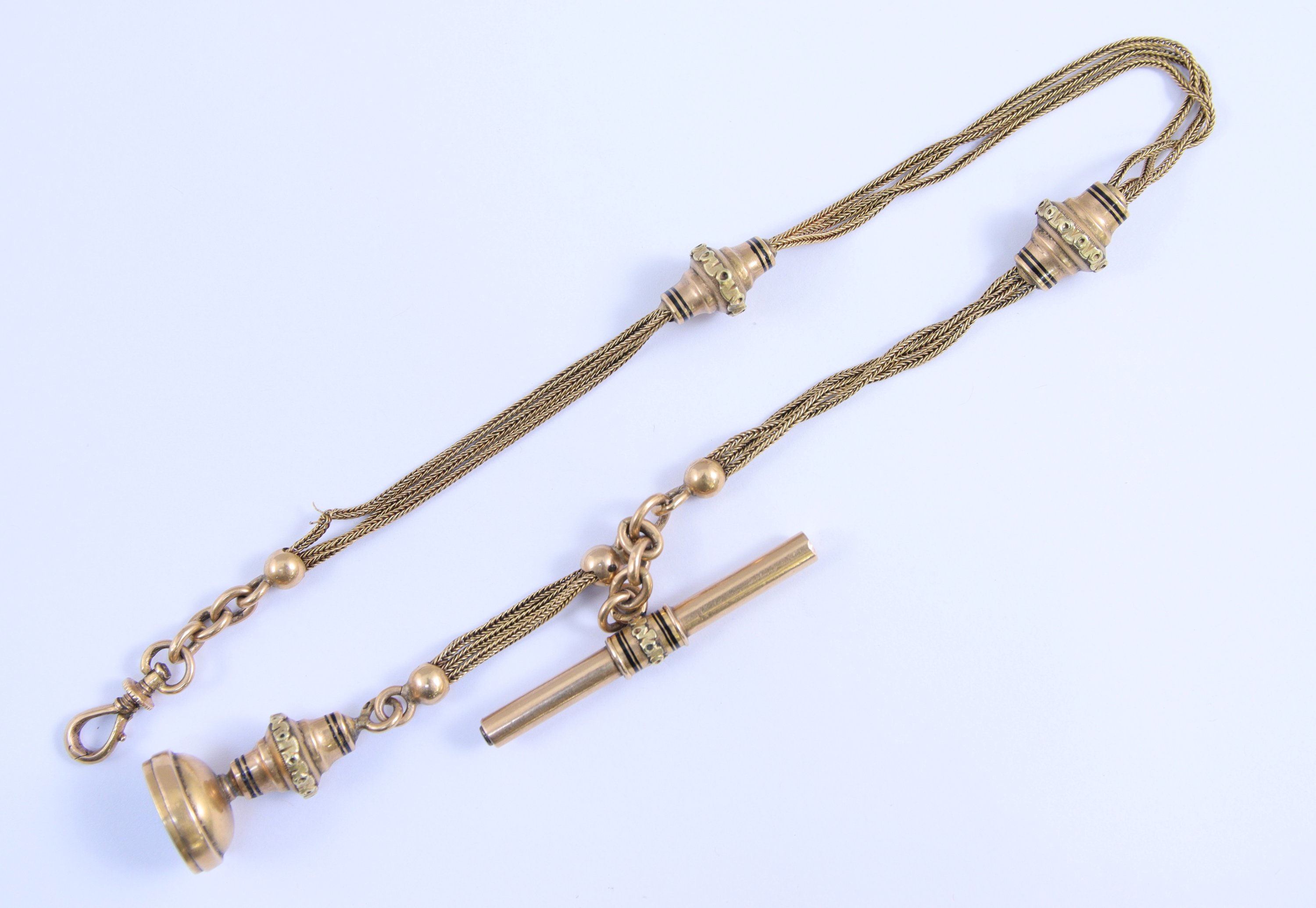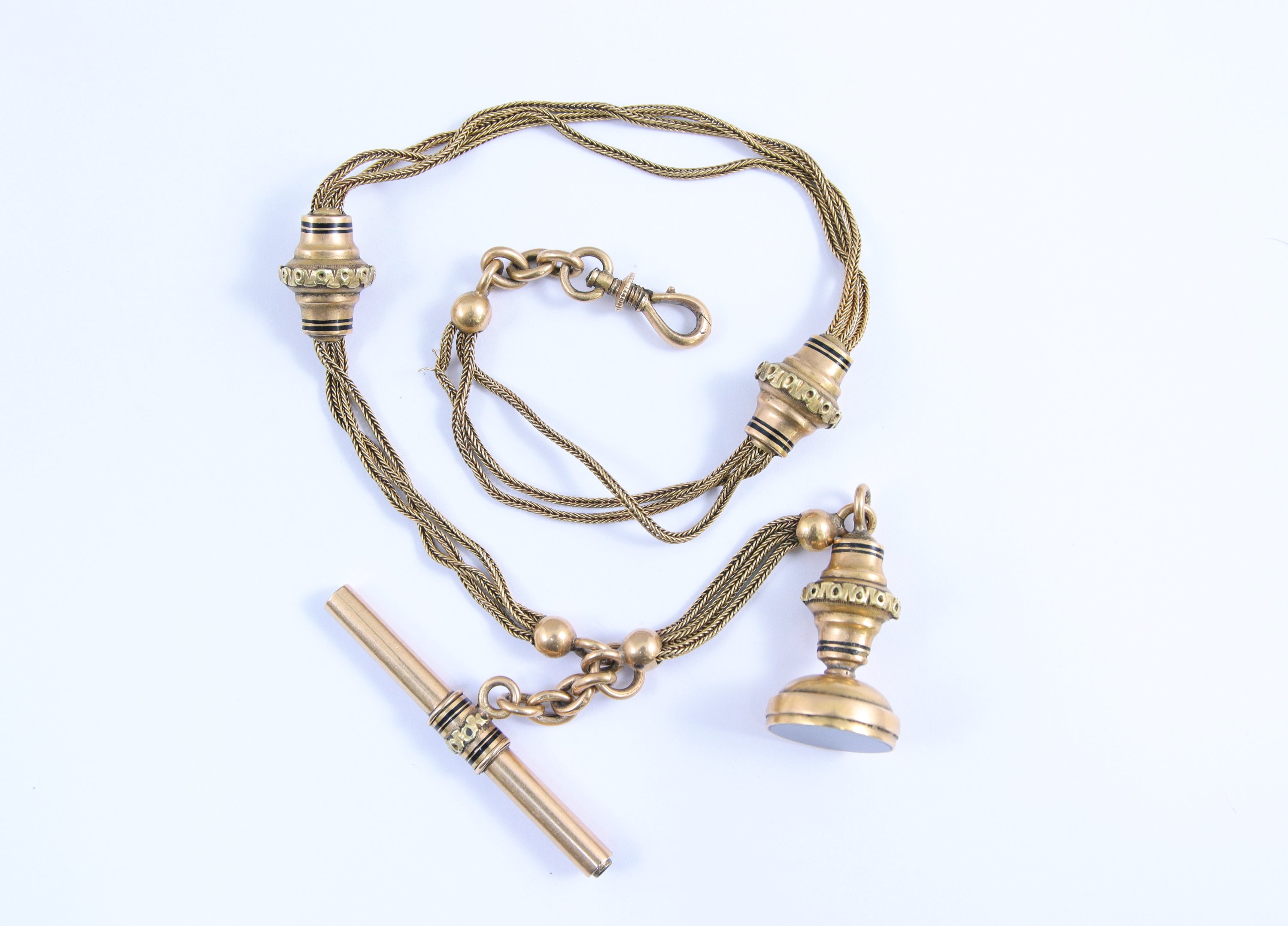 CHAINE GILETIÉRE en or. 2 coulants retenant 3 chaînettes, 1 clef, 1 cachet pierre dure noire.