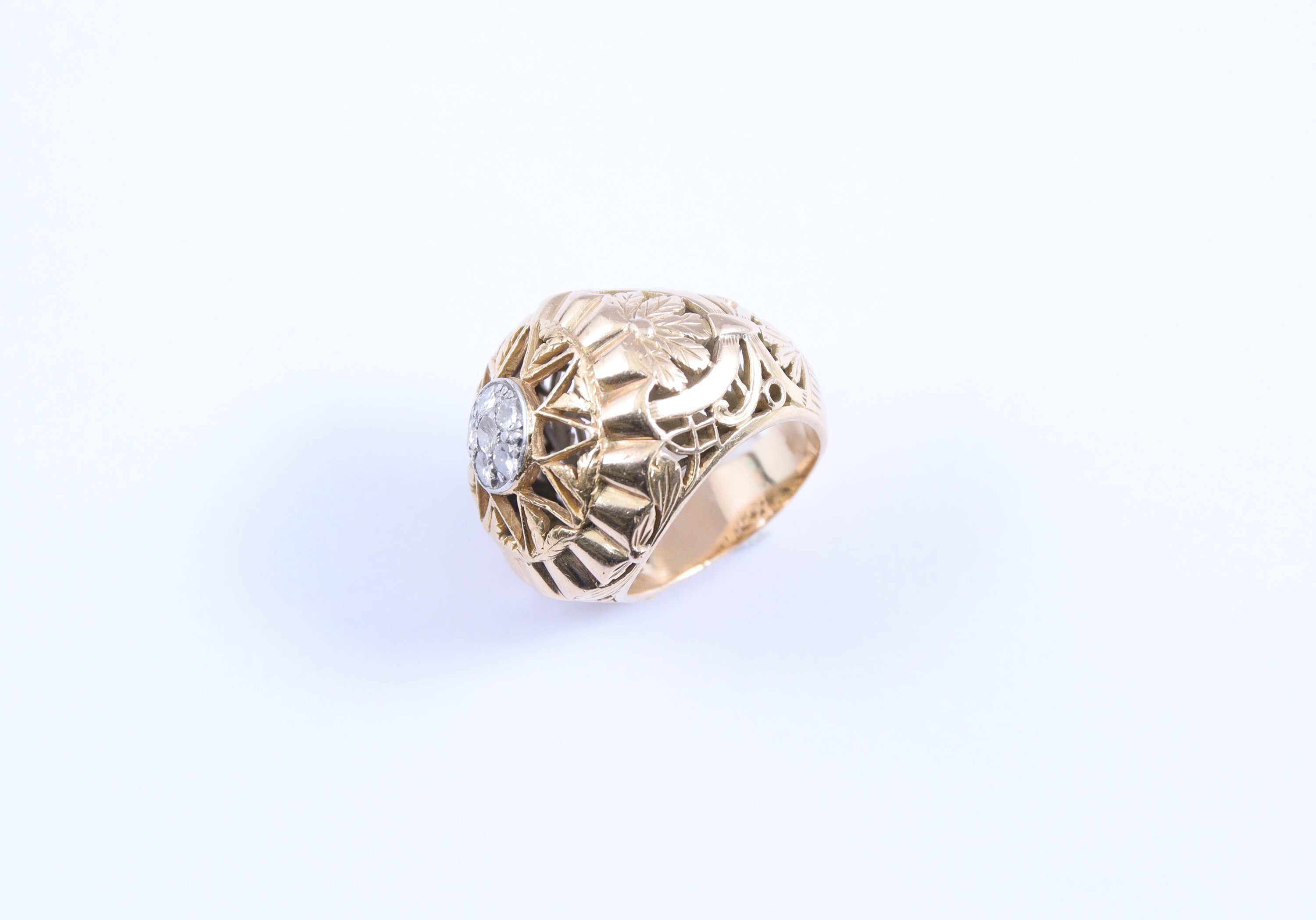 BAGUE en or jaune 750 millièmes ornée en son centre de six DIAMANTS disposés en fleurs dans une étoile ajourée. Fin travail de treillage et de fleurs ajourés à l'intérieur de l'anneau.