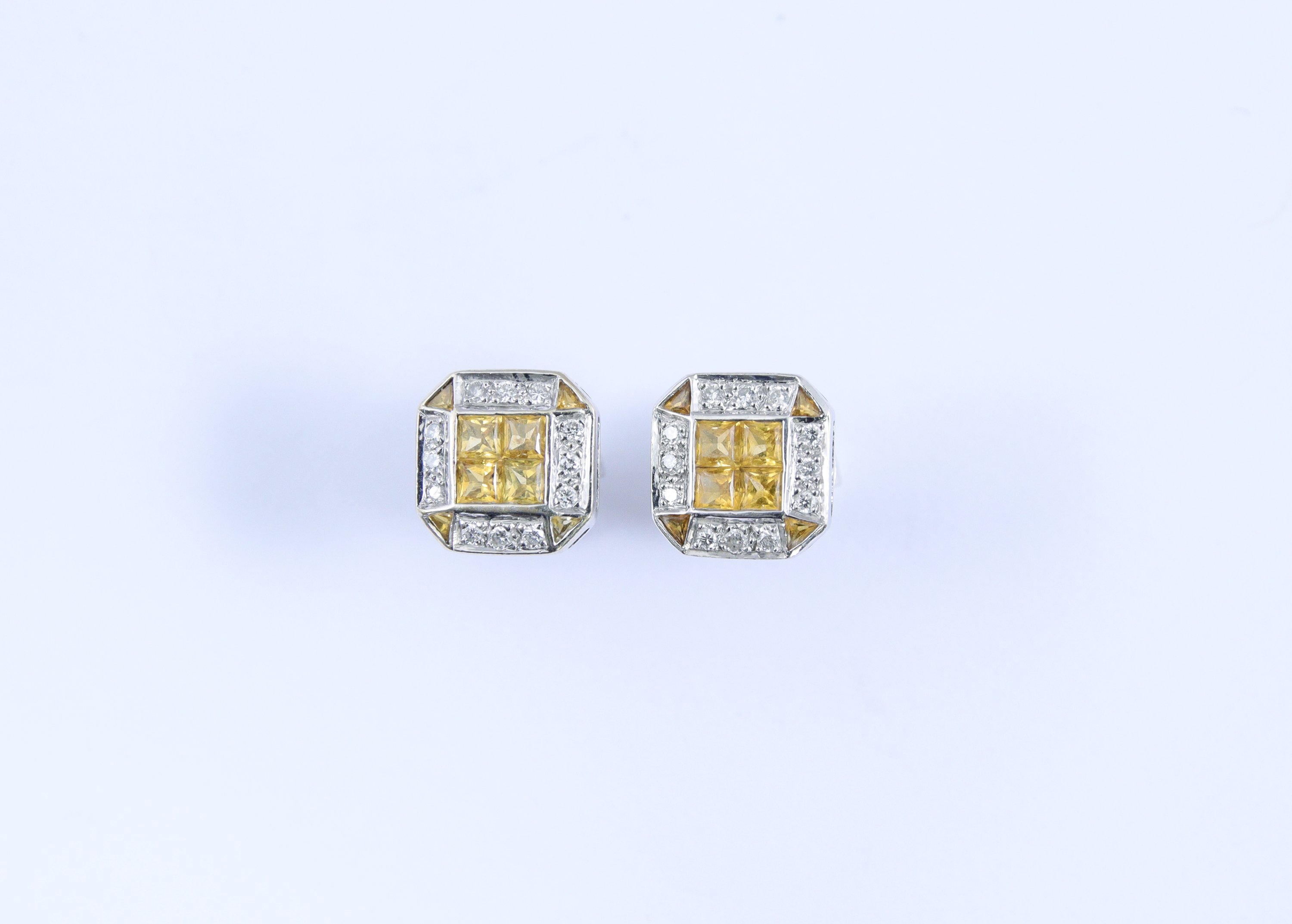 PAIRE de BOUCLES d'OREILLES en or gris 750 millièmes chacune de forme octogonale ornée de SAPHIRS jaunes calibrés et de DIAMANTS ronds de taille brillant.