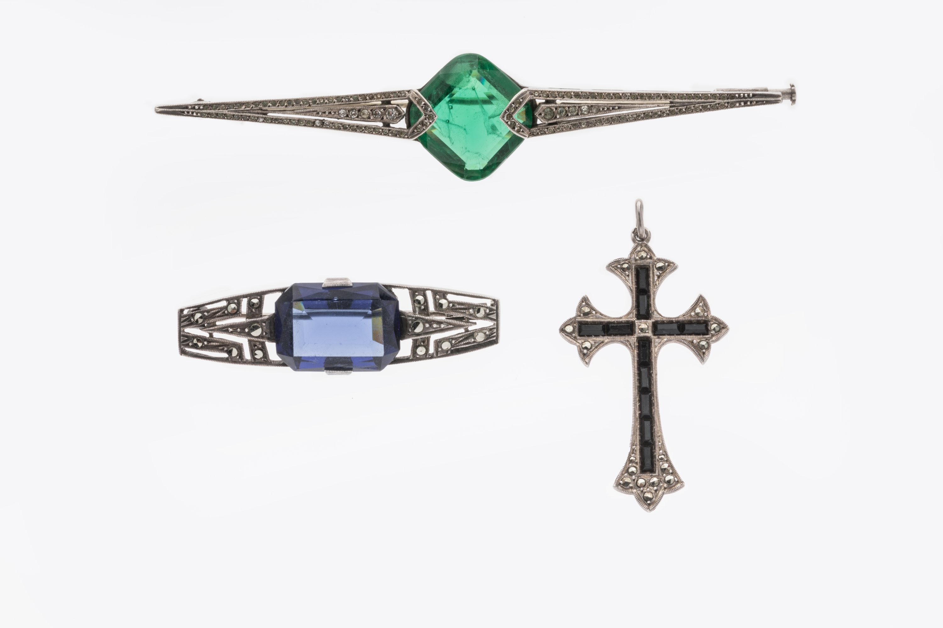 Deux BROCHES BARRETTES et une CROIX PENDENTIF en argent, ornées de pierres du Rhin avec une pierre verte (ÉMERAUDE?), verre bleu ou ONYX.