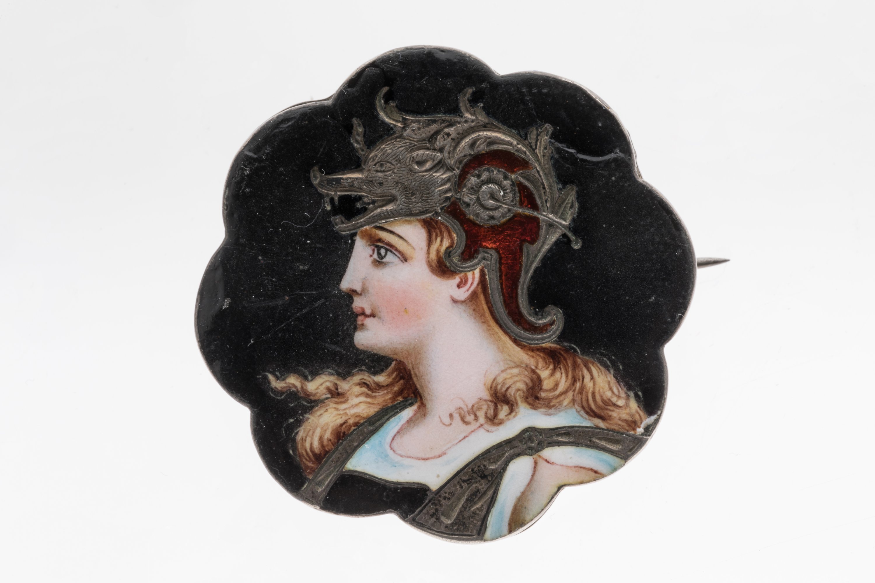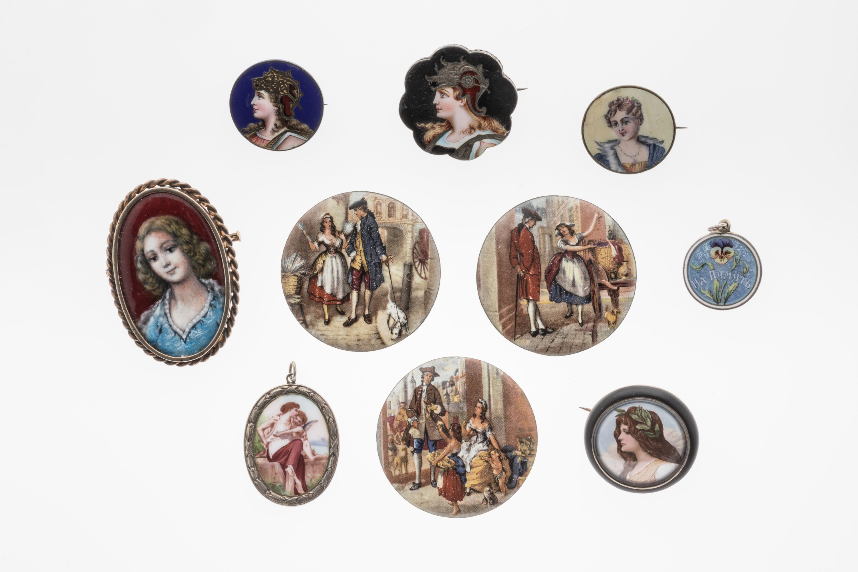 SUITE D'ÉMAUX, comprenant trois médaillons aux scènes galantes sur métal, cinq BROCHES dont une sur argent, deux pendentifs.