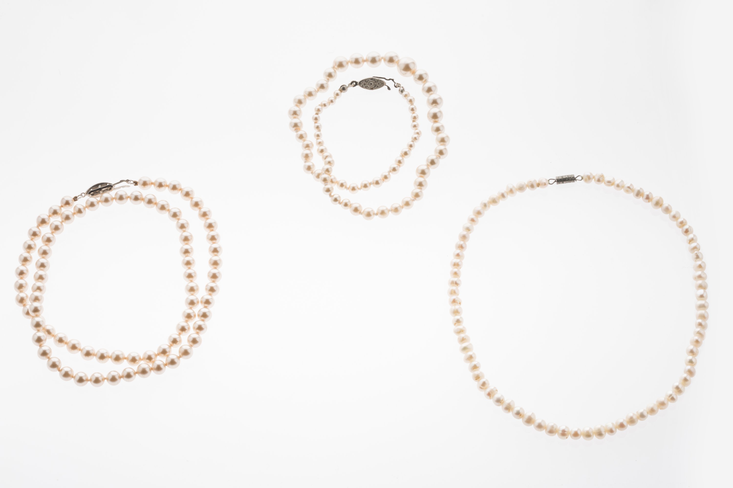 Trois COLLIERS DE PERLES de culture à un rang. Le premier choker, de type matinée (Long. 56 cm), le deuxième en chute, de type ras-de-cou (Long. 42,5 cm), le troisième, choker, de type ras-de-cou (Long. 38 cm).