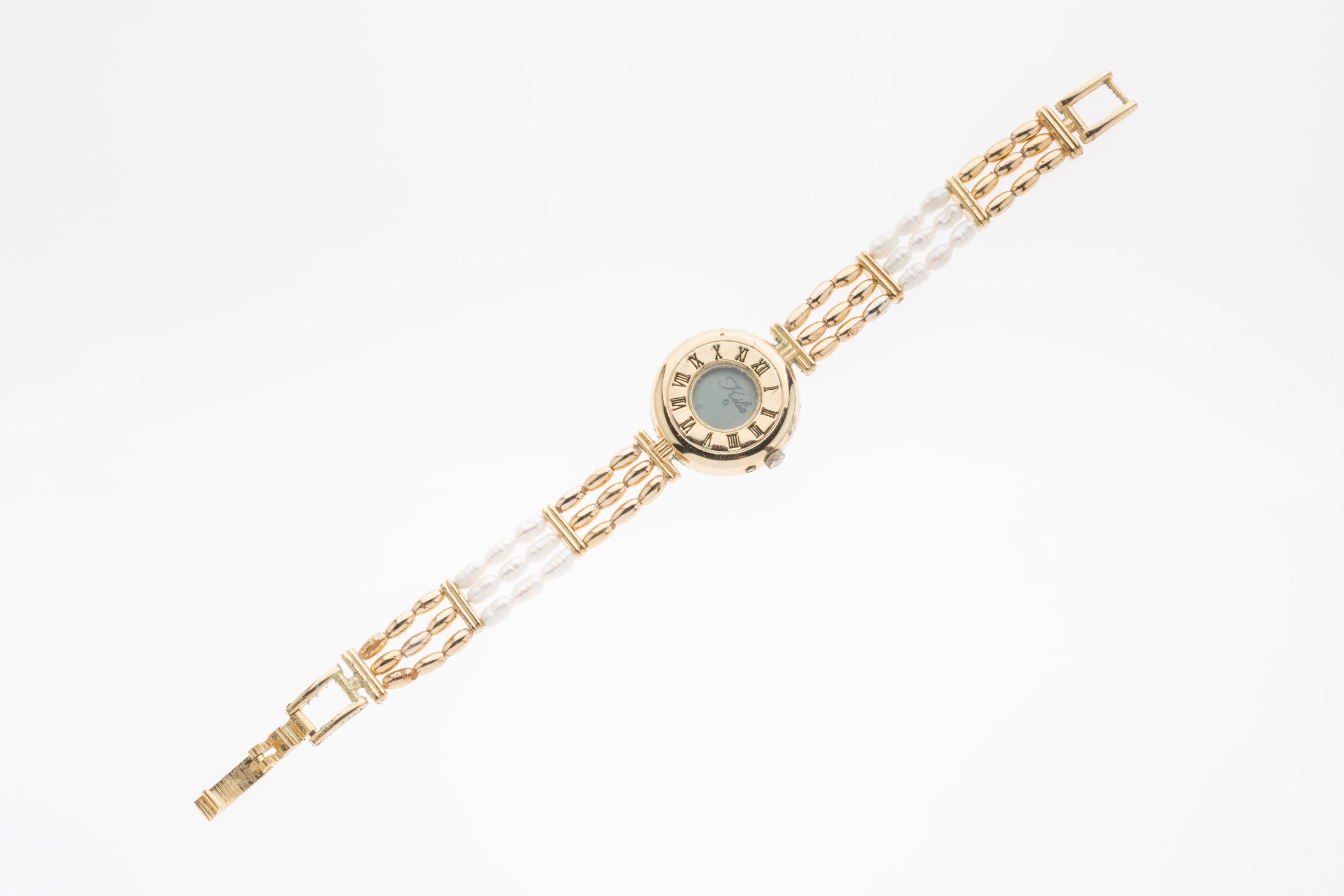 JOINT: MONTRE BRACELET en métal doré KELIA à cadran à chiffres romains. Le bracelet se compose de maillons en perles de culture et de maillons en métal doré.