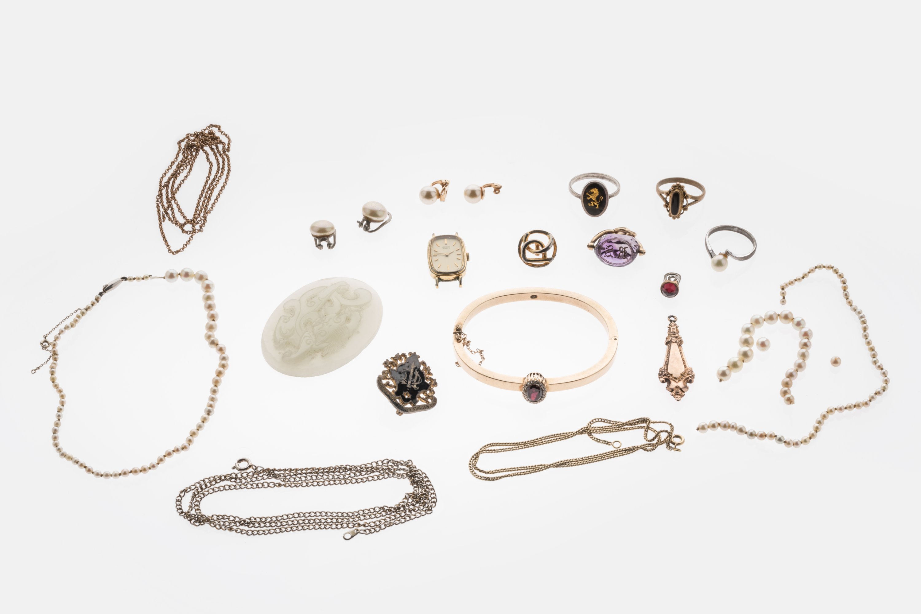 - Parure ornée de PERLES de culture, comprenant un collier monté en chute (Long. totale du collier. env. 52 cm, cassé en trois morceaux), paire de clips en métal doré ornés, paire de boucles d'oreilles en métal et bague en argent (TDD 57).