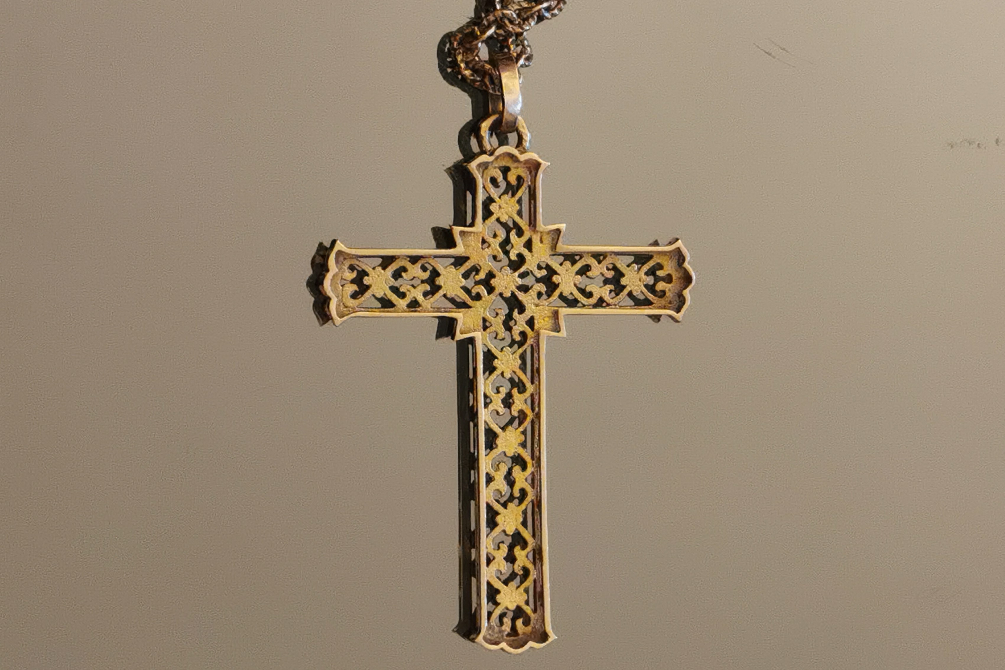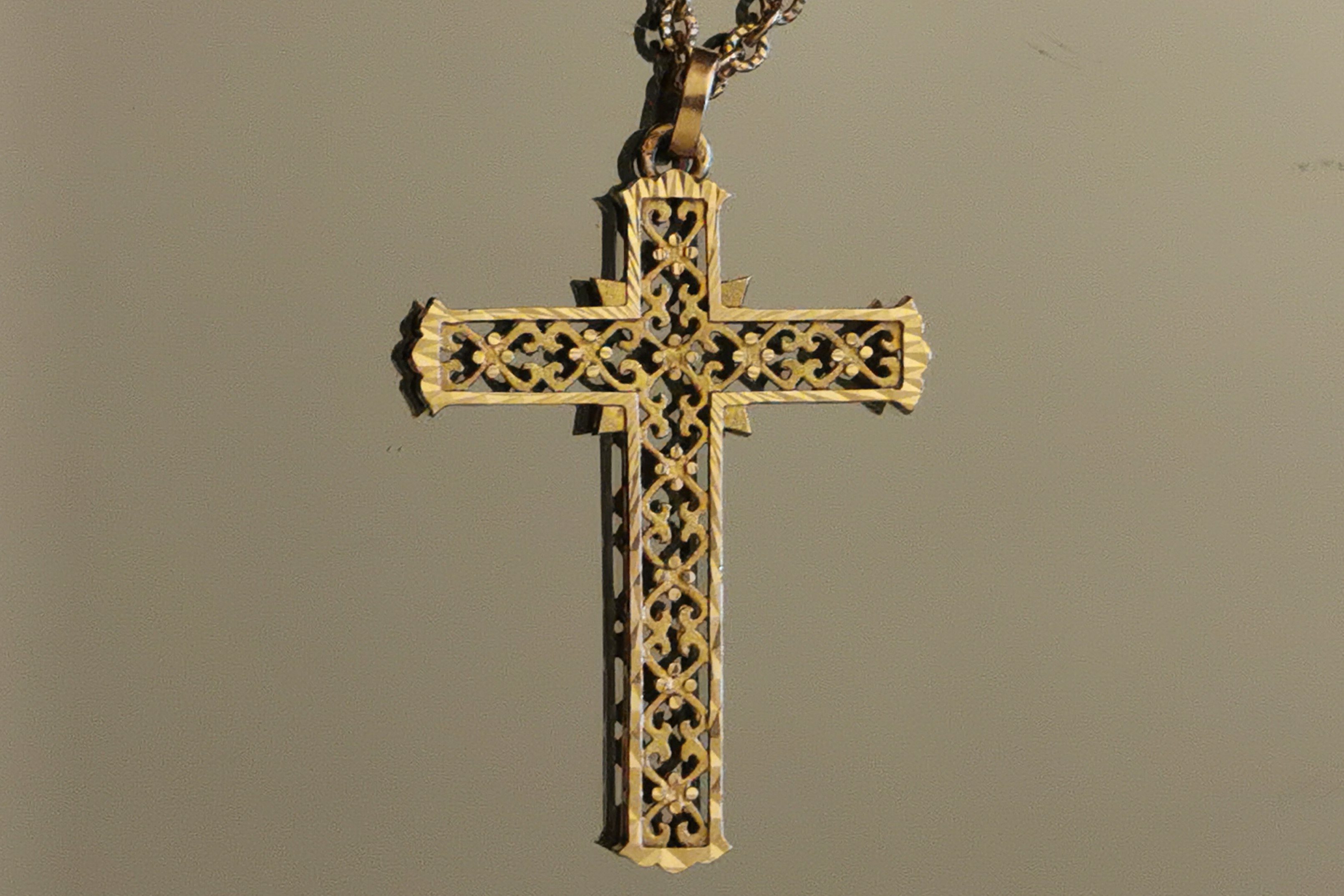 Belle CROIX AUX COEURS AFFRONTÉS en or jaune 750 millièmes aux motifs ajourés (Haut. 41 mm). CHAÎNE en or jaune 750 millièmes à mailles forçat avec sa chainette de sécurité (Long. 50 cm).