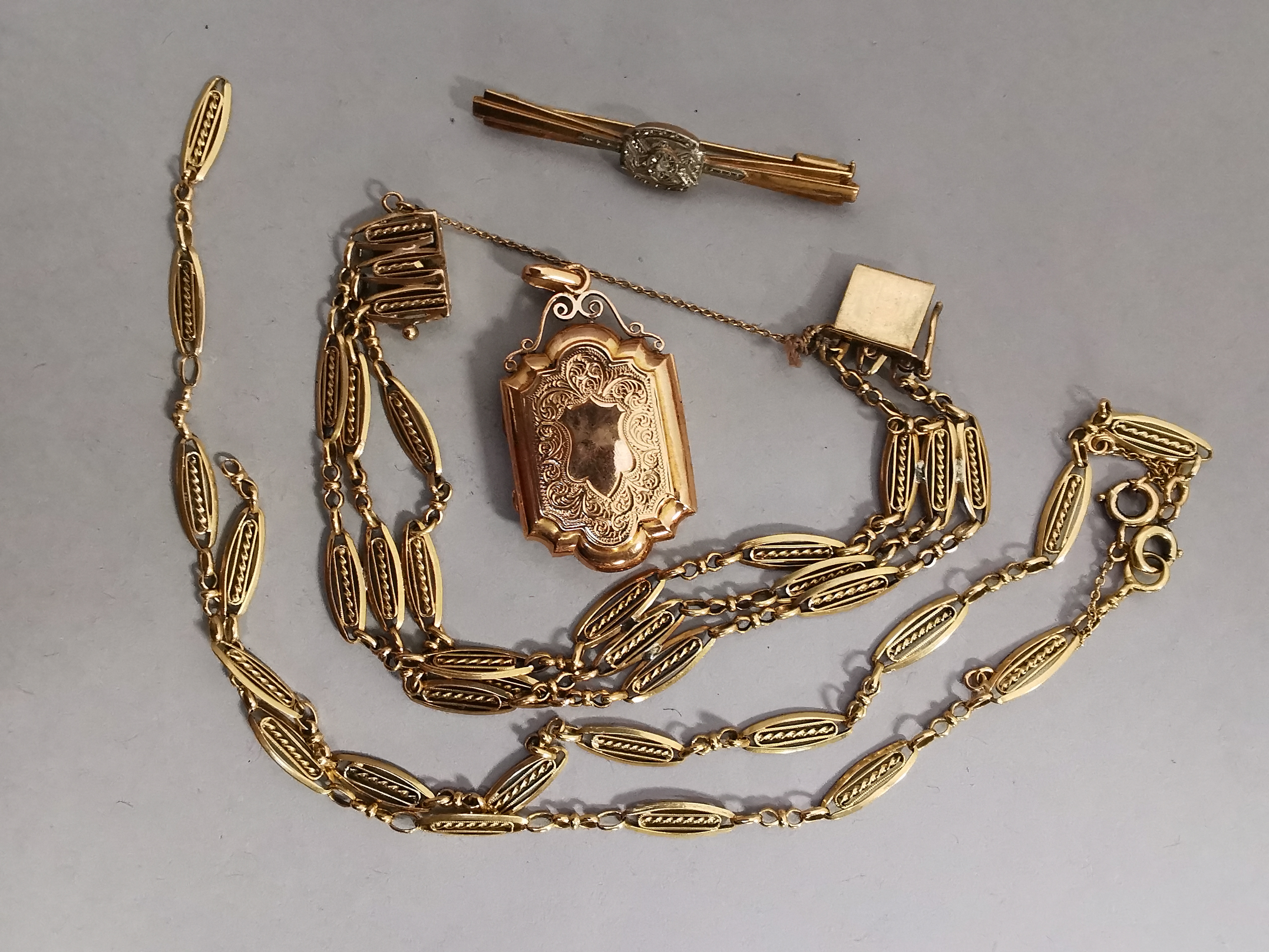 JOINT: MÉDAILLON PORTE PHOTO et BROCHE ornée de brillant en or jaune 750 millièmes. Poids brut 18,6 g.