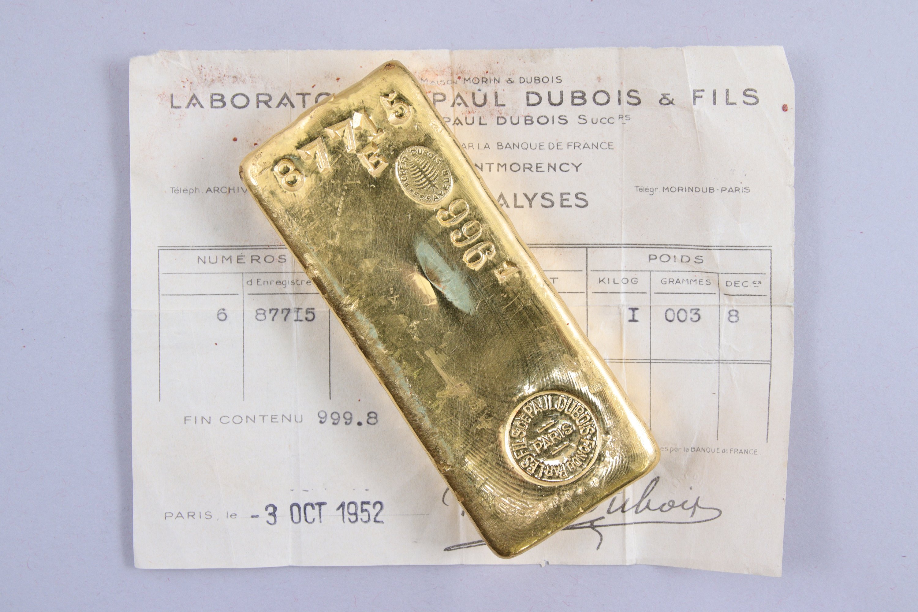 LINGOT OR. Bulletin d'essais du 3 octobre 1952: n°87715. Titre d'or 996,1. Poids brut 1.003,8 g. Or fin 999,8 g.