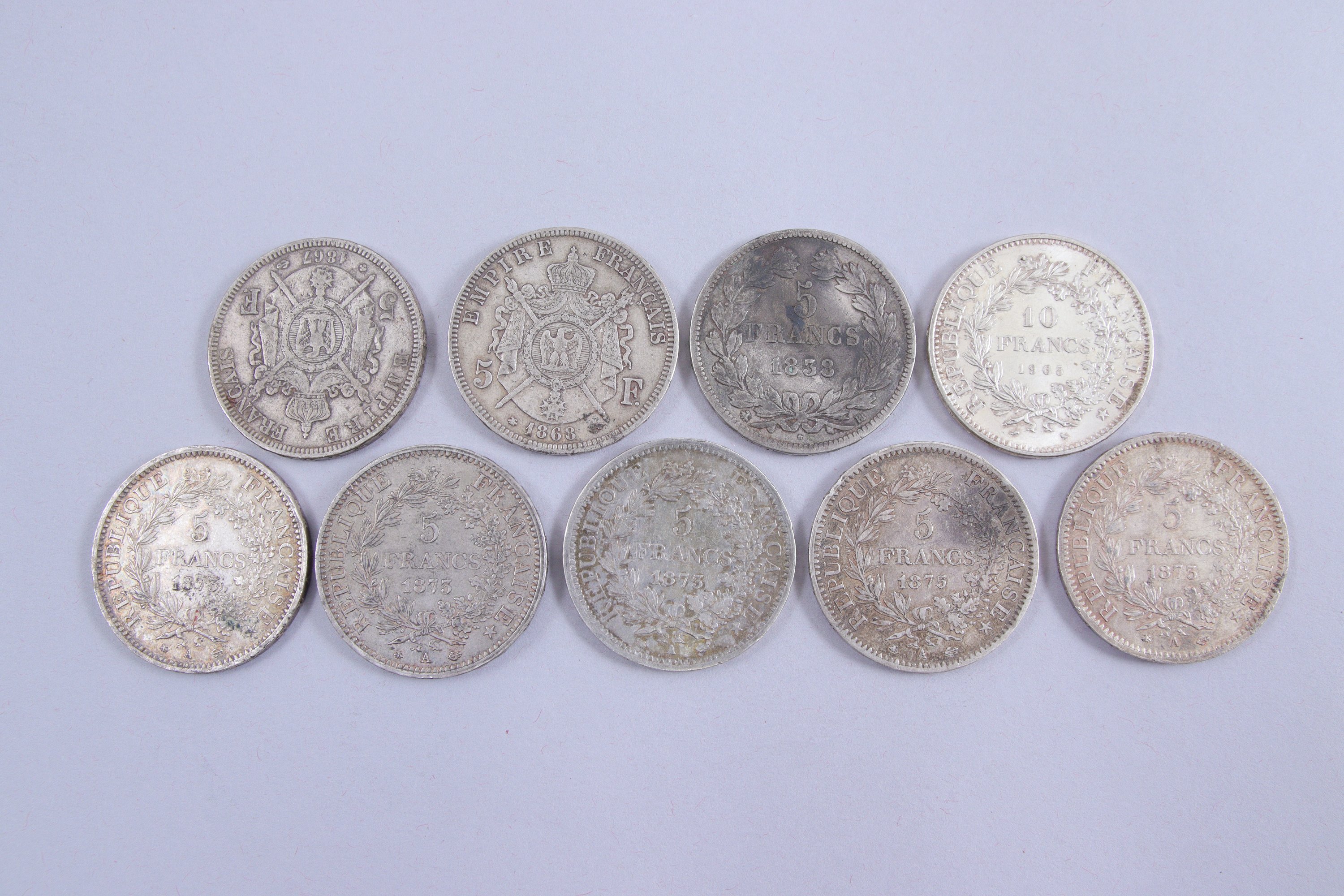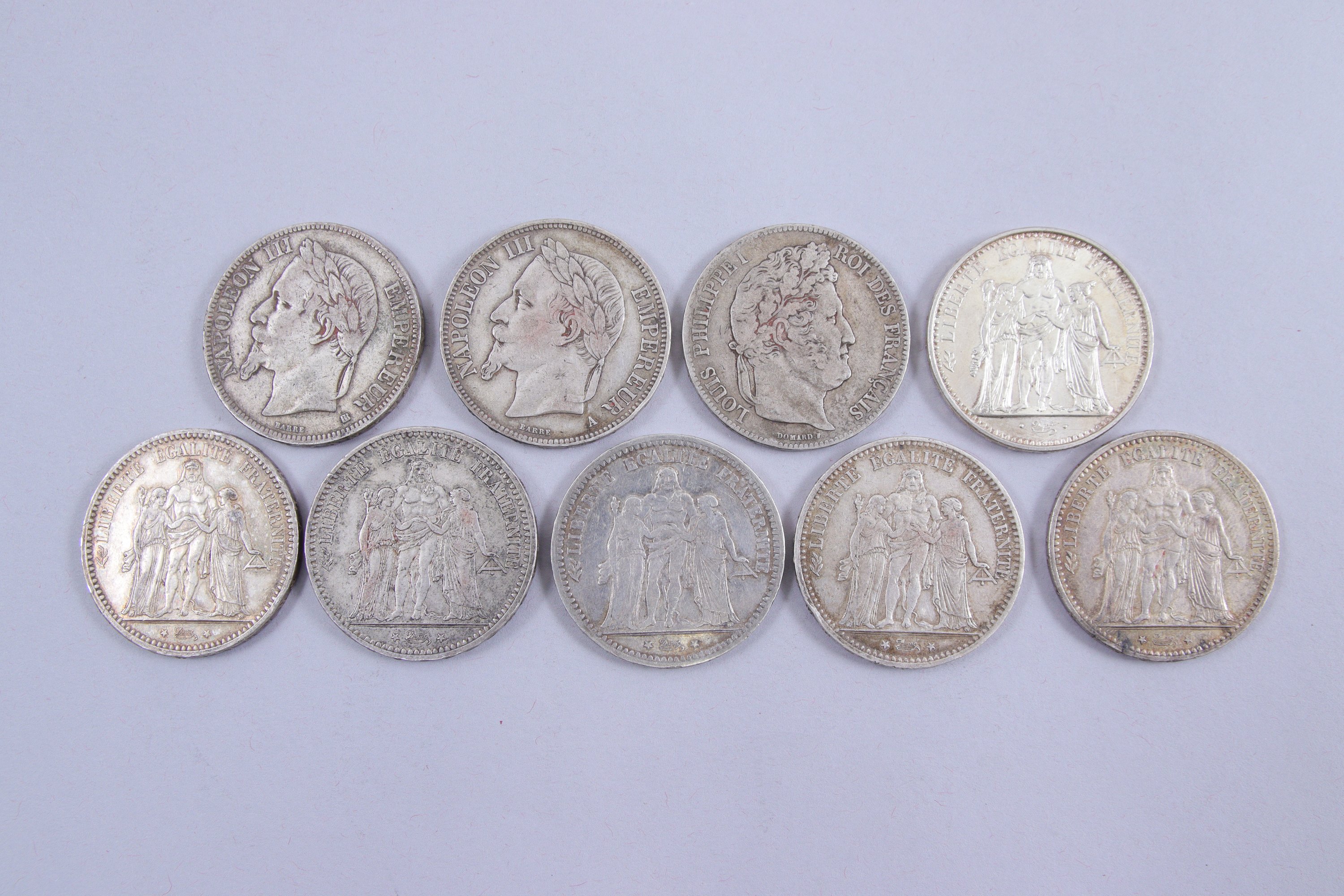 FRANCE. 8 PIÈCES de 5 FRANCS ARGENT comprenant: 1 PIÈCE Louis-Philippe 1838, 2 PIÈCES Napoléon III, 1867 et 1868, 5 PIÈCES Hercule 1873 et 1875.