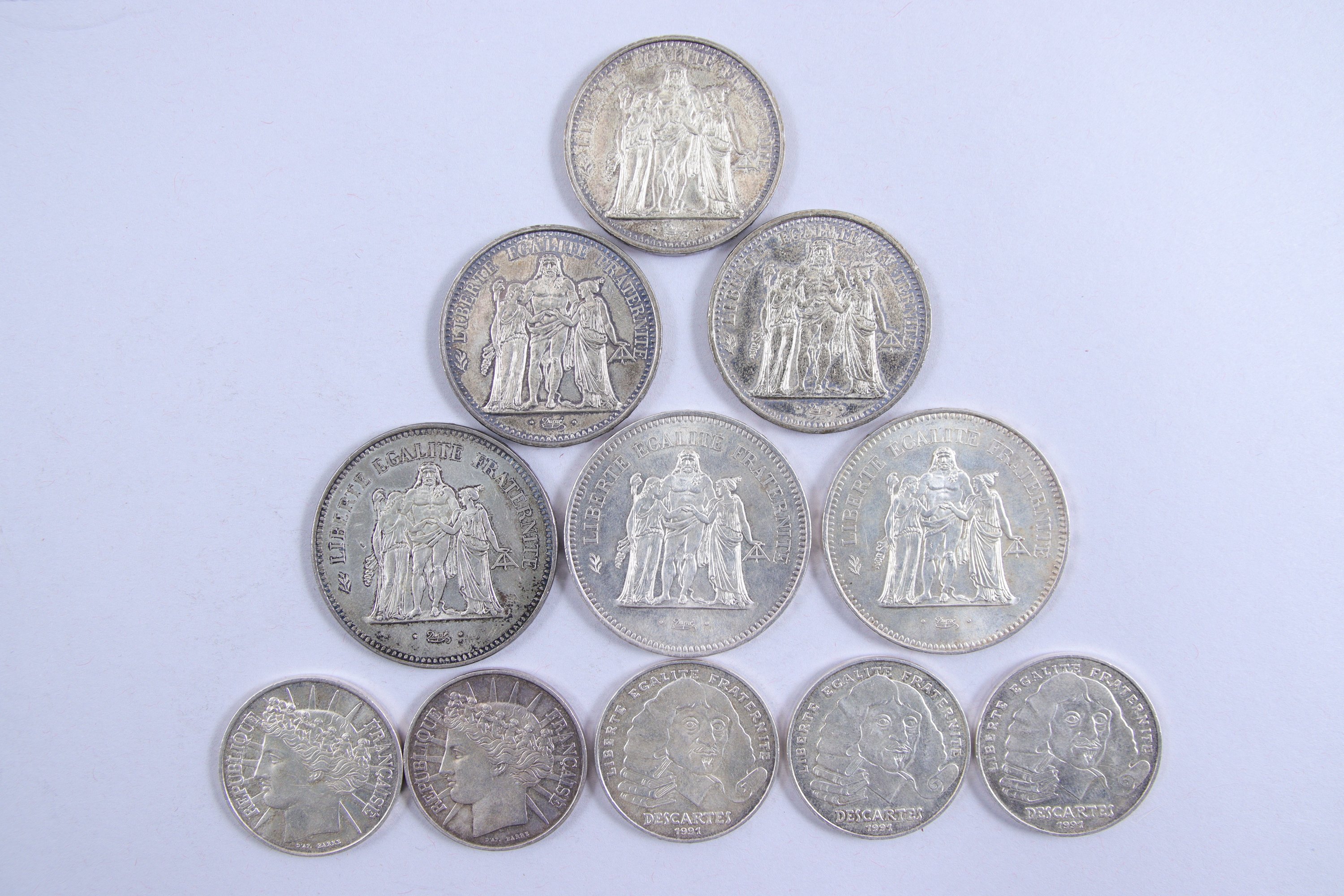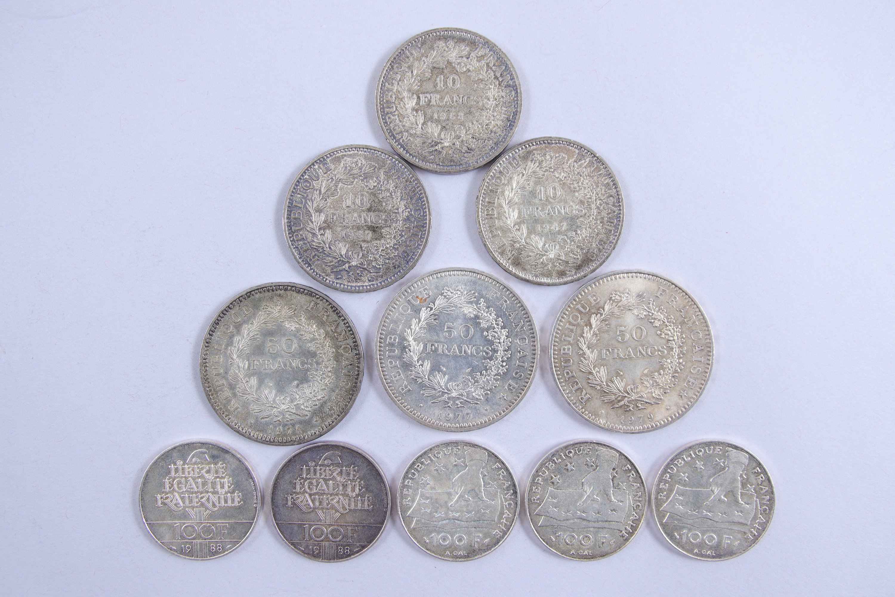 FRANCE. 12 MONNAIES en ARGENT: 5 x 100 FRANCS (1988, 1989, 1991), 3 x 50 FRANCS (1974, 1977, 1979) et 3 x 10 FRANCS (1967, 1968).