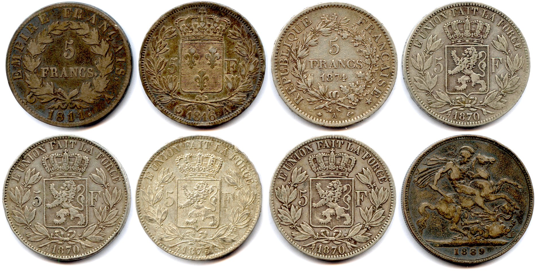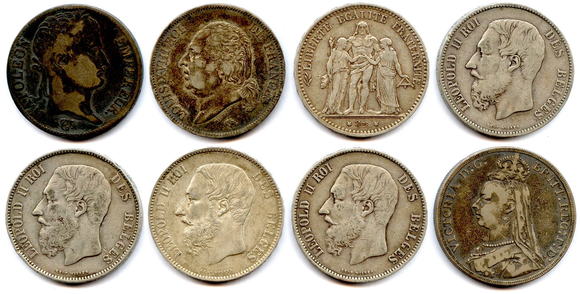 Napoléon Ier 5 FRANCS (tête laurée) 1811 Paris ; Louis XVIII 5 FRANCS 1816 Paris ; IIIe République 5 FRANCS 1874 Paris ; Léopold II roi des Belges 5 FRANCS 1870 (3 ex.) et 1873 ; Victoria Reine dAngleterre Couronne 1889.