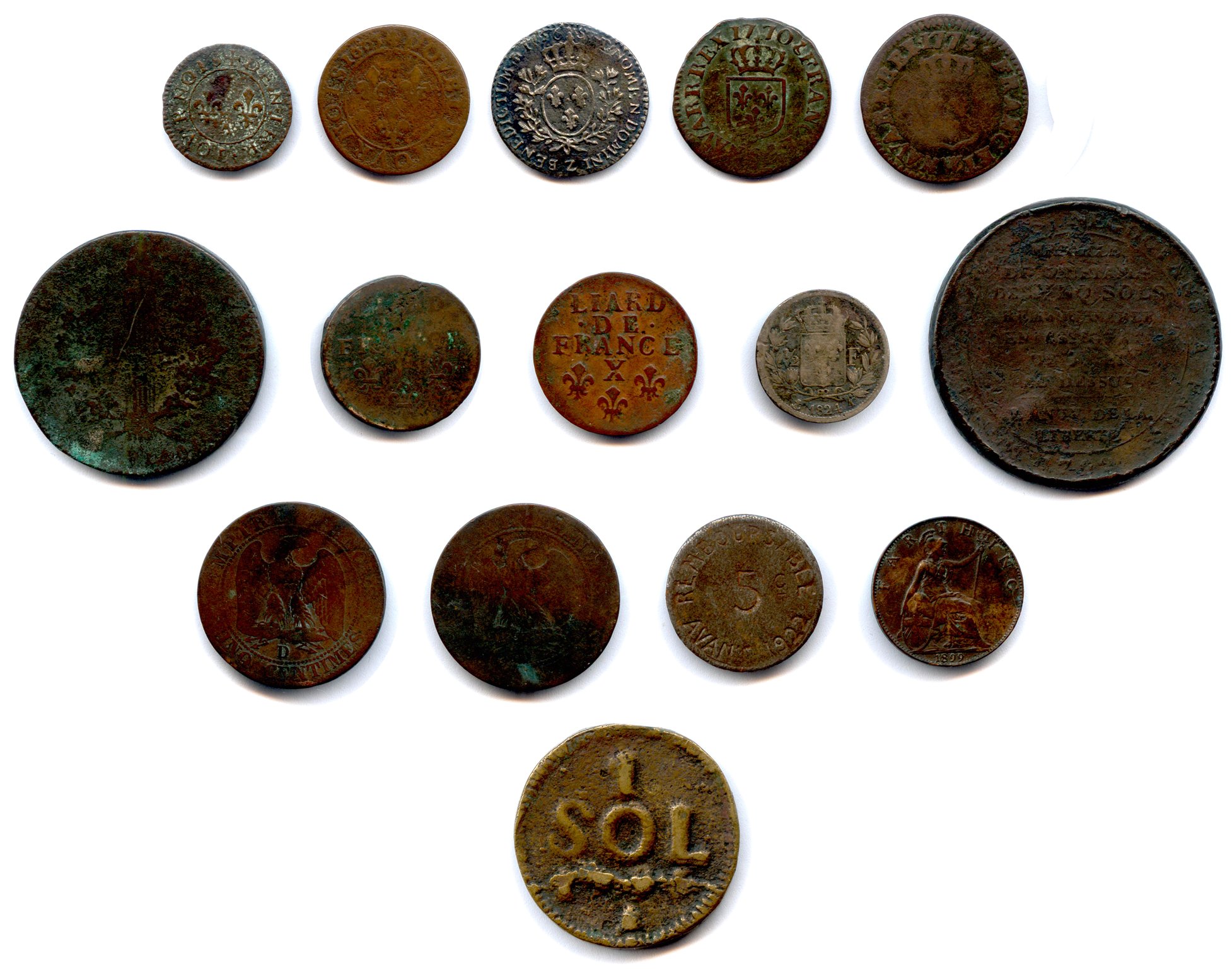 DIXIÈME dÉCU au bandeau de Louis XV 1756 Grenoble ; DEMI-FRANC Louis XVIII 1824 Paris ; SIX MONNAIES en BRONZE de Henri III, Louis XIV et Louis XV (denier tournois, double tournois, Liards ; 2 sols de Louis XVI ; monneron de 5 sols) ; DEUX PIÈCES de 5 CENTIMES Napoléon III ; 5 C. (en fer) Chambre de Commerce Bayonne avant 1922 ; SOL François II du Luxembourg et FARTHING Victoria 1899.