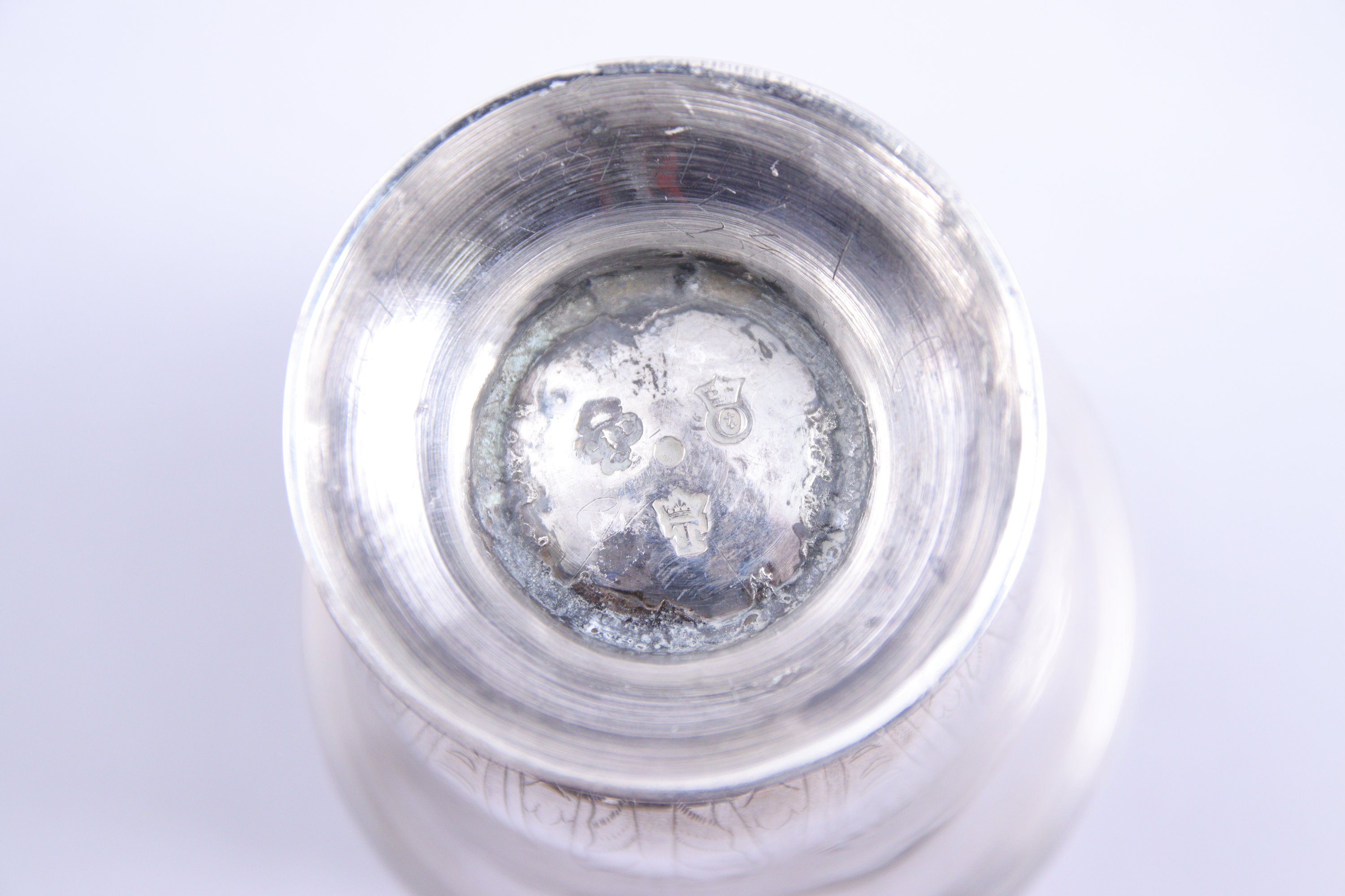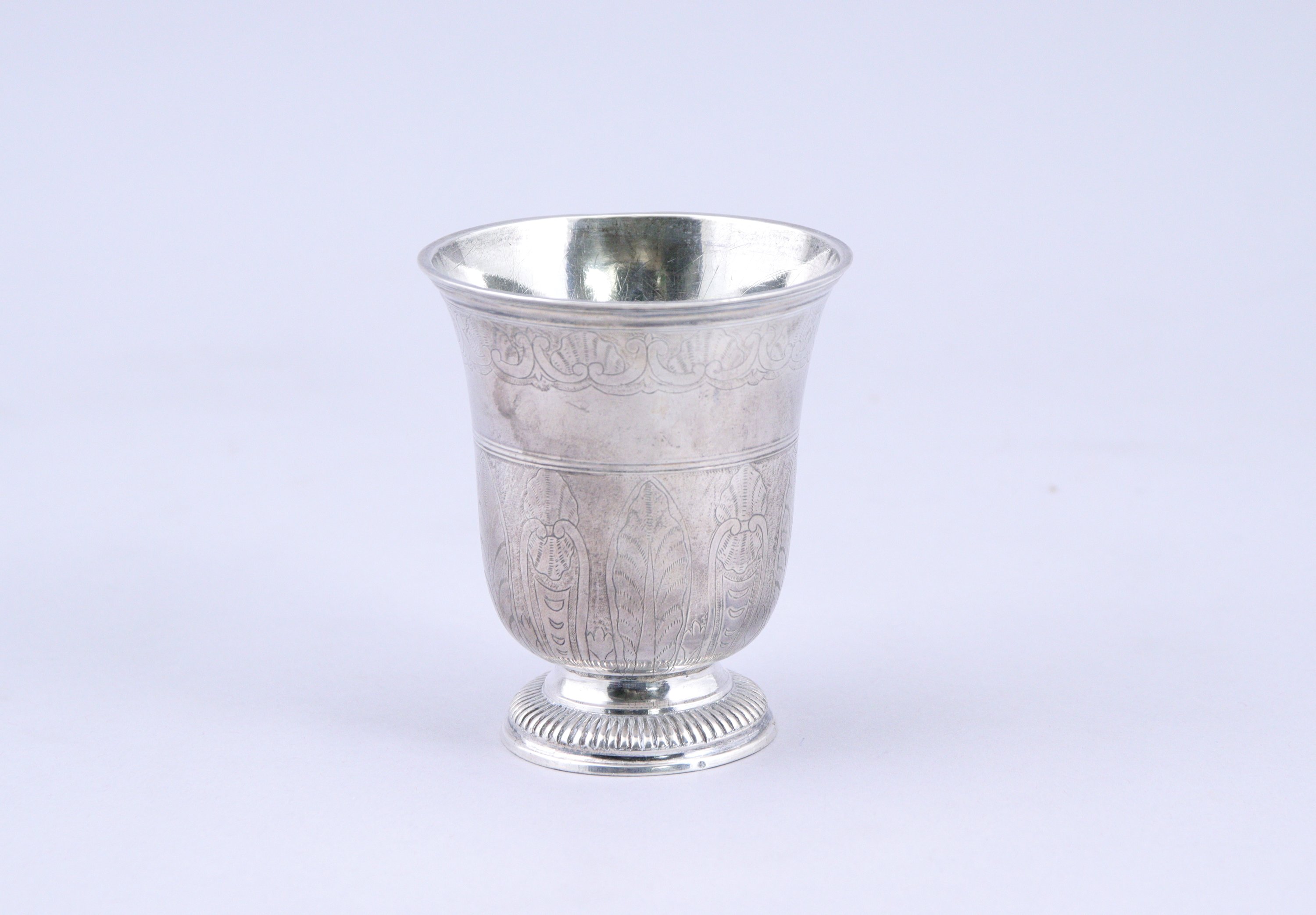 NANTES. TIMBALE TULIPE en argent gravée de feuilles, fleurs de lys et coquilles, sur un piédouche godronnée.
