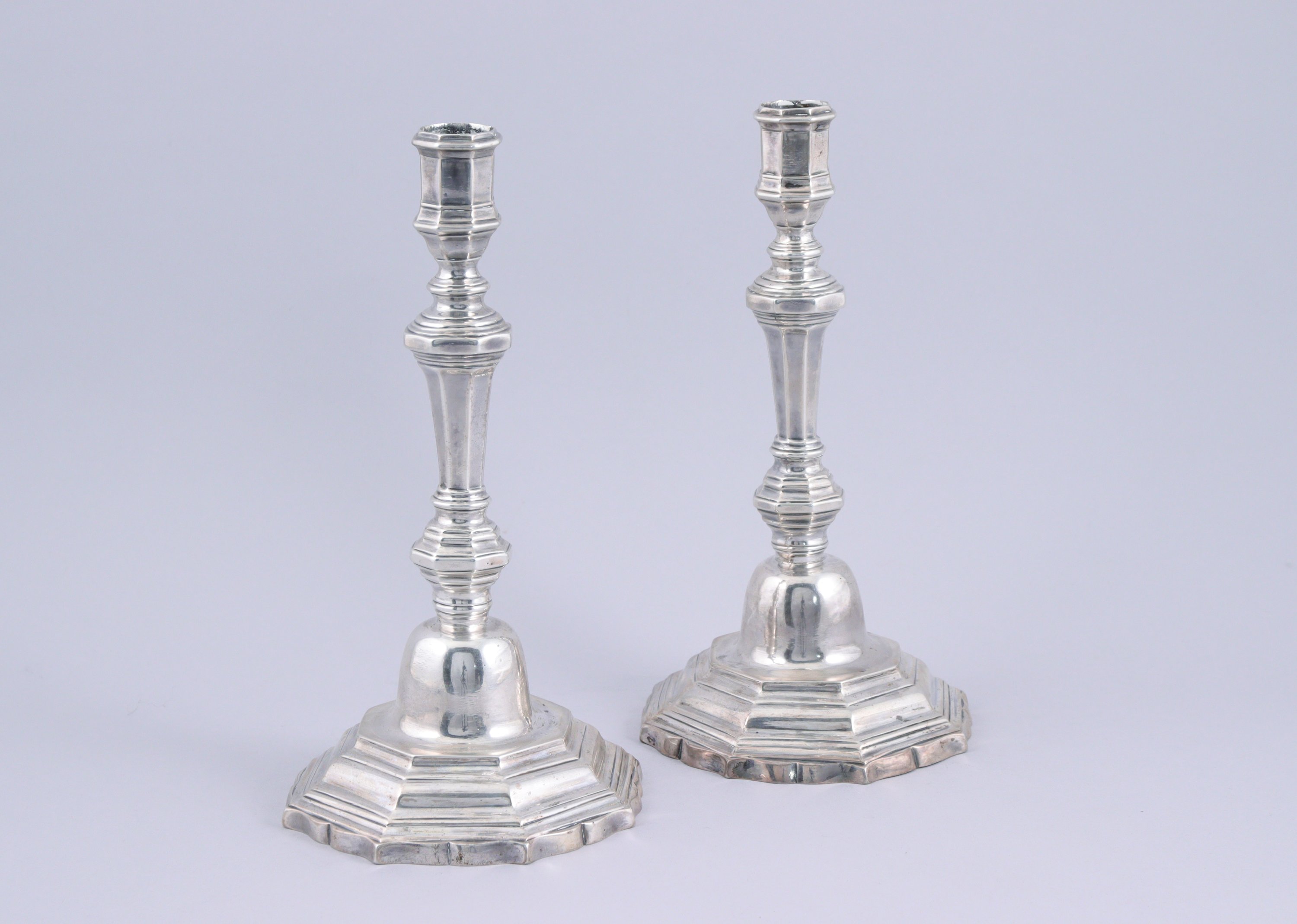 PARIS, début du XVIIIe. PAIRE de FLAMBEAUX en argent, la base octogonale légèrement mouvementée, le fût à pans coupés comme son binet. Ils sont ornés de blasons surmontés de couronnes comtales.