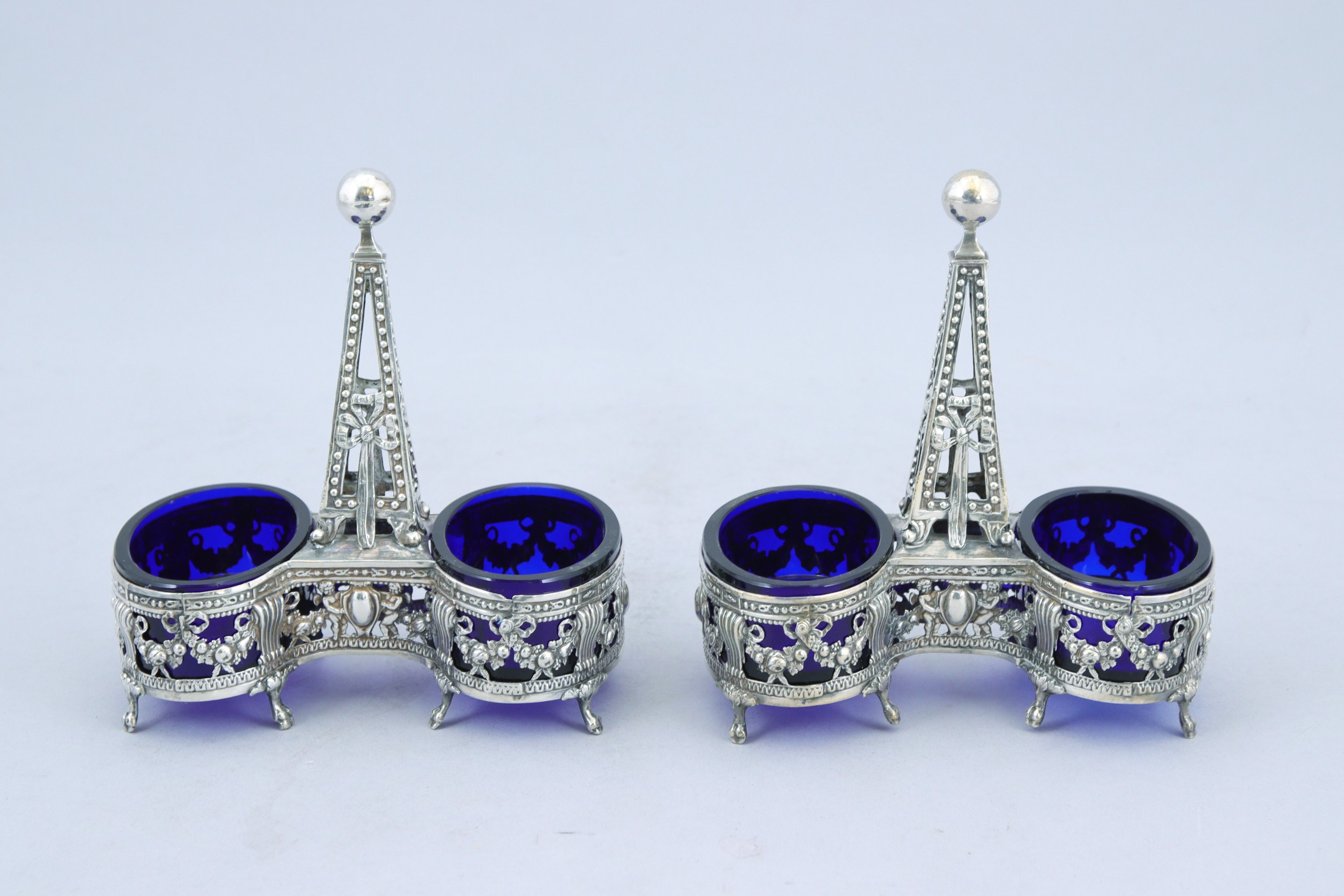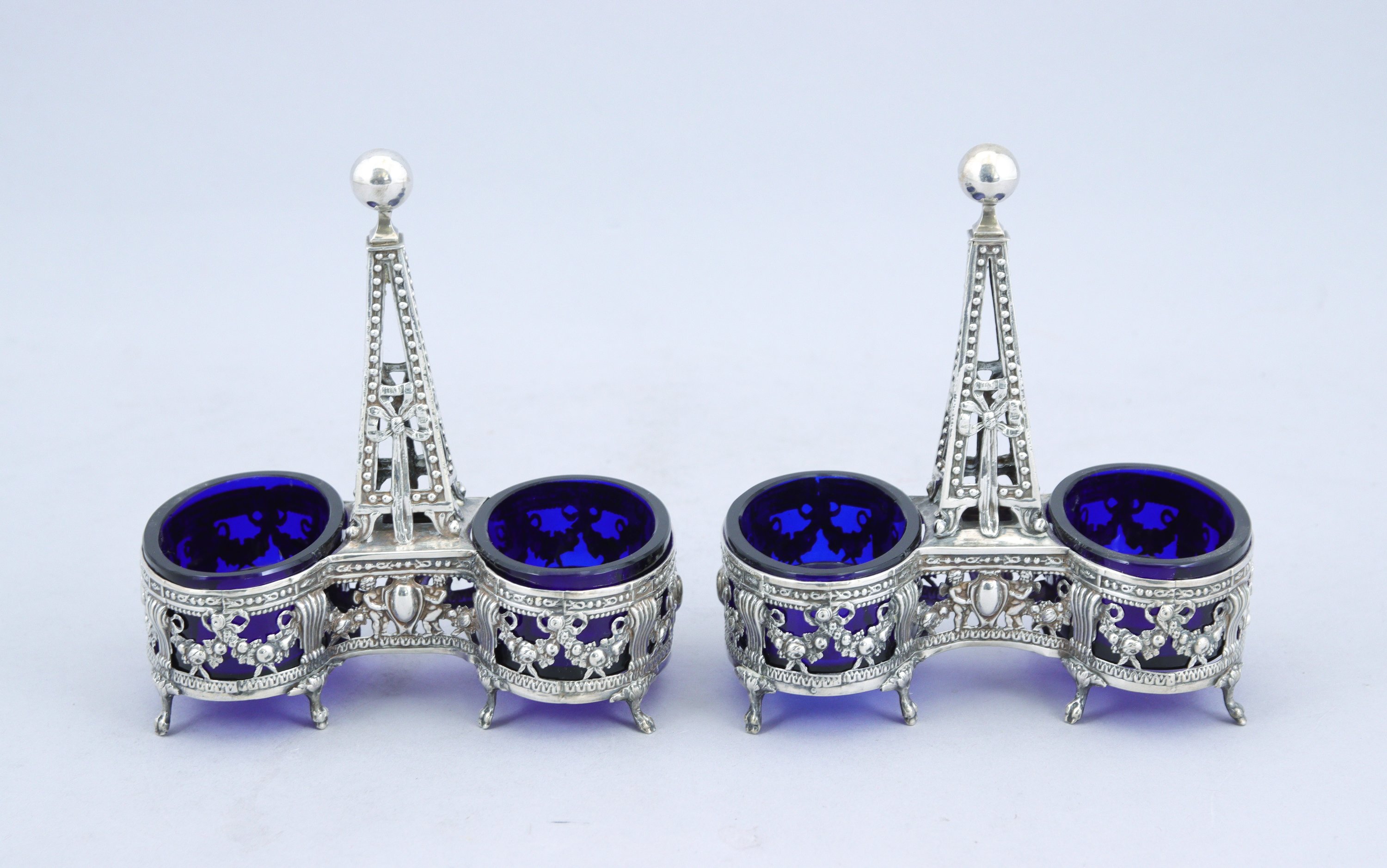 PAIRE de SALERONS en argent, la prise en forme de boule soutenue sur une pyramide ornée de nuds. La ceinture présente des guirlandes végétales et putti tenant un cuir. Reposent sur des pieds de biche.