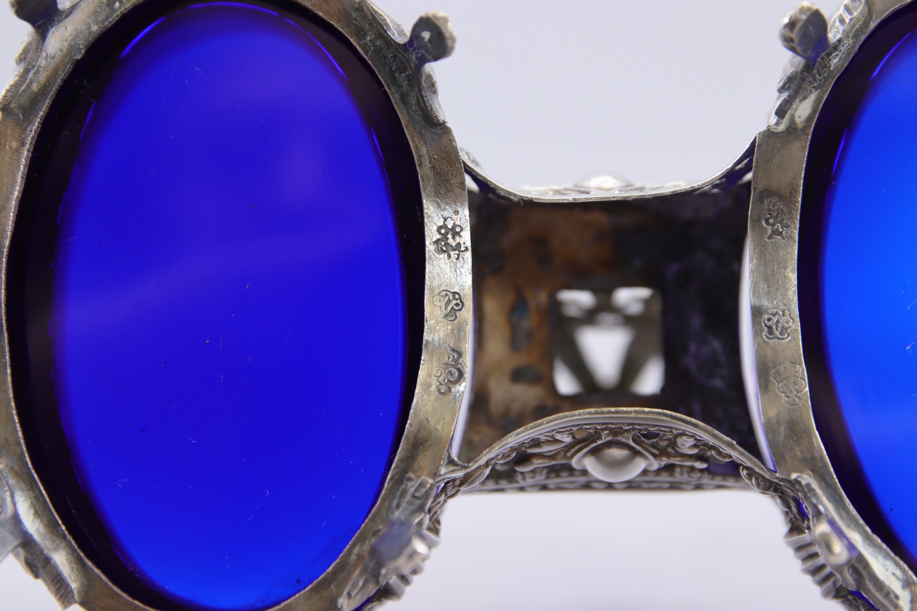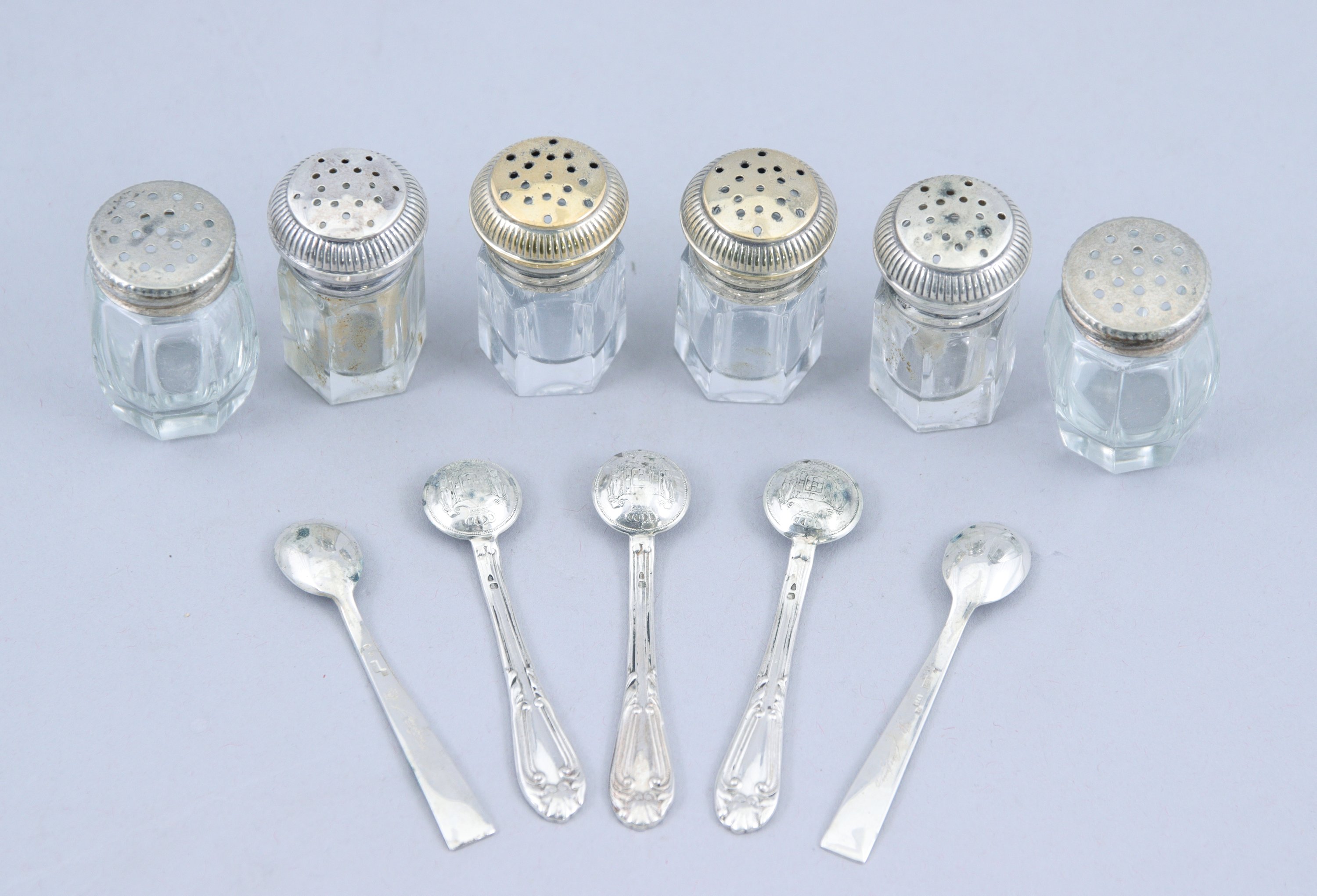 - SIX SALERONS en verre, dont quatre au bouchon en argent et deux en métal argenté.