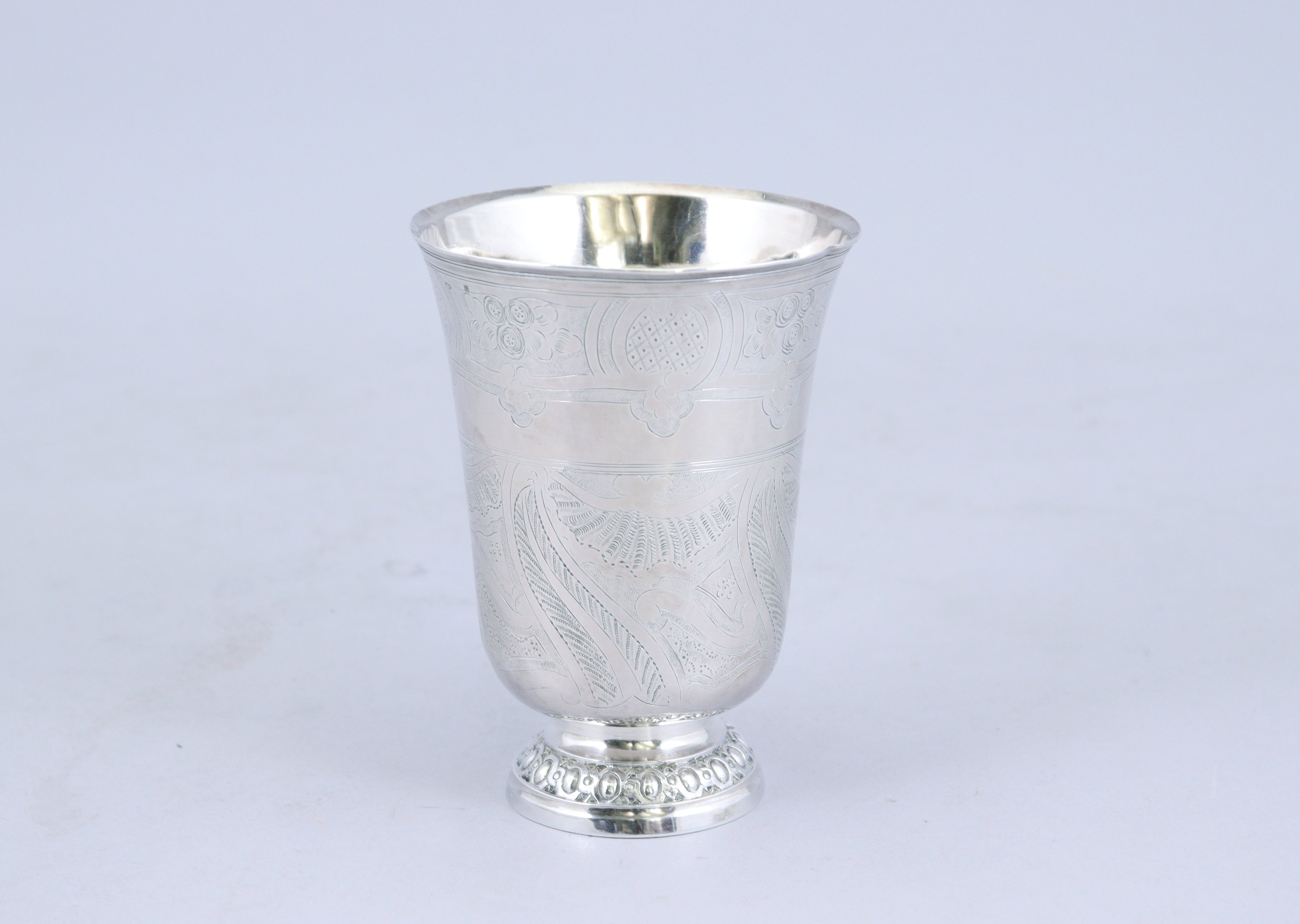 PARIS, 1787. TIMBALE de forme tulipe en argent à décor gravé de rinceaux et motifs végétaux. Le pied orné d'oves et dards.