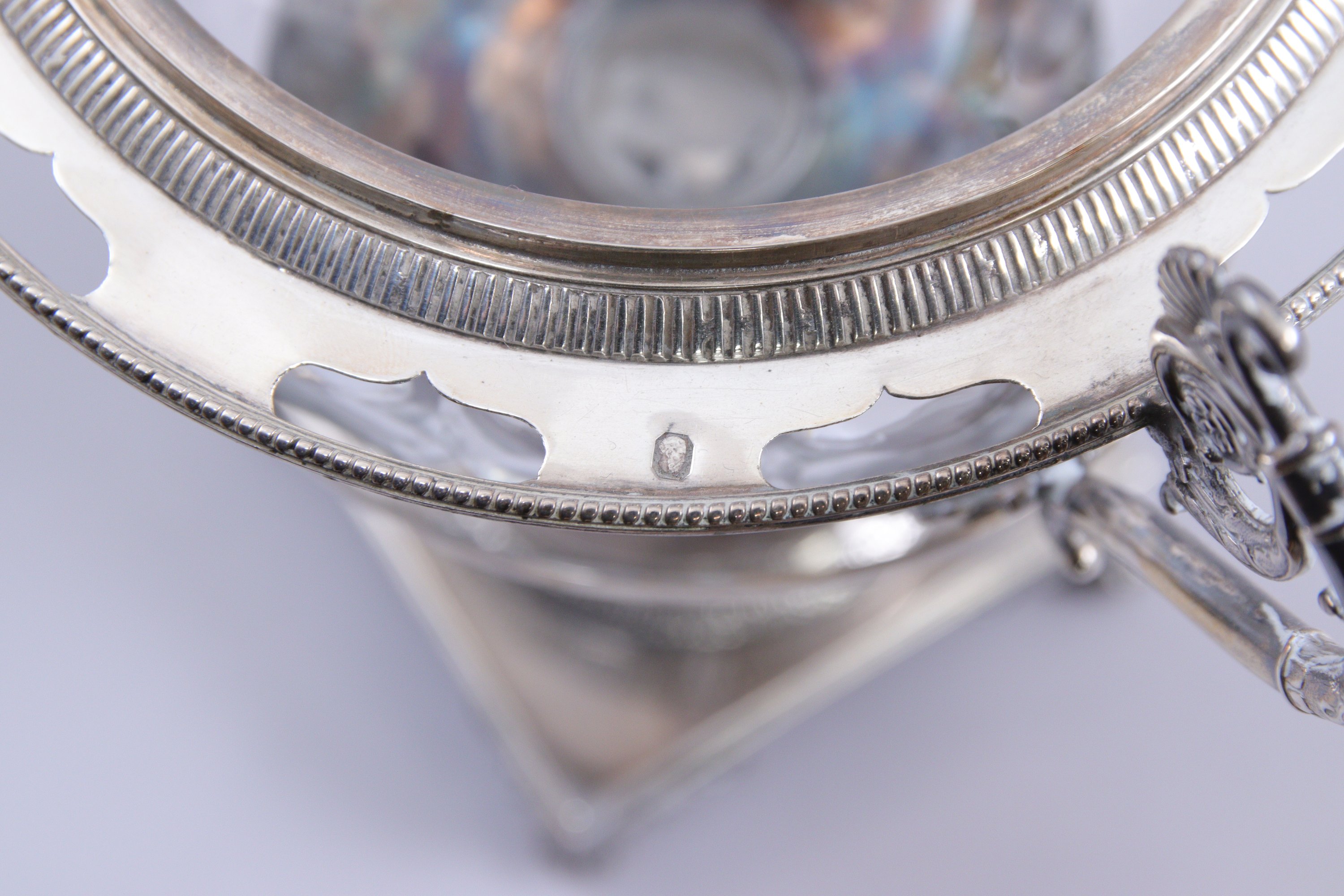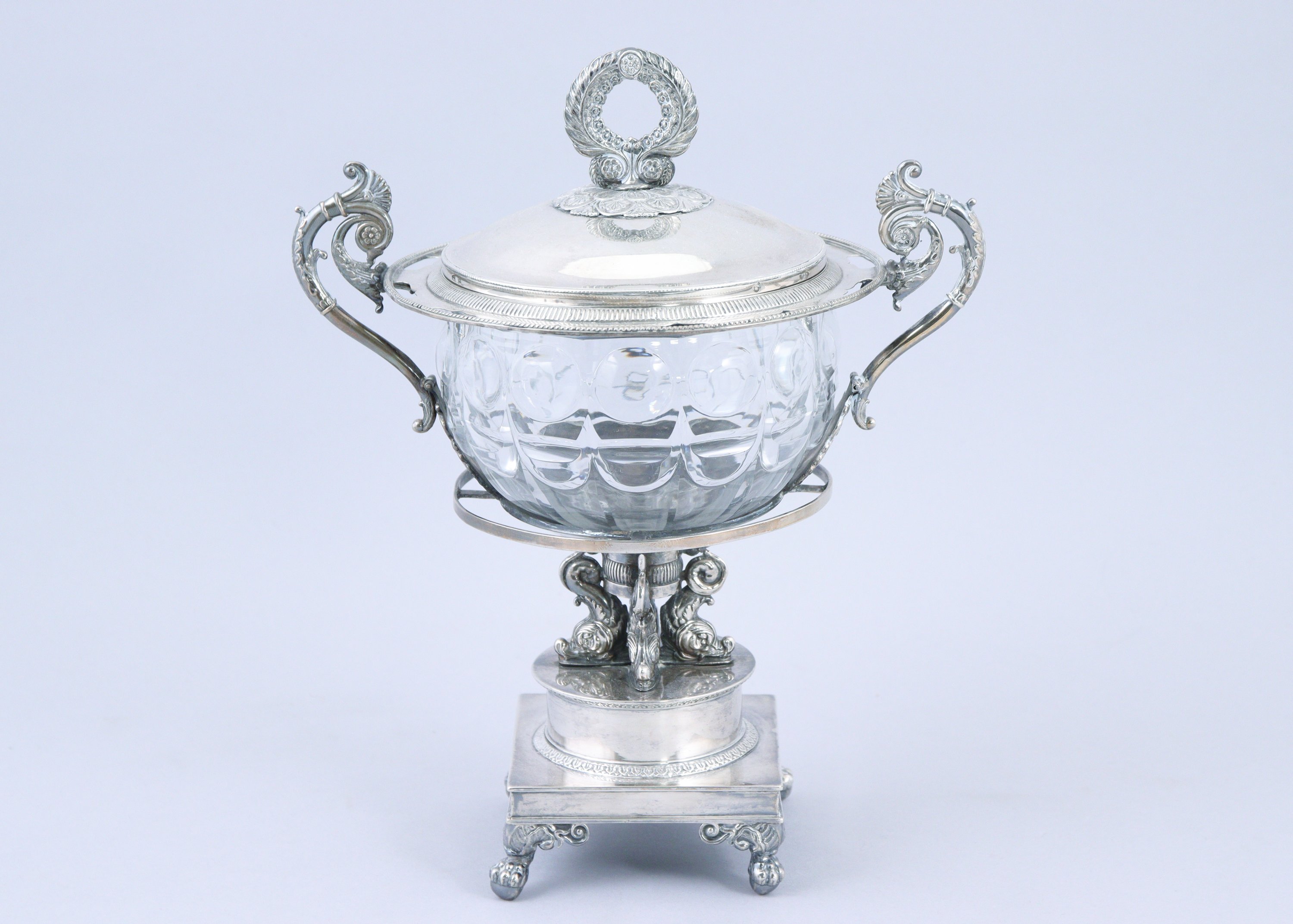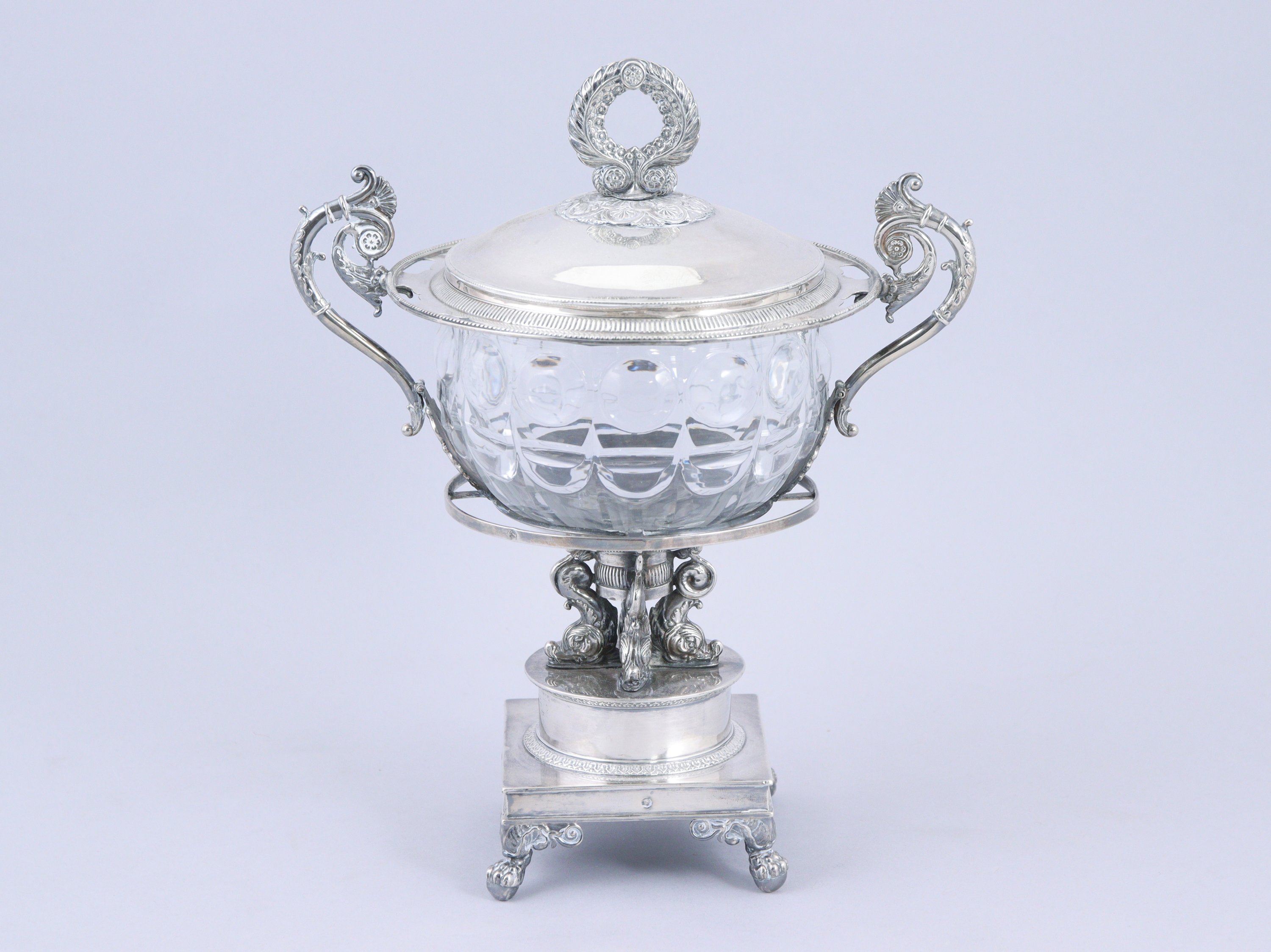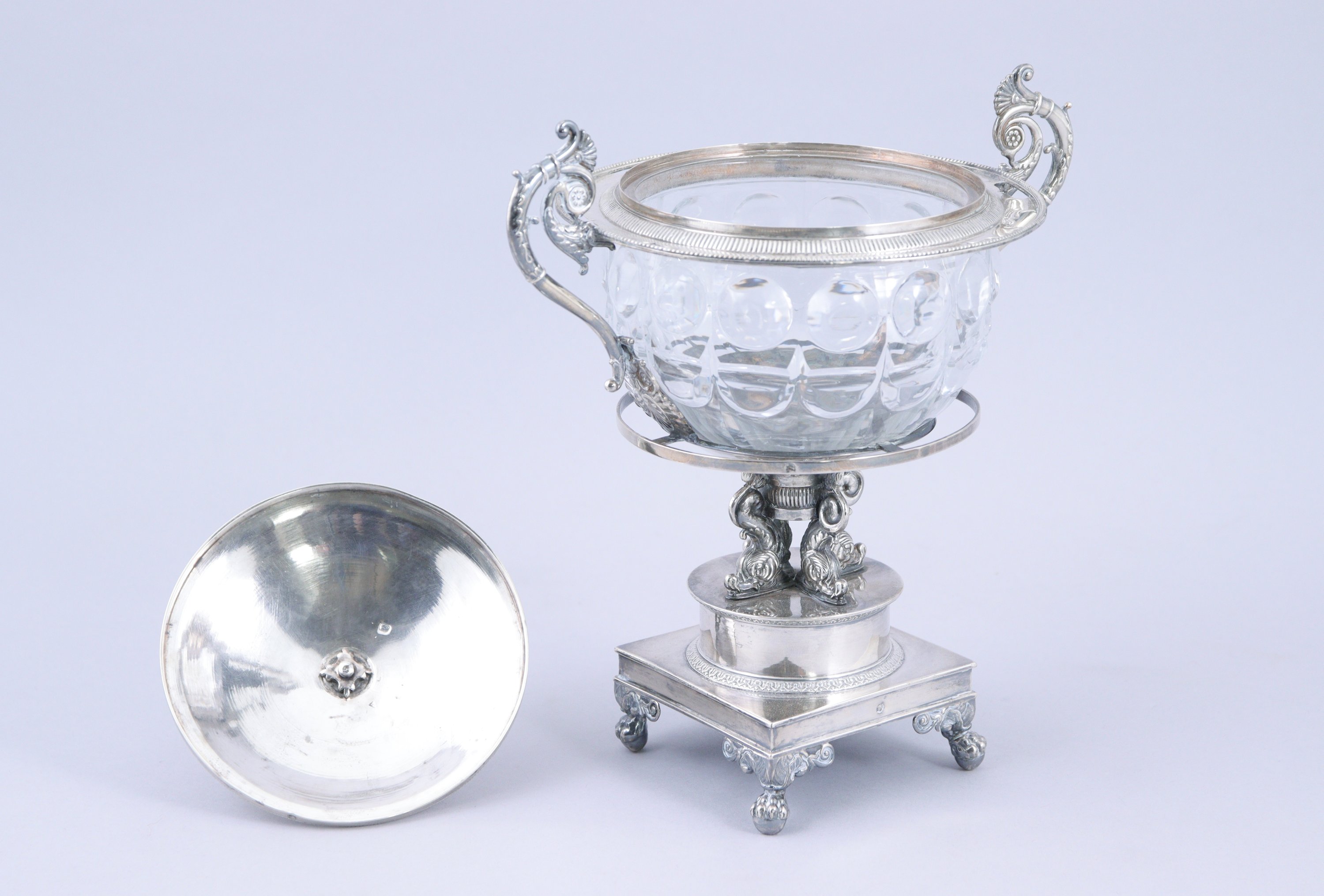 CONFITURIER en argent et cristal, reposant sur quatre pieds griffes enserrant des boules.