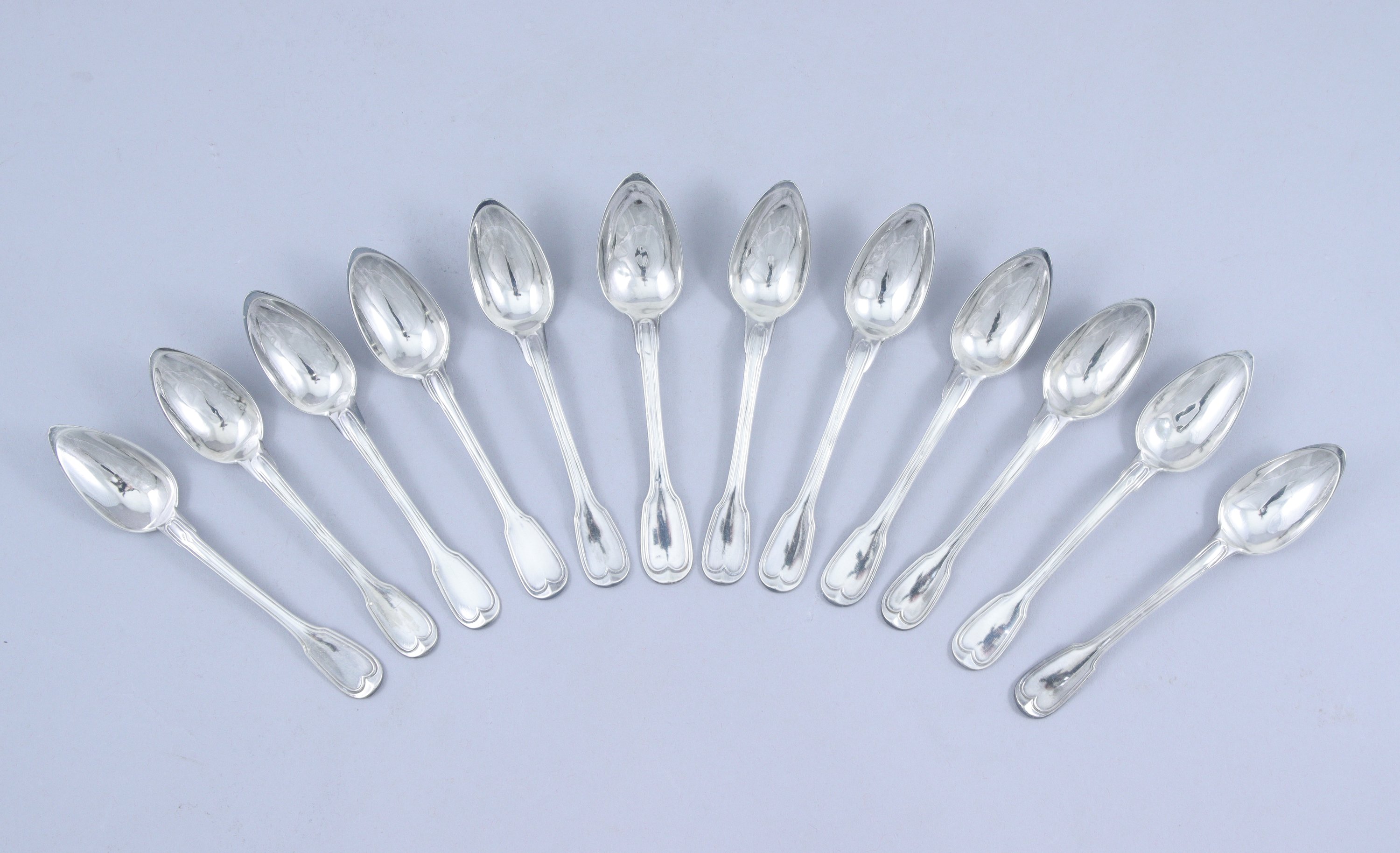 JOINT: DOUZE PETITES CUILLERS en argent, modèle filet contour.Initiales. Poinçon 2è coq, Paris 950è (1809-1818). Poids 280 g.