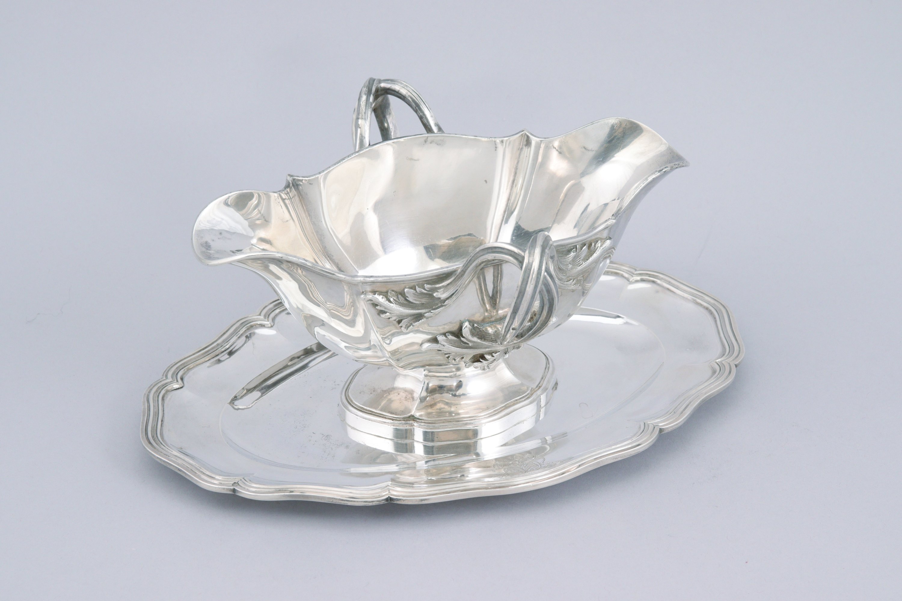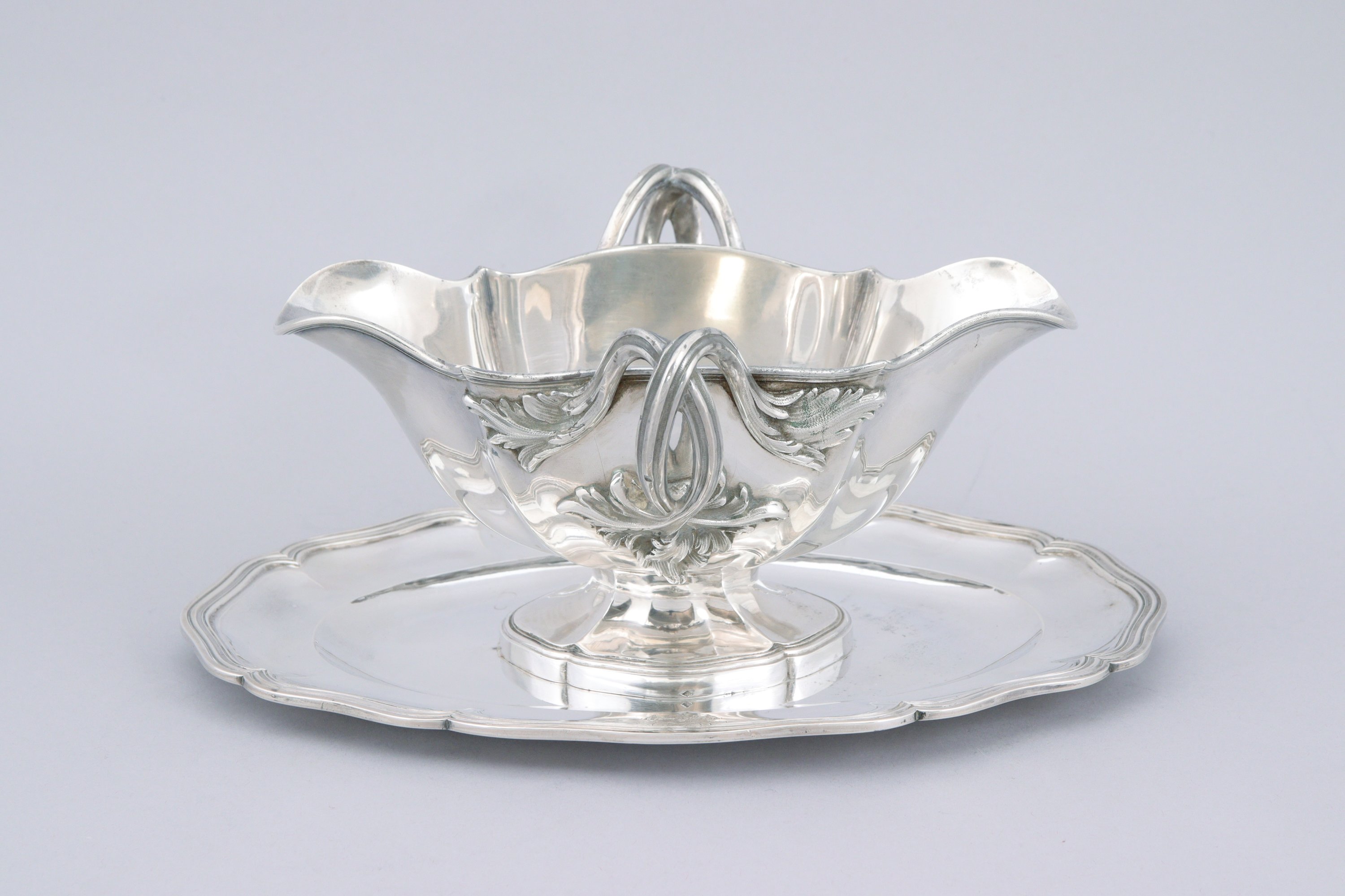 SAUCIÈRE en argent. Modèle rocaille à double anses feuillagées et emmêlées, elle repose sur un plateau fixe à bords contournés. Gravée d'armes d'alliances surmontées d'un heaume.