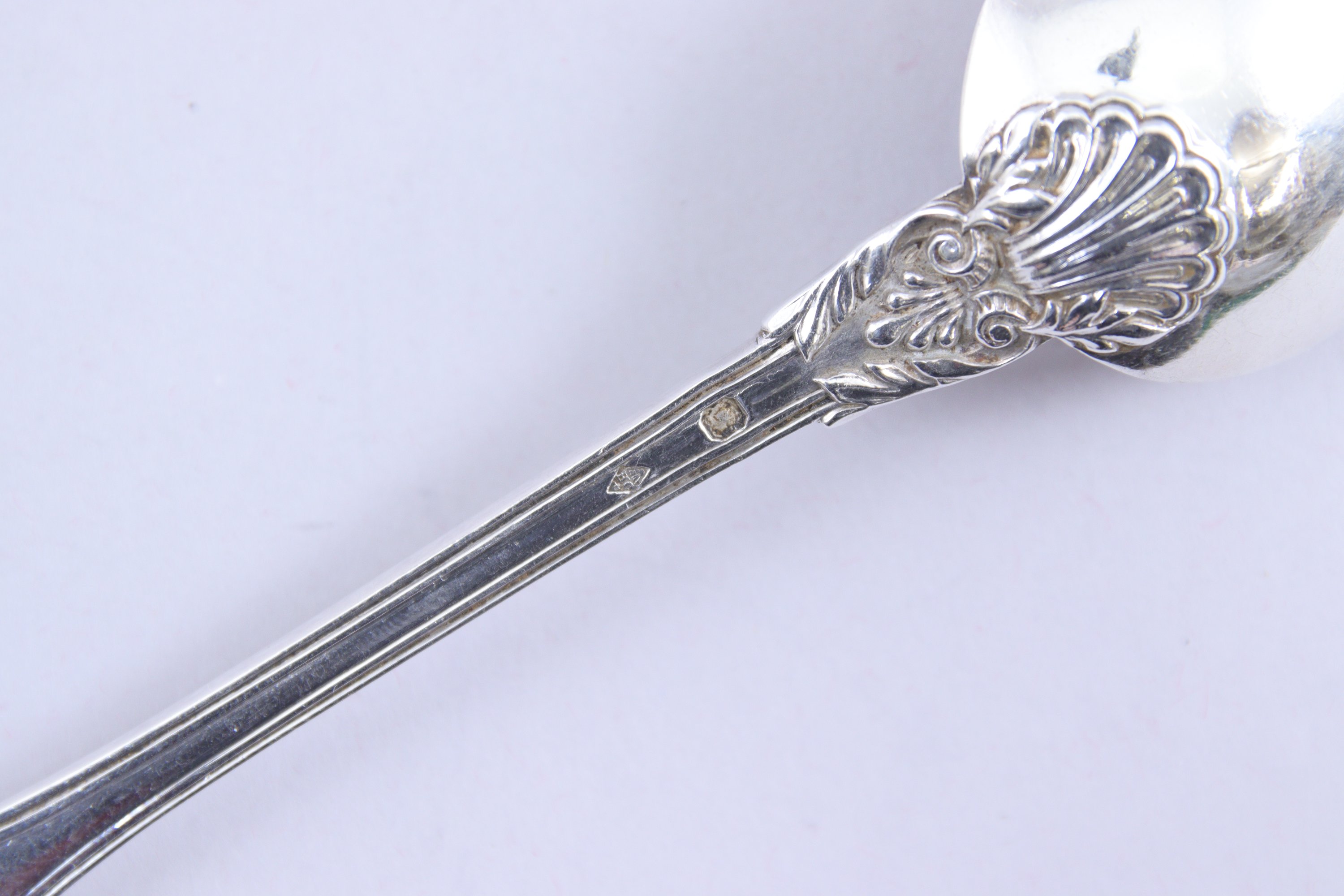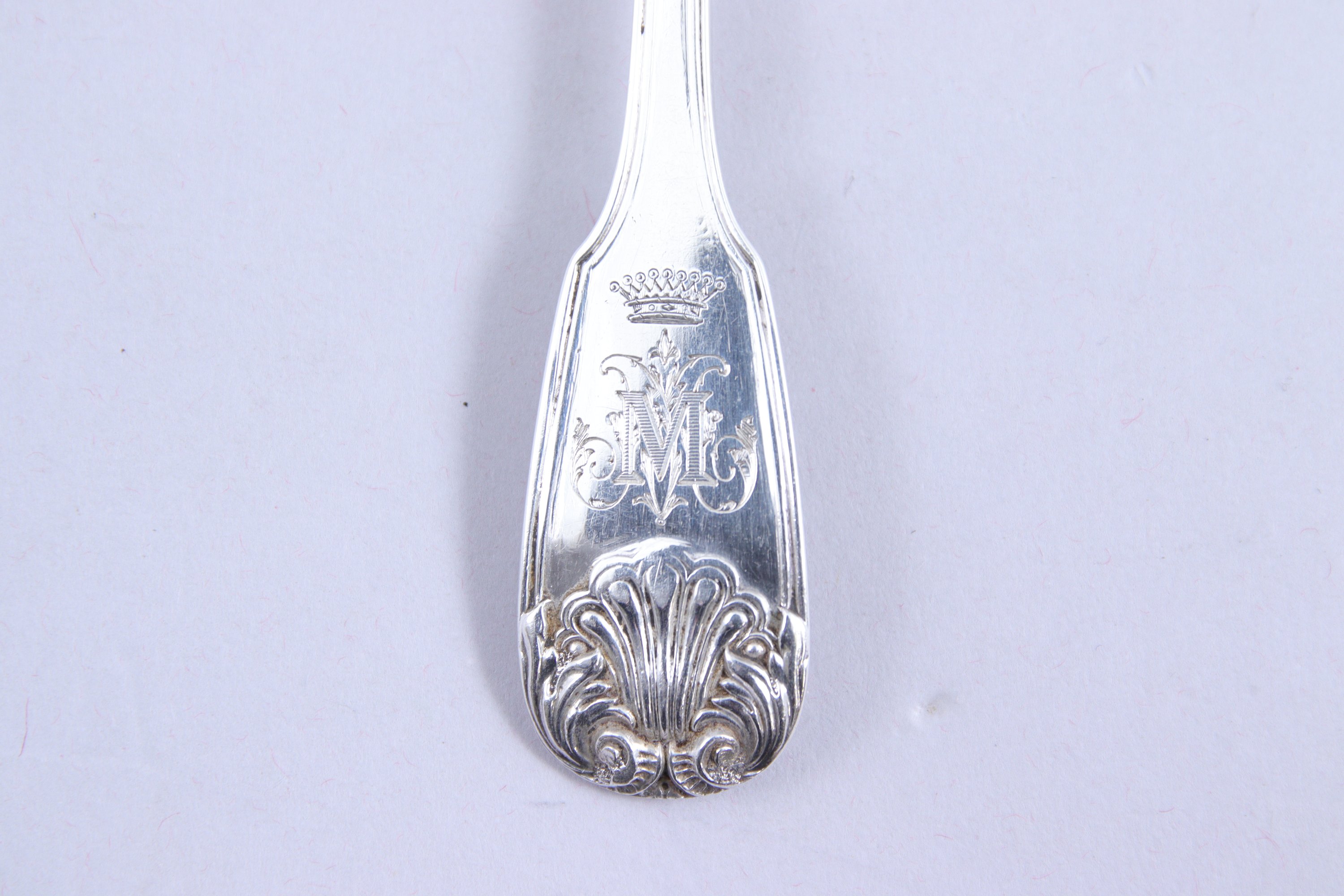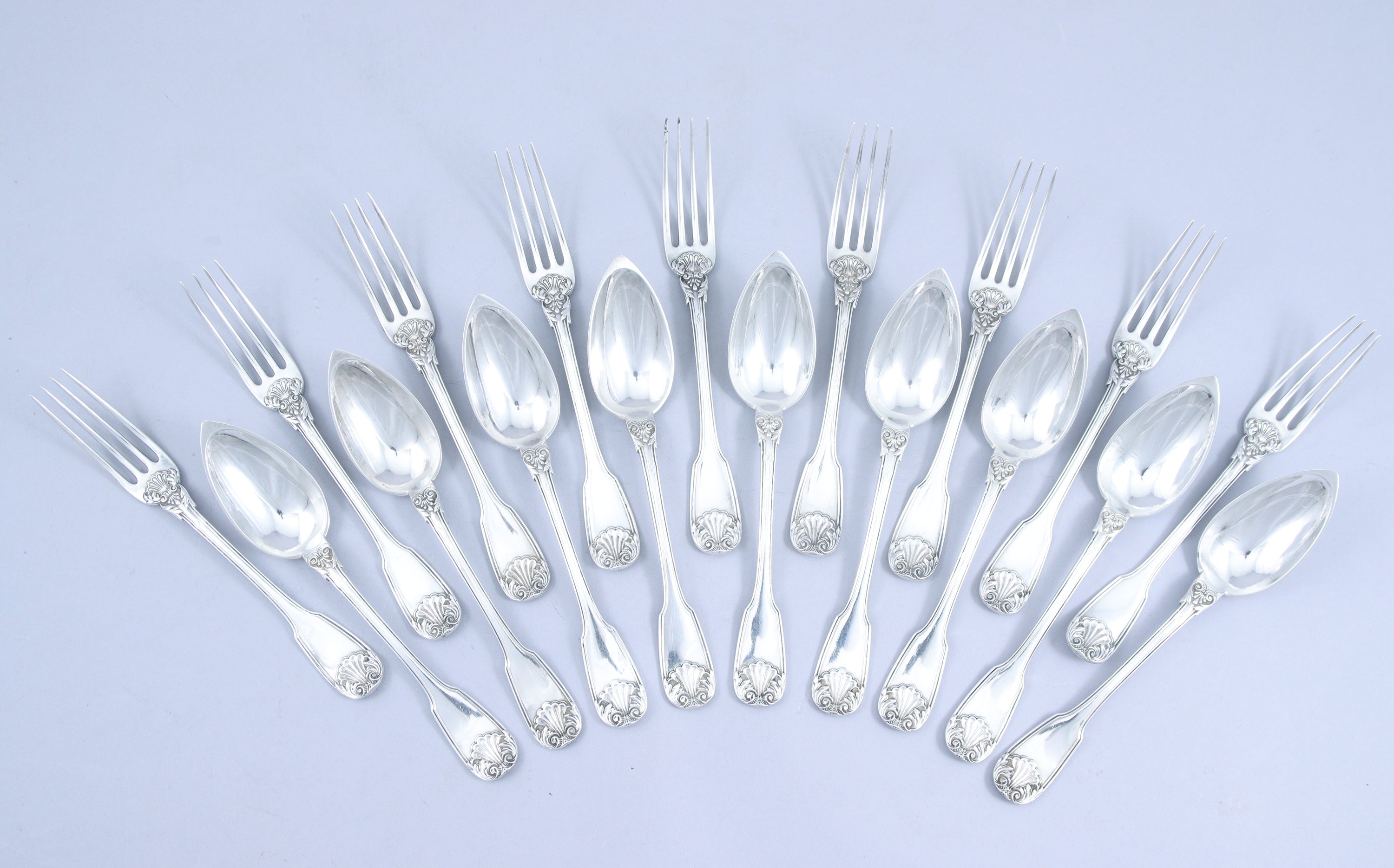 NEUF COUVERTS à dessert en argent. Riche modèle coquilles. Couronne comtale et initiales.